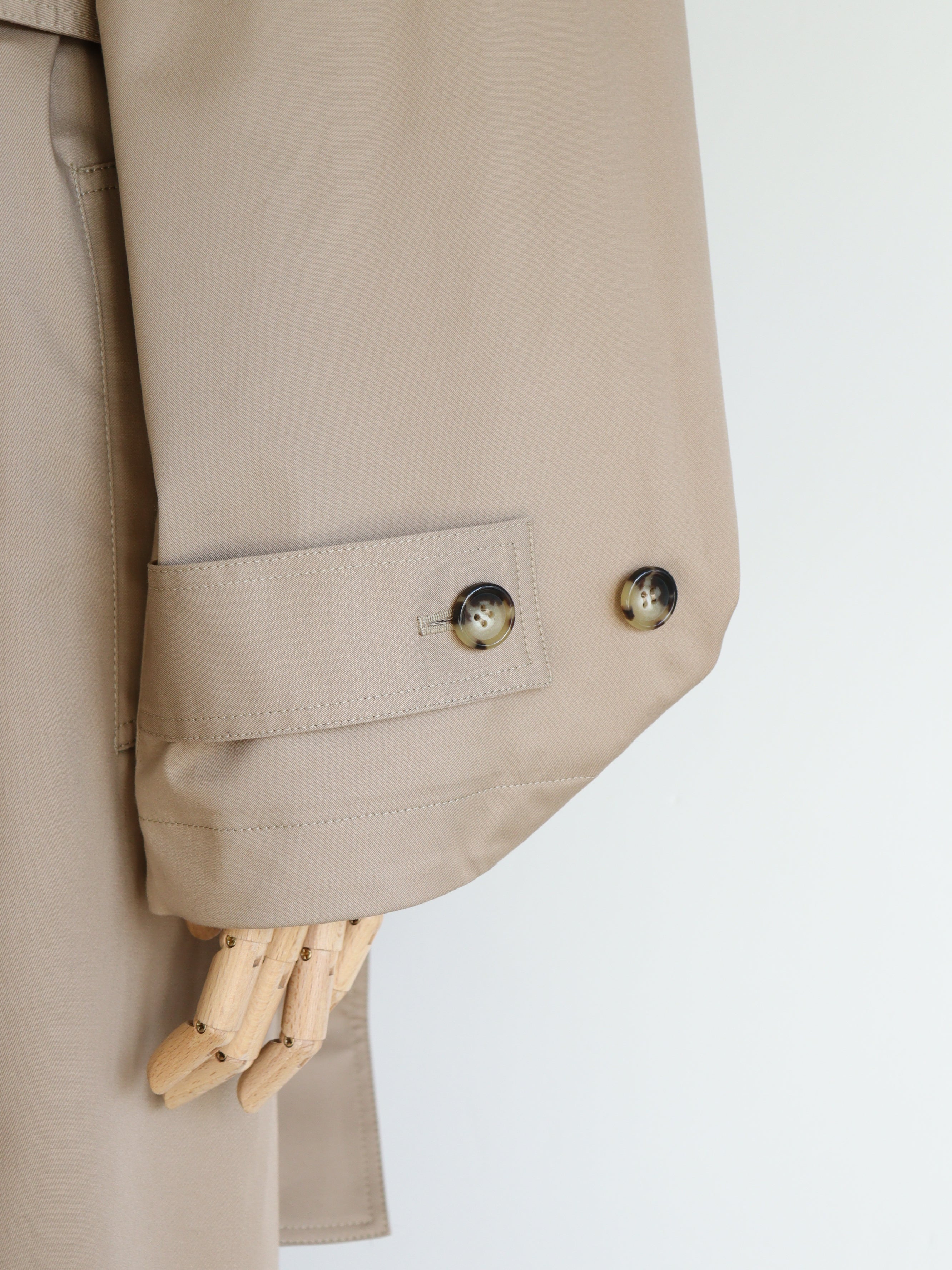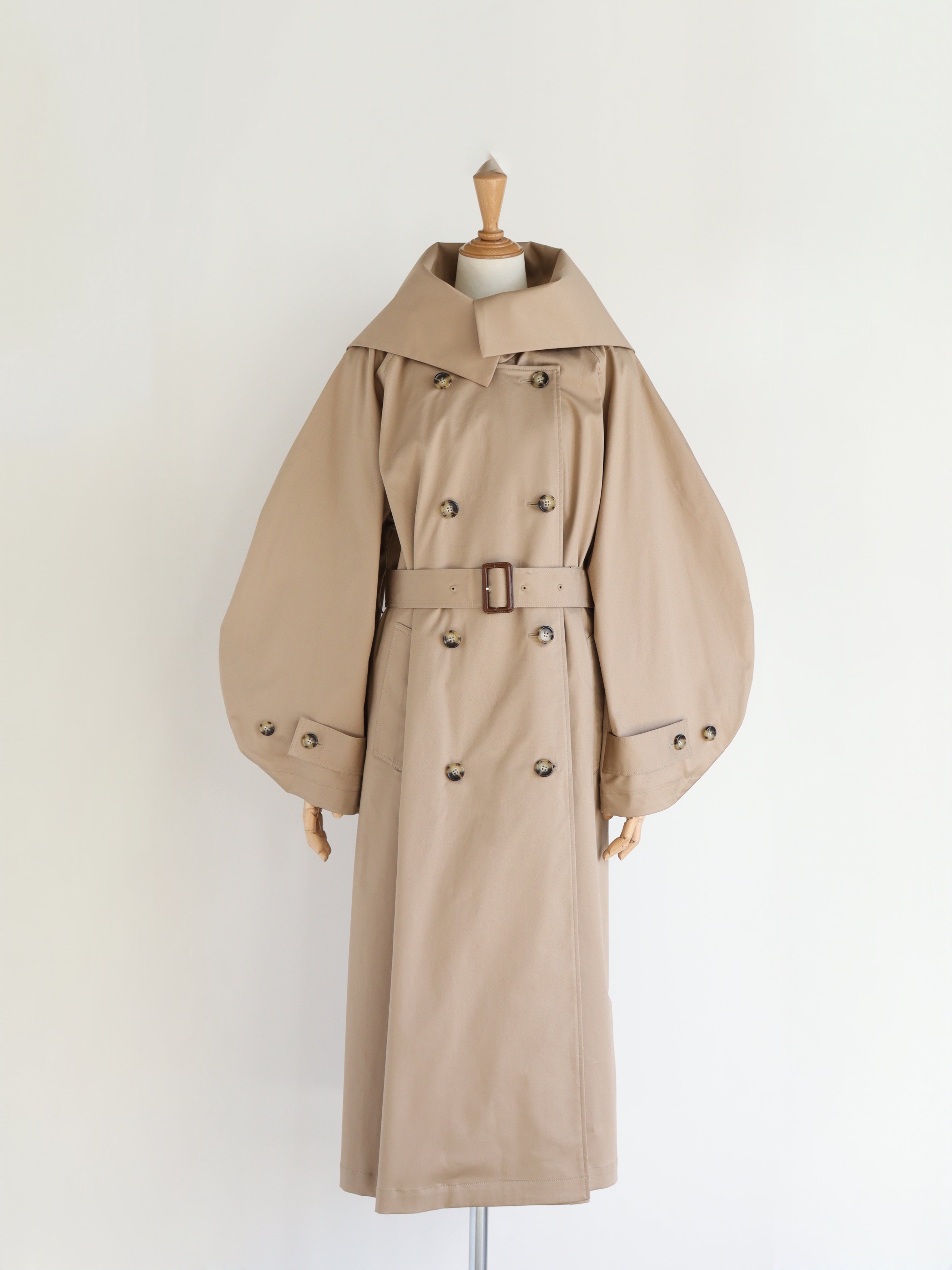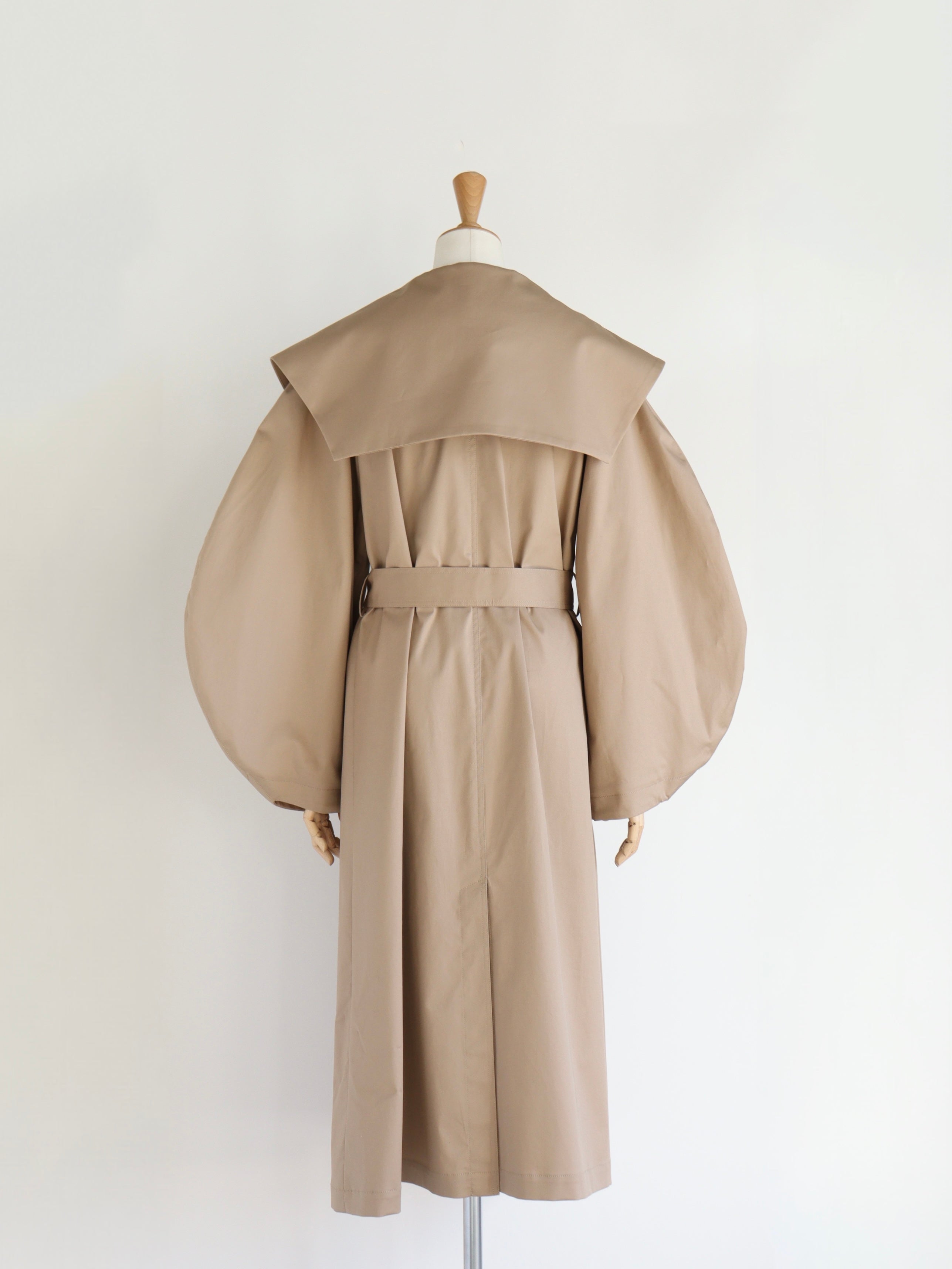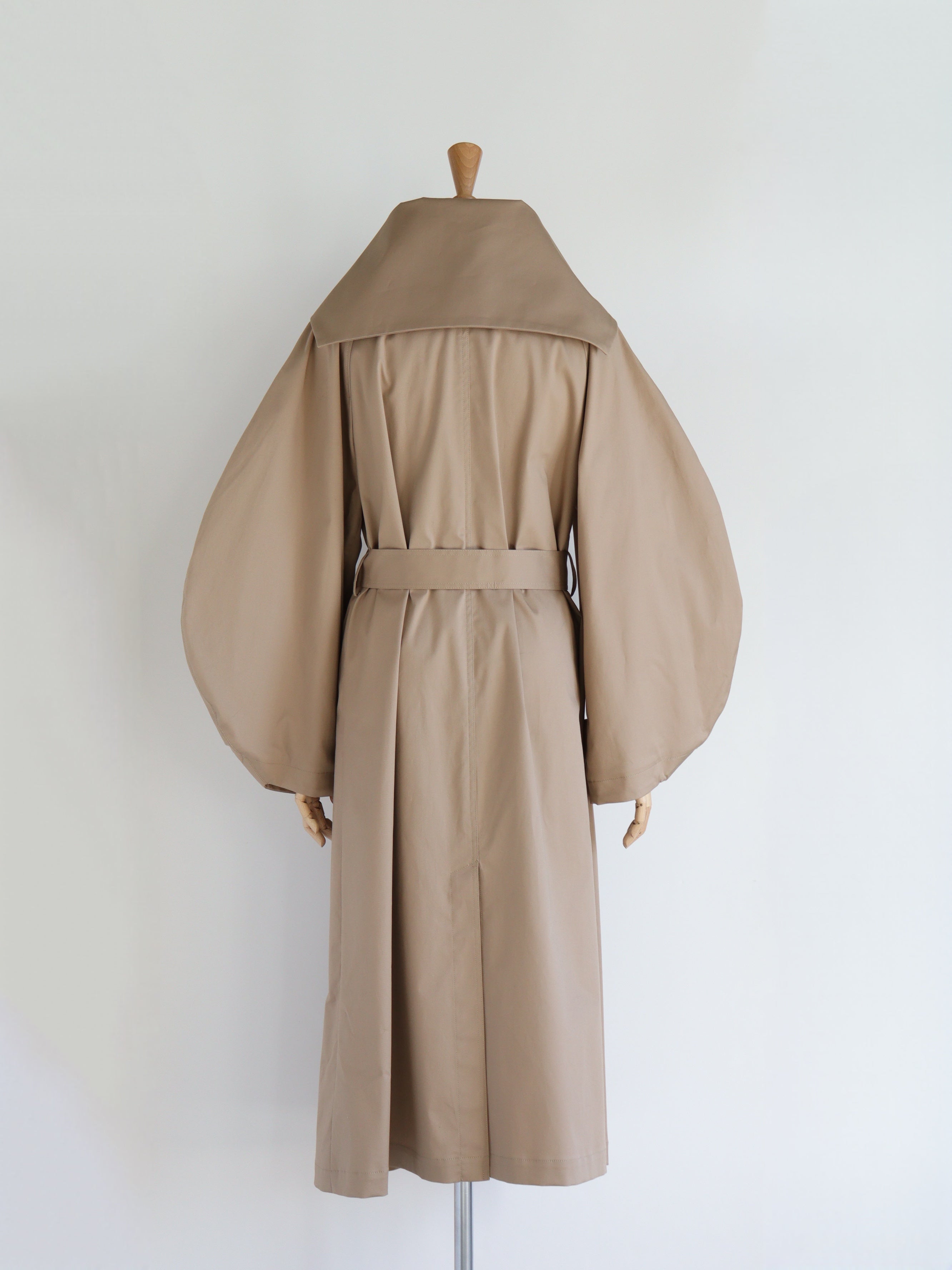 襟元は開襟・セーラーカラー・ボタンを留めてクシュっと立体感を出す3way仕様で、その日の気分やシーンに合わせた表情を楽しめるトレンチコート。三日月のようにボリュームを持たせた立体的な袖は、腕をすっと長く美しく見せてくれます。ラグラン袖なので肩幅を気にせず着られ、ベルトループは2段階に配置することで、身長やバランスに合わせてウエスト位置を高くも低くも調整可能。裏地のない軽やかな仕立てで春夏もさらっと羽織れ、着崩さなくても羽織るだけで自然と様になる一着です。デイリーからセレモニーシーンまで幅広く活躍し、(大阪POPUPでお持ちしたサンプルよりも)カラーは少し濃いめのベージュに変更になりました。