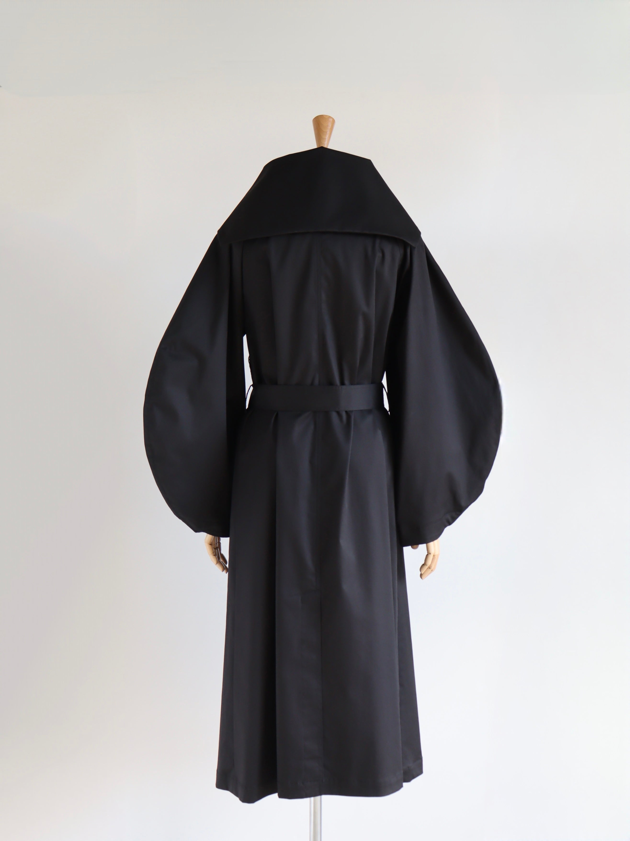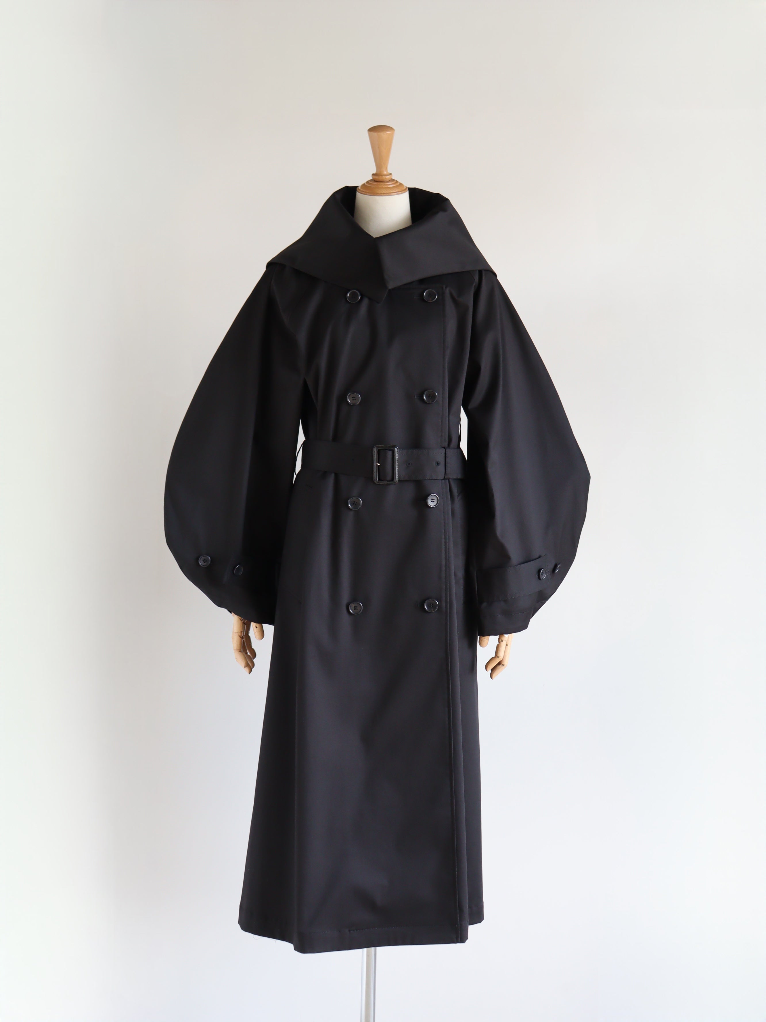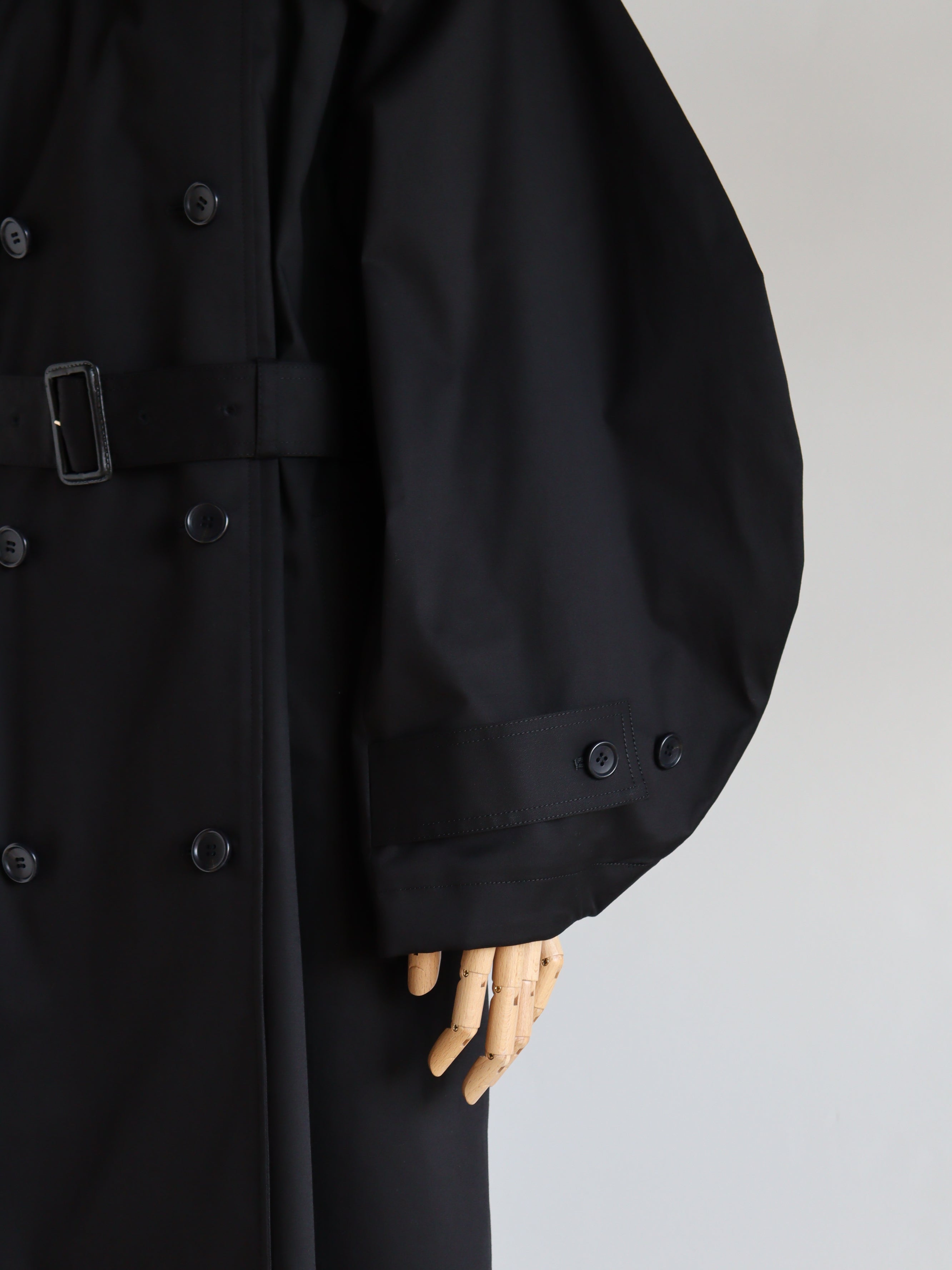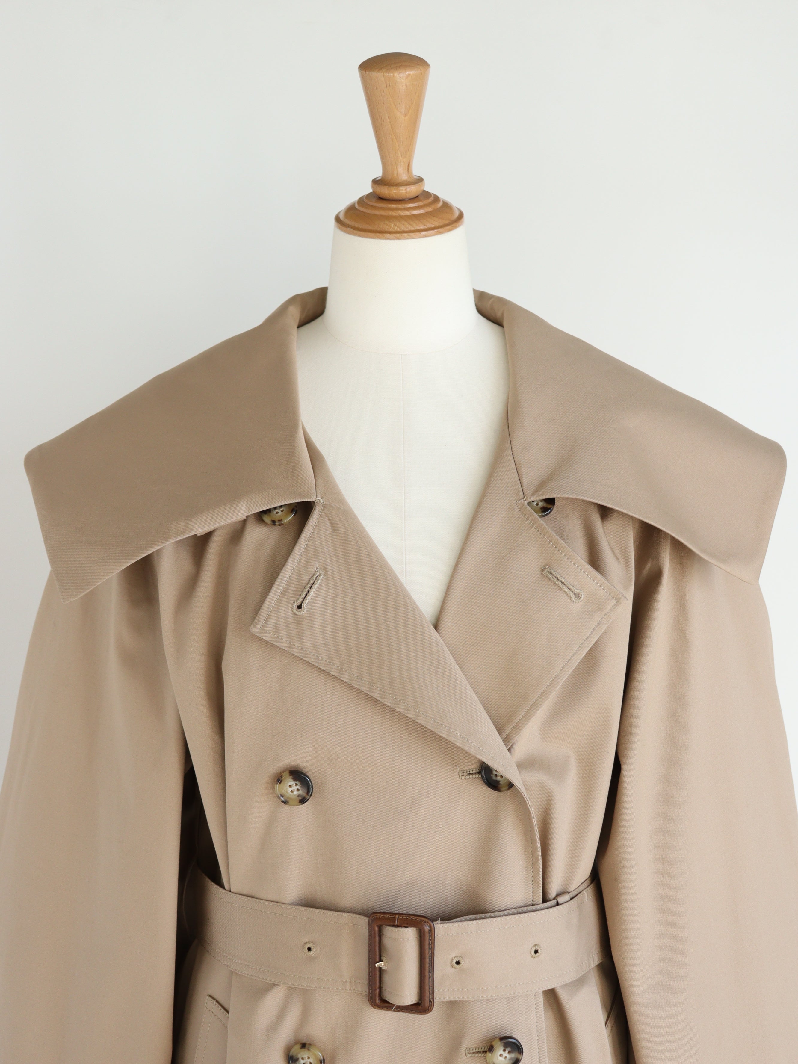 襟元は開襟・セーラーカラー・ボタンを留めてクシュっと立体感を出す3way仕様で、その日の気分やシーンに合わせた表情を楽しめるトレンチコート。三日月のようにボリュームを持たせた立体的な袖は、腕をすっと長く美しく見せてくれます。ラグラン袖なので肩幅を気にせず着られ、ベルトループは2段階に配置することで、身長やバランスに合わせてウエスト位置を高くも低くも調整可能。裏地のない軽やかな仕立てで春夏もさらっと羽織れ、着崩さなくても羽織るだけで自然と様になる一着です。デイリーからセレモニーシーンまで幅広く活躍し、(大阪POPUPでお持ちしたサンプルよりも)カラーは少し濃いめのベージュに変更になりました。