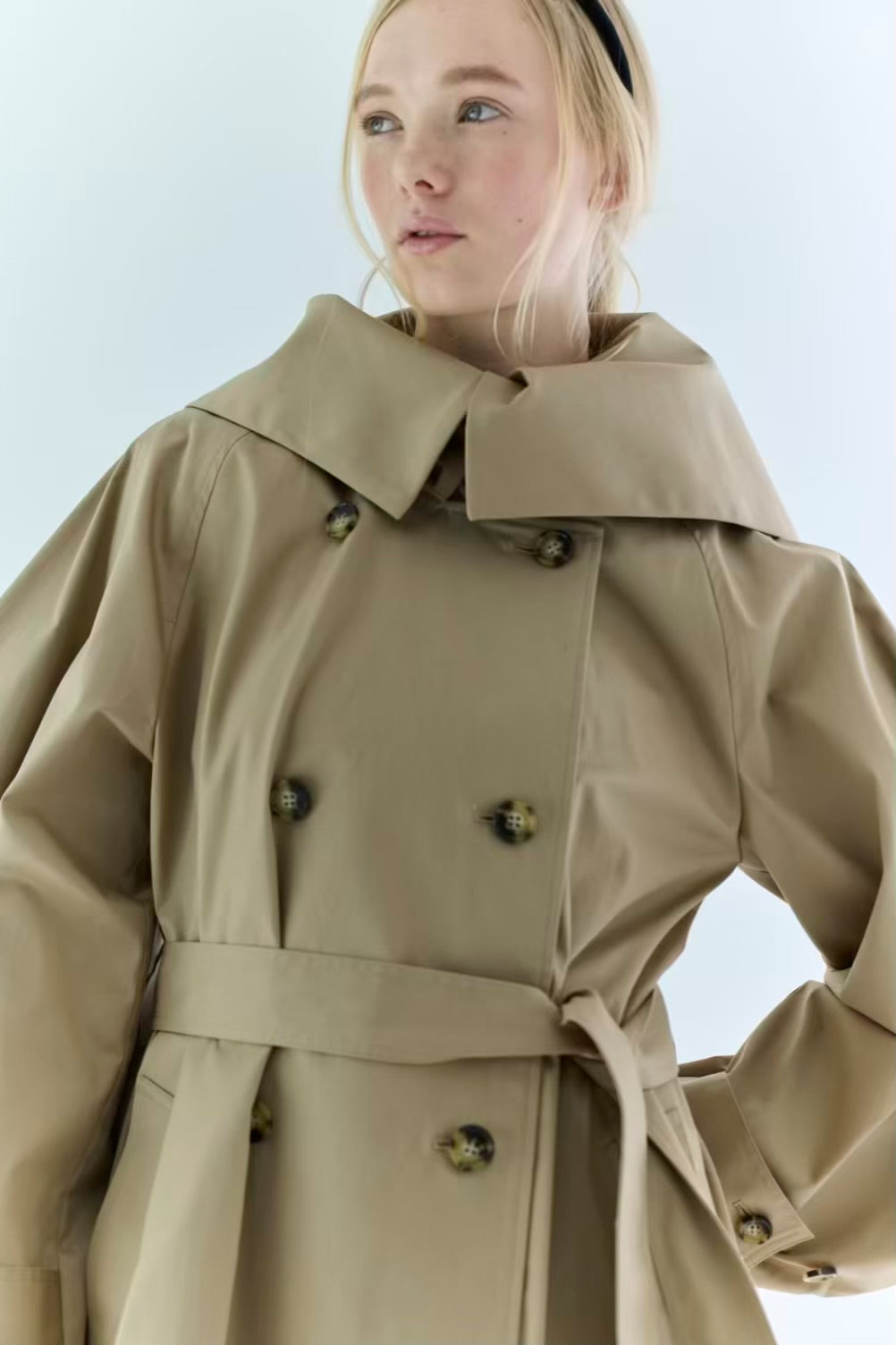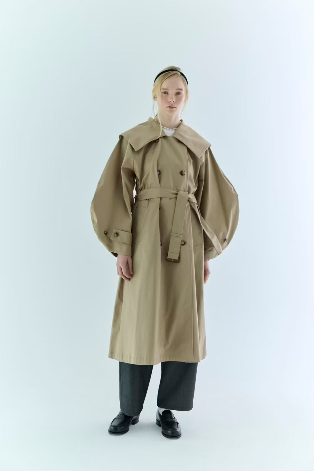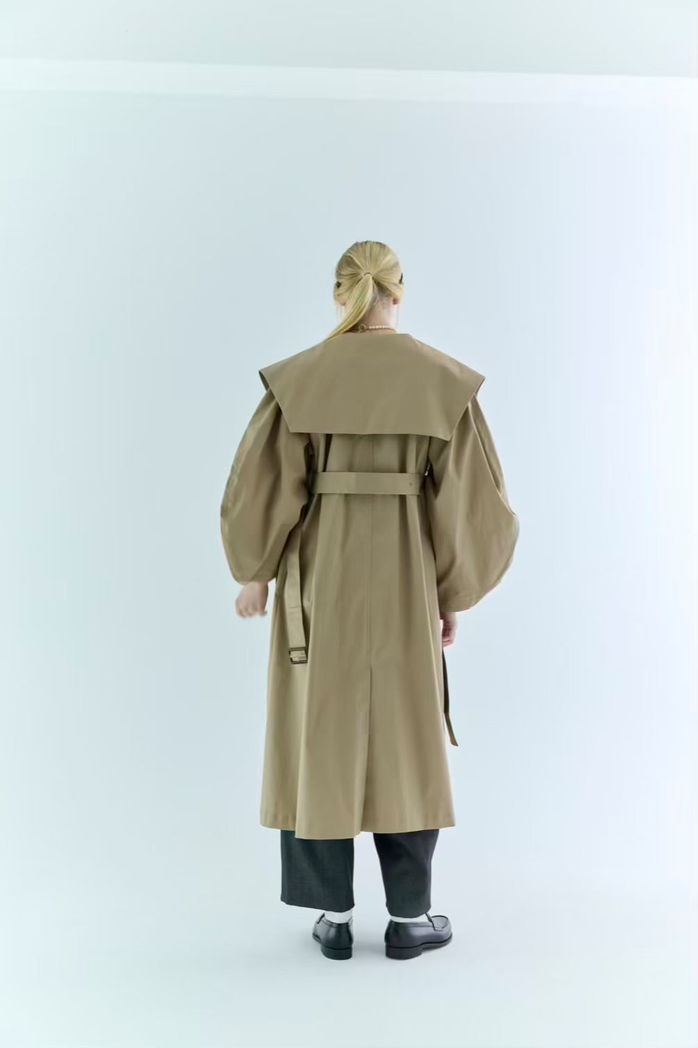 襟元は開襟・セーラーカラー・ボタンを留めてクシュっと立体感を出す3way仕様で、その日の気分やシーンに合わせた表情を楽しめるトレンチコート。三日月のようにボリュームを持たせた立体的な袖は、腕をすっと長く美しく見せてくれます。ラグラン袖なので肩幅を気にせず着られ、ベルトループは2段階に配置することで、身長やバランスに合わせてウエスト位置を高くも低くも調整可能。裏地のない軽やかな仕立てで春夏もさらっと羽織れ、着崩さなくても羽織るだけで自然と様になる一着です。デイリーからセレモニーシーンまで幅広く活躍し、(大阪POPUPでお持ちしたサンプルよりも)カラーは少し濃いめのベージュに変更になりました。