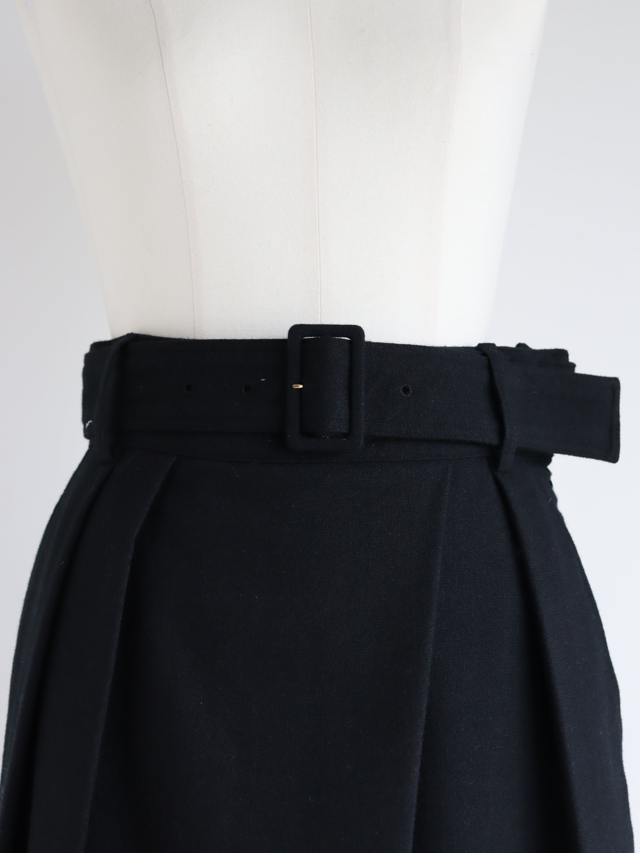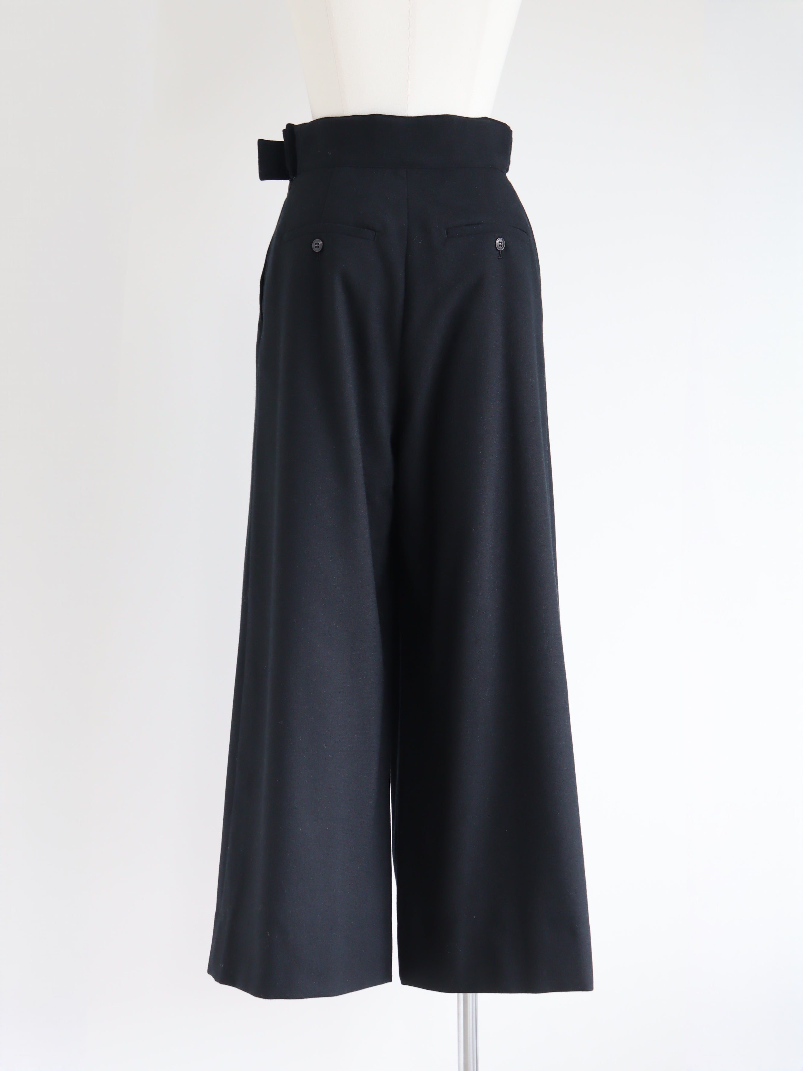 ワイドシルエットのラップパンツ。共布のベルトのバックルがポイントになります。