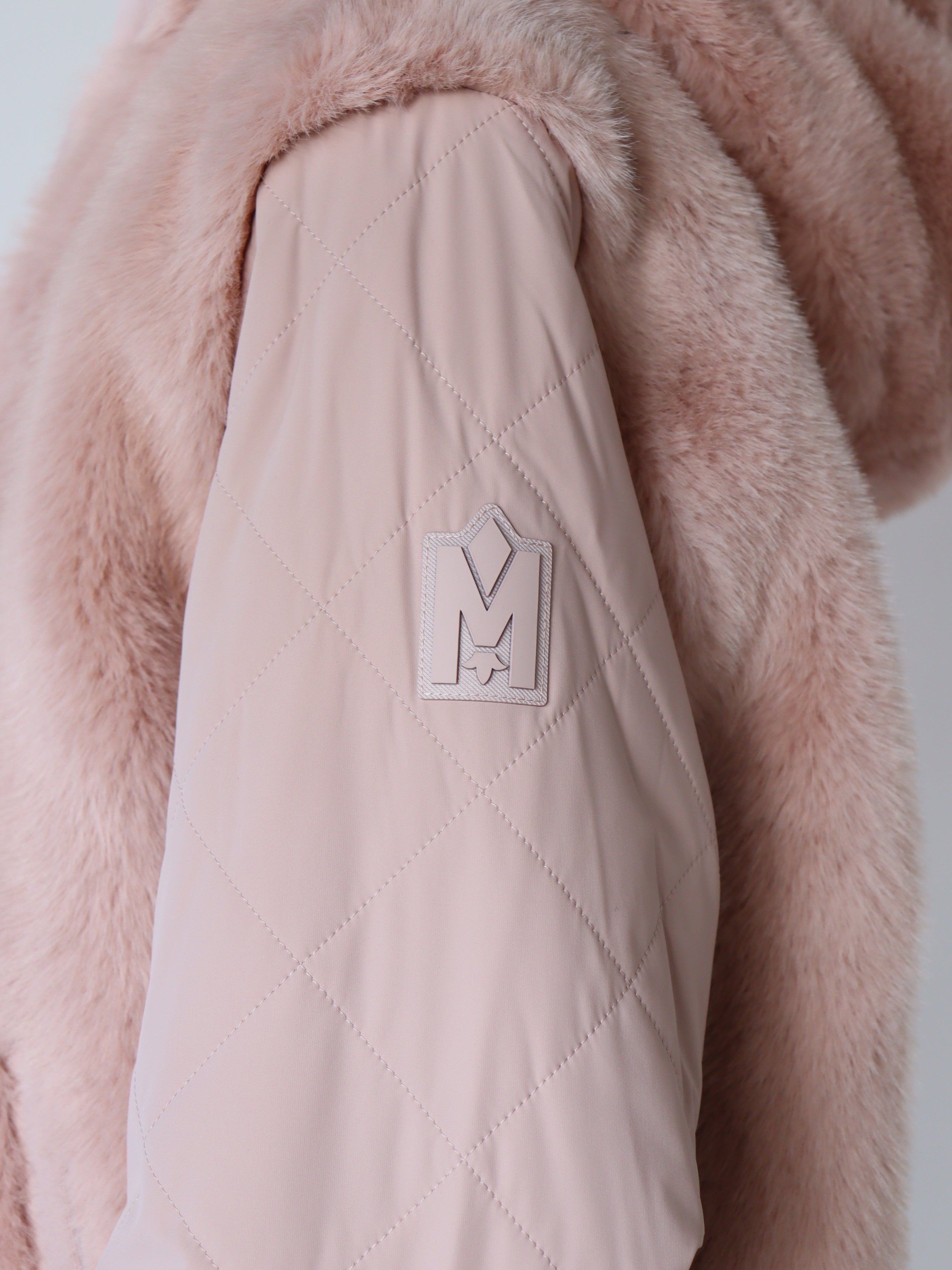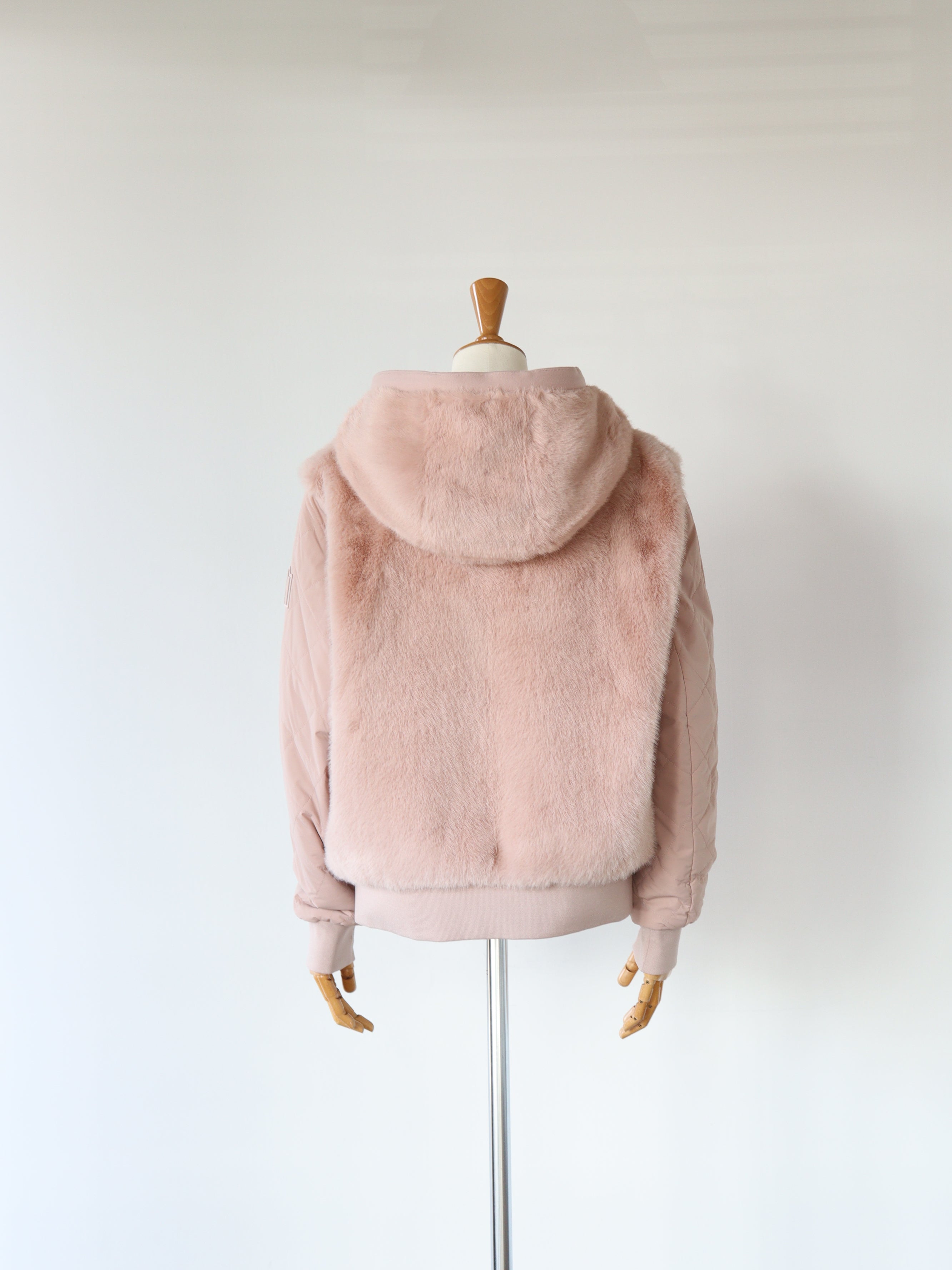 シリコン素材のロゴ付きのパーカータイプとダイヤモンドキルトのブランドロゴを備えたエコーファータイプのリバーシブルで着用できます。