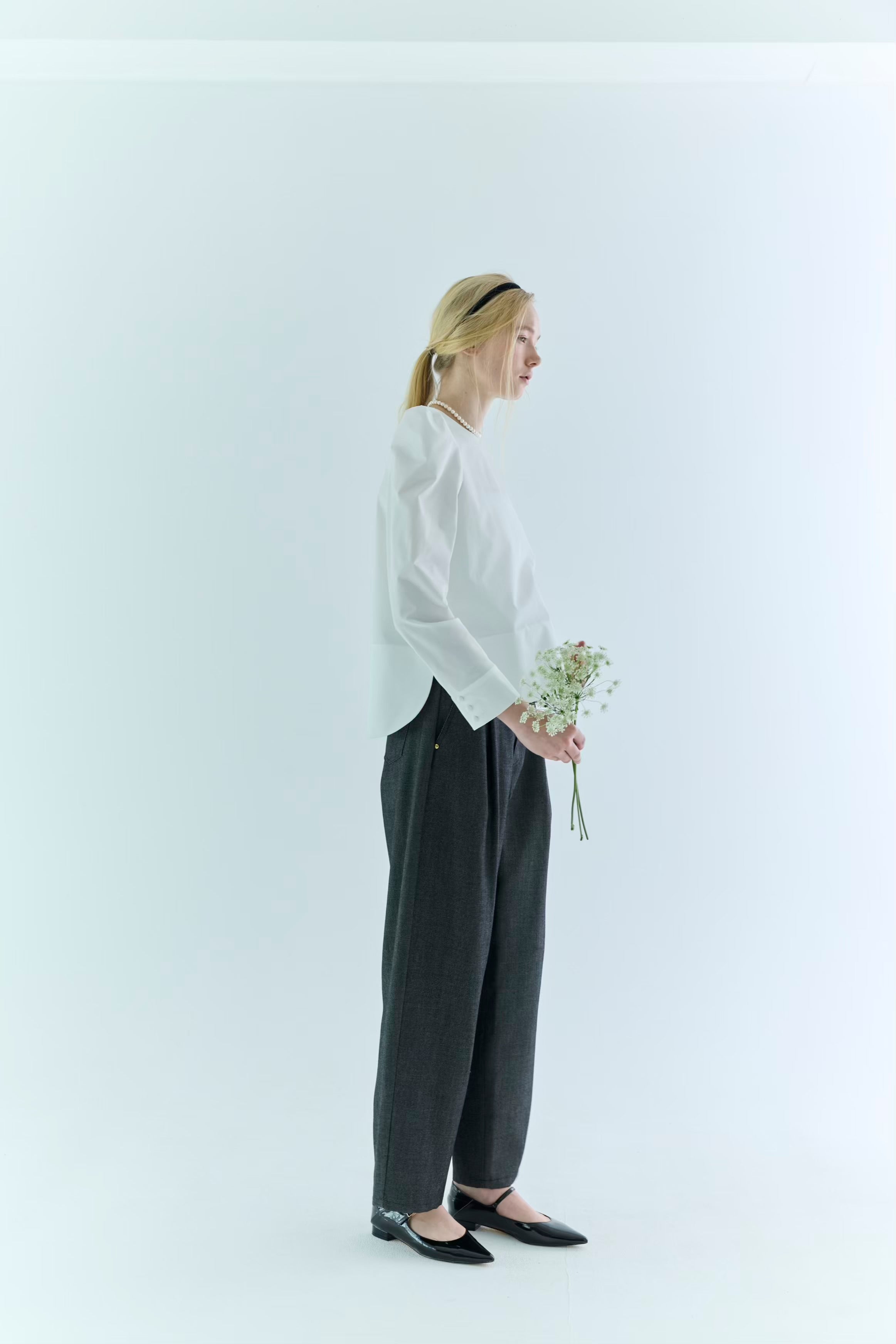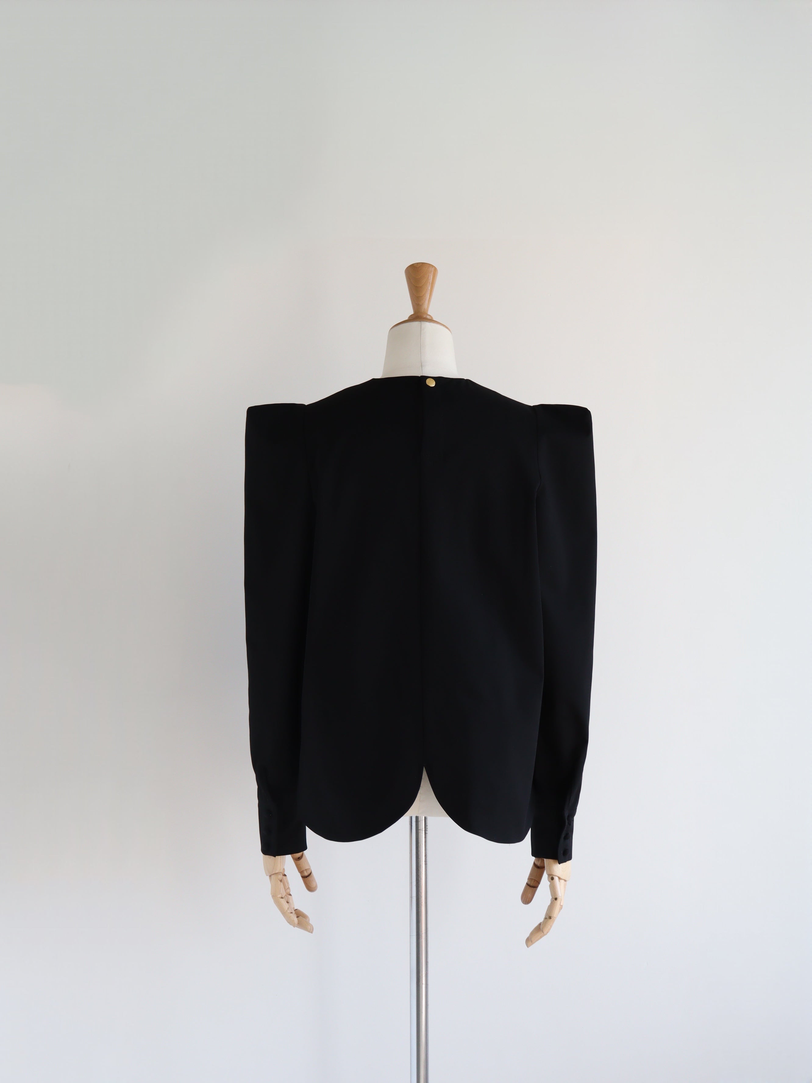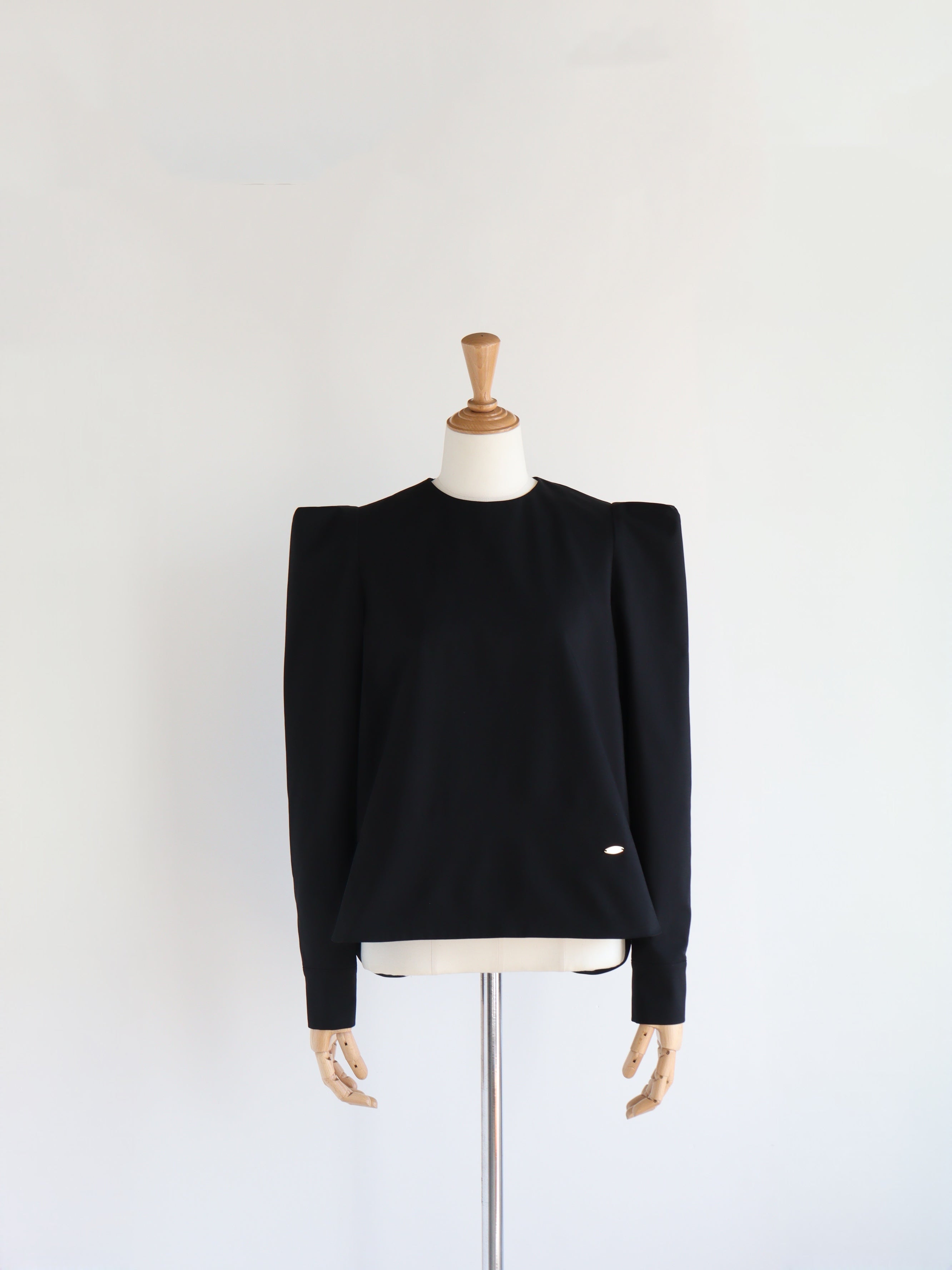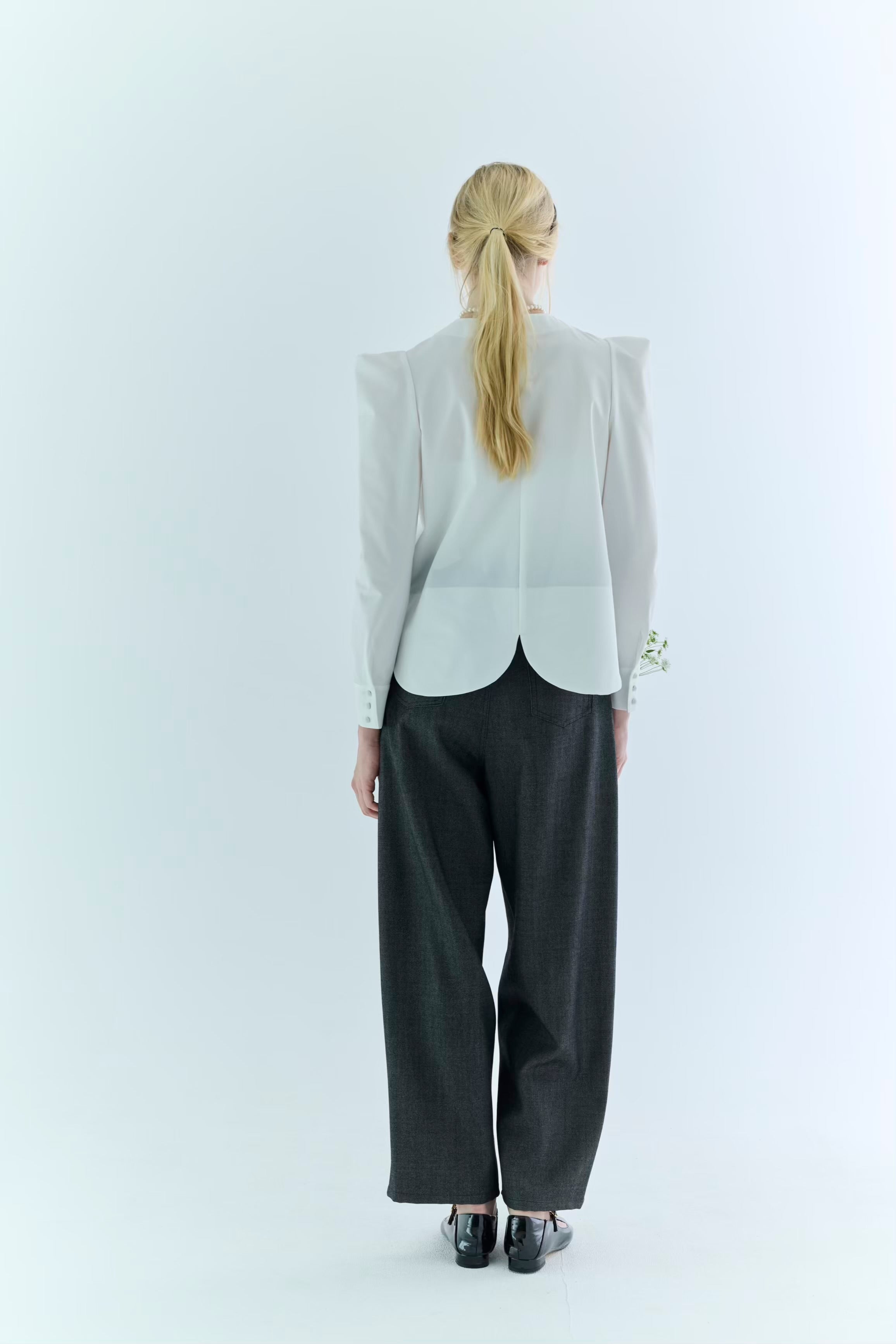 ストレッチの効いたブラウス生地で、きちんと感と、動きやすさを両立したブラウス。バックスタイルの大きなスカラップが雲のように見えるデザインで、どの角度から見ても可愛いブラウスです。