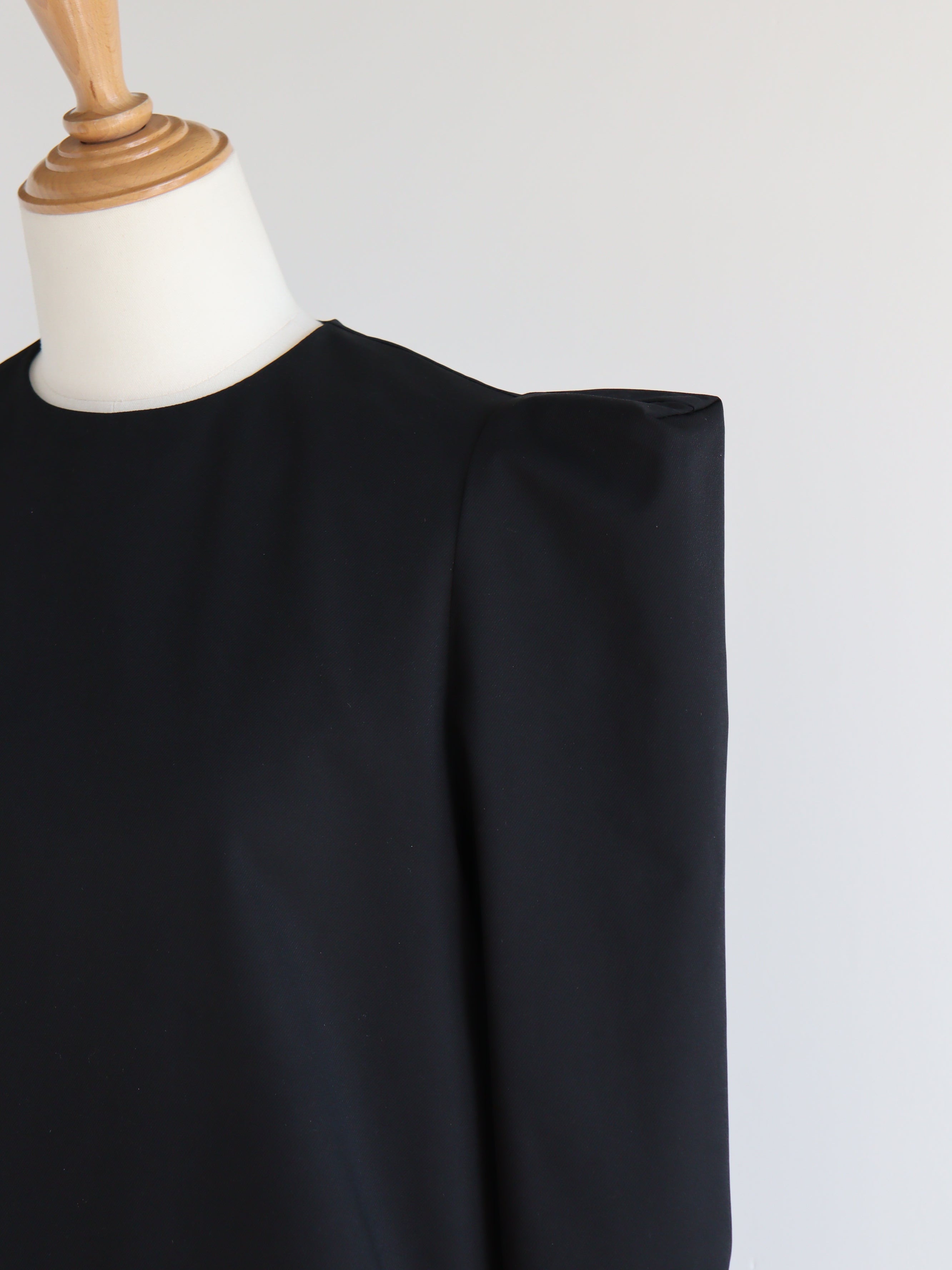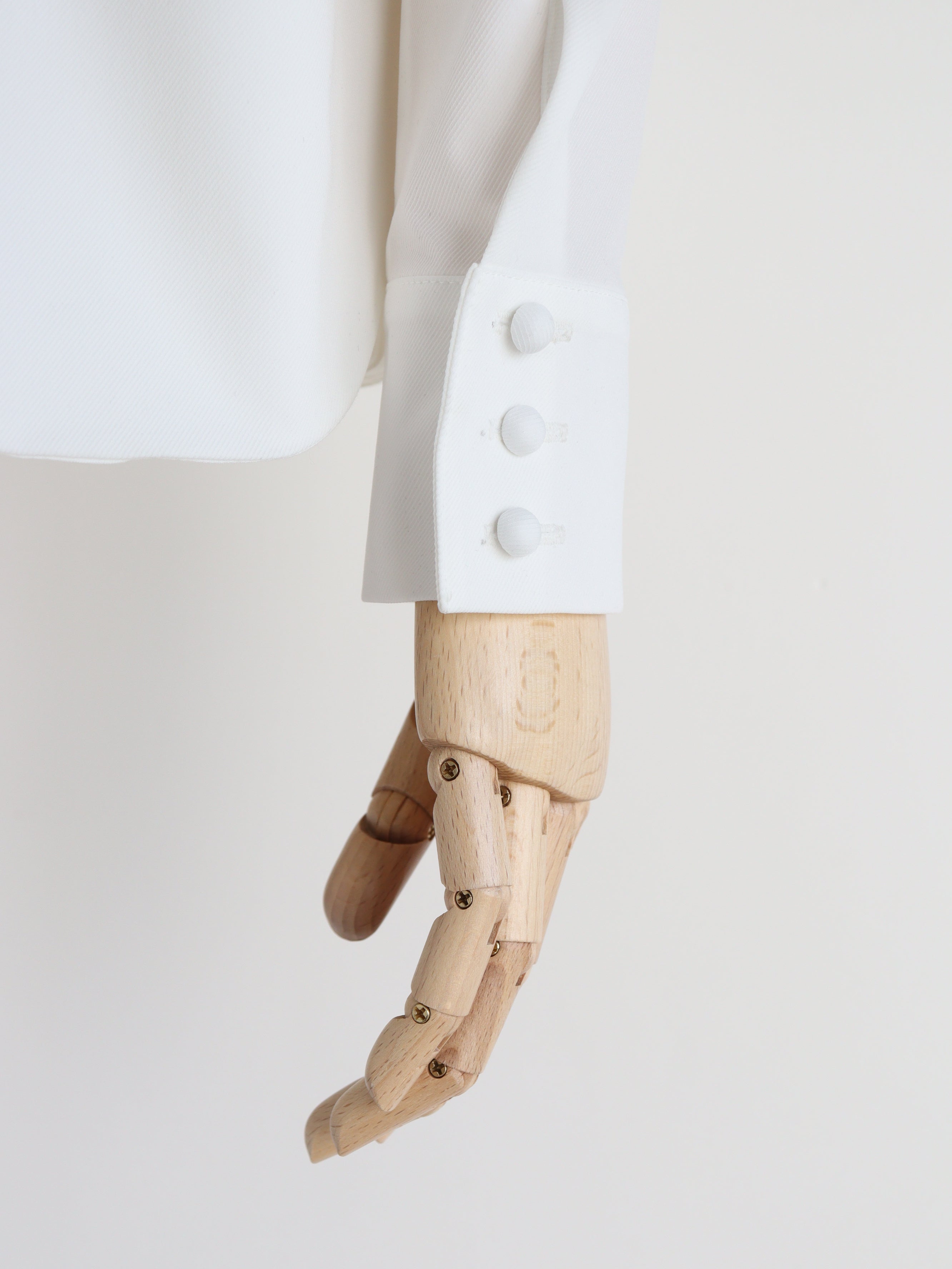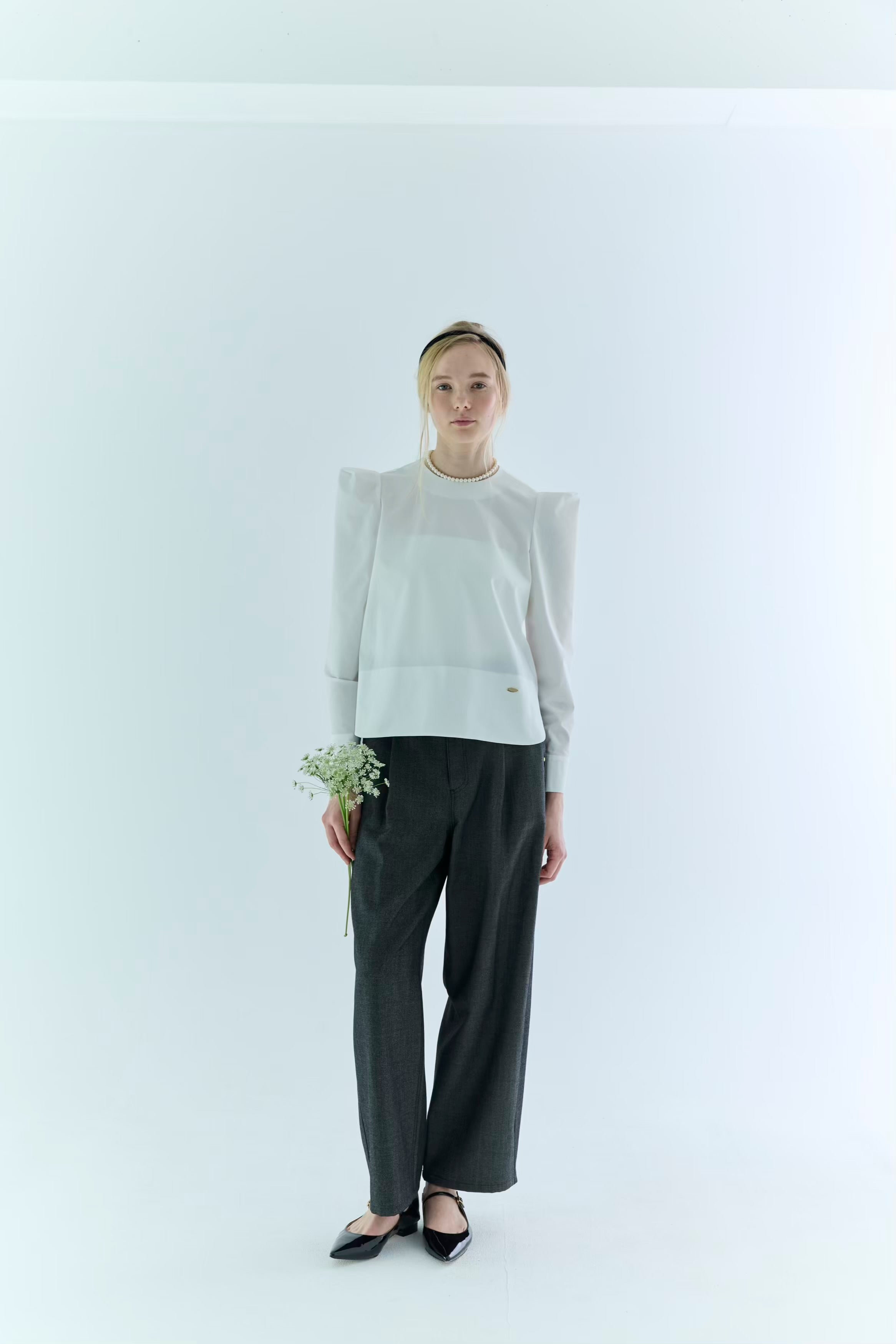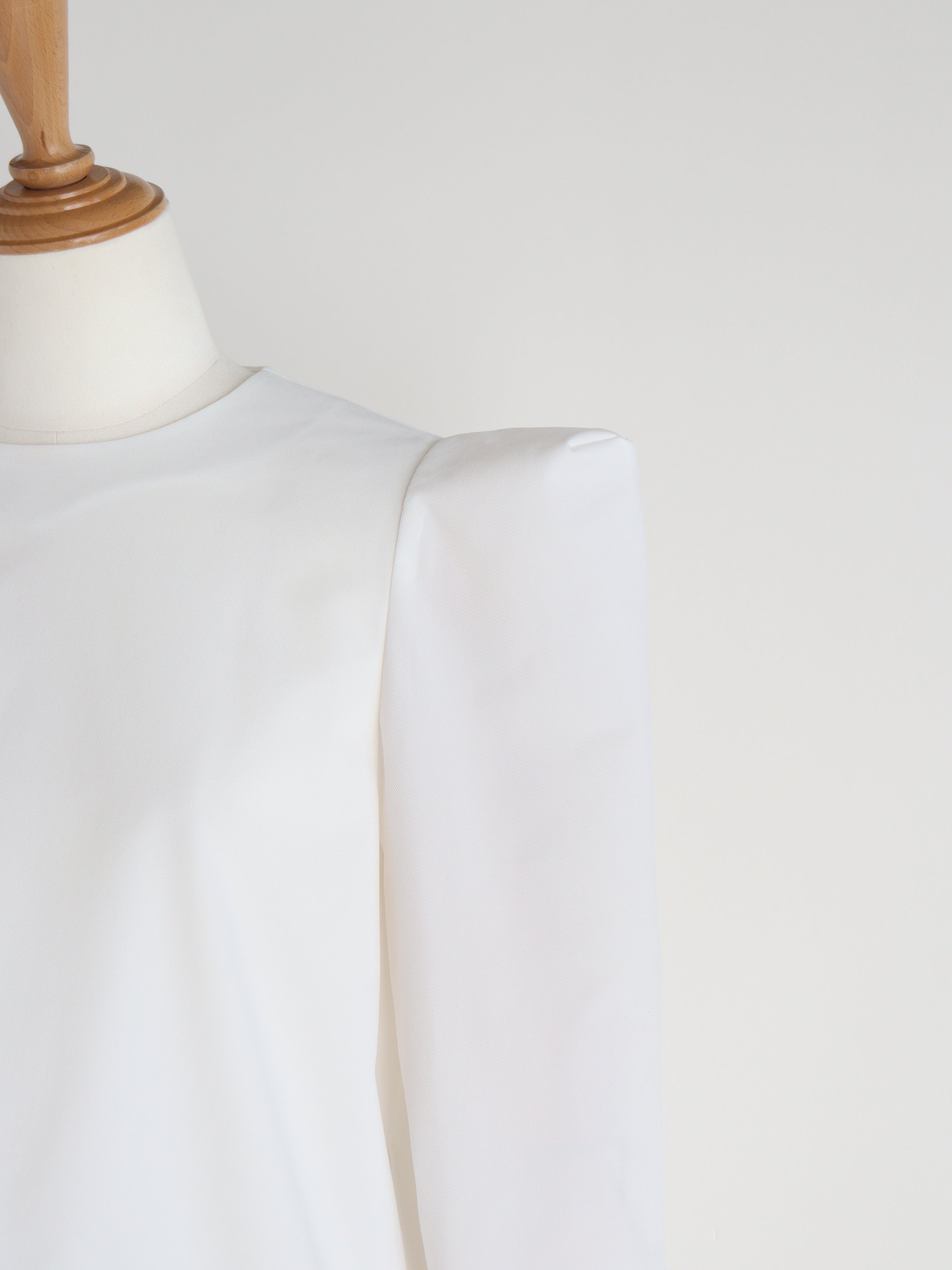 ストレッチの効いたブラウス生地で、きちんと感と、動きやすさを両立したブラウス。バックスタイルの大きなスカラップが雲のように見えるデザインで、どの角度から見ても可愛いブラウスです。