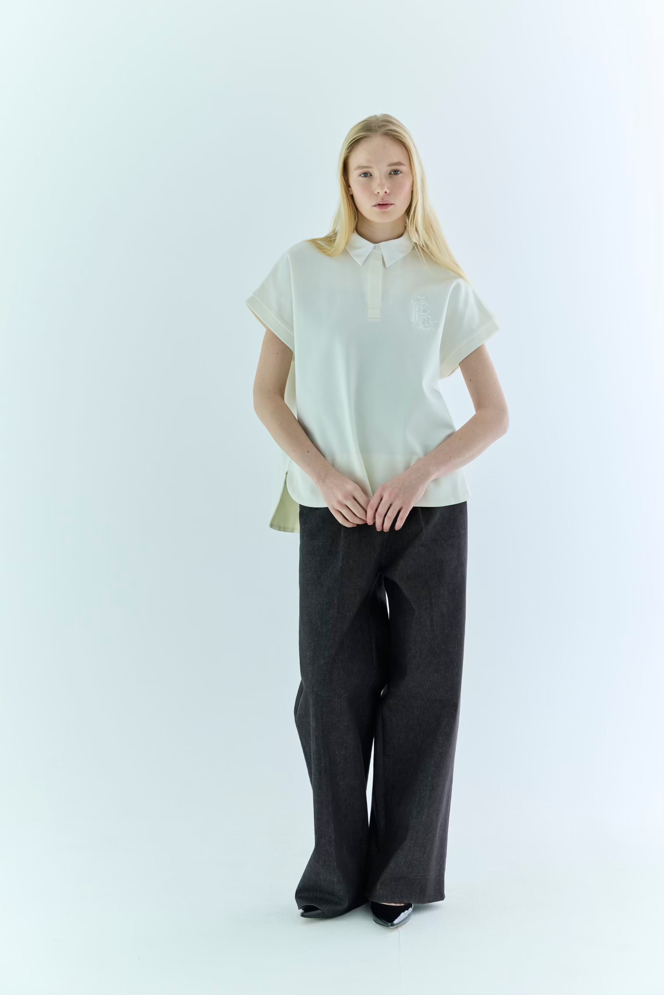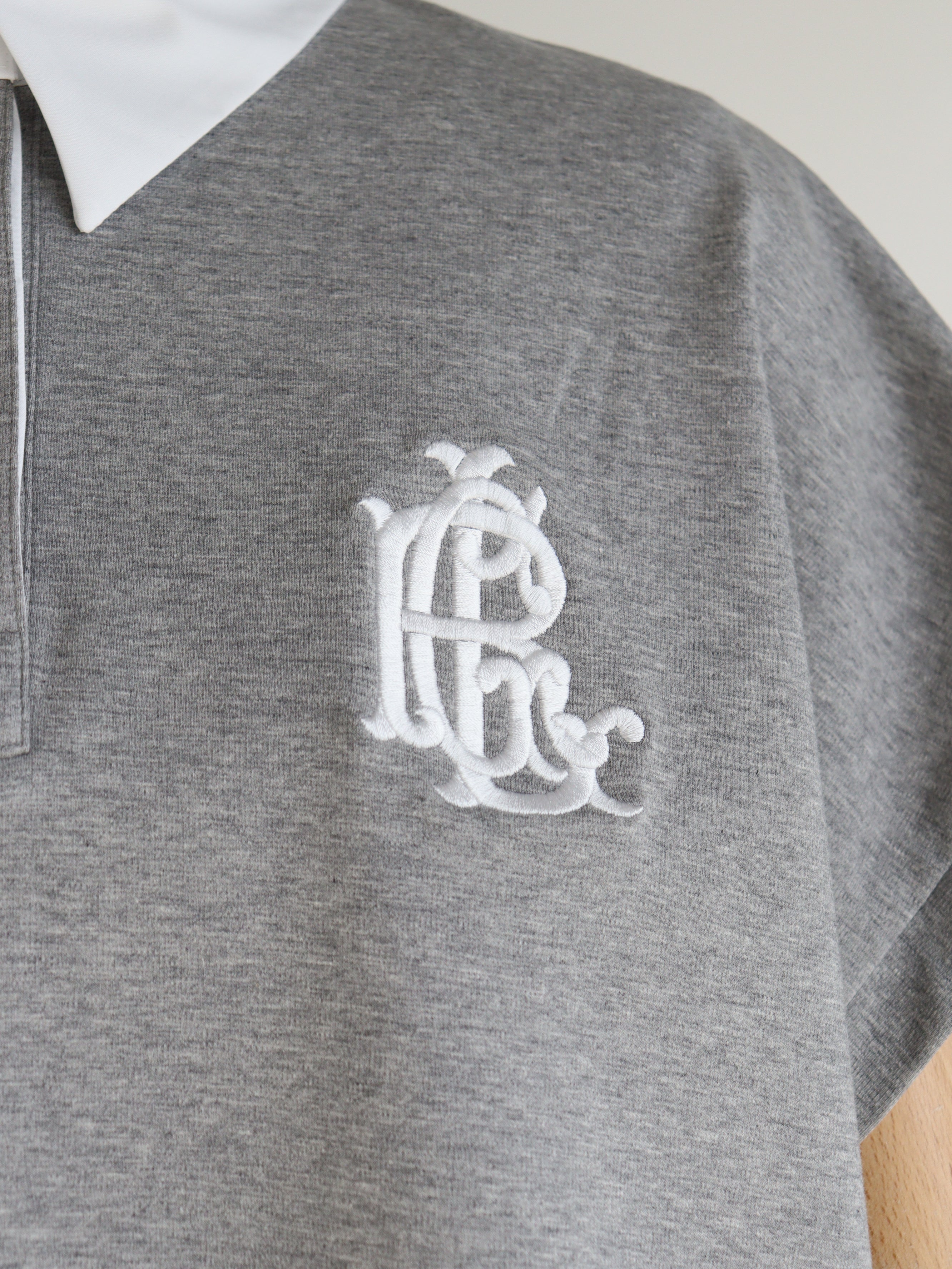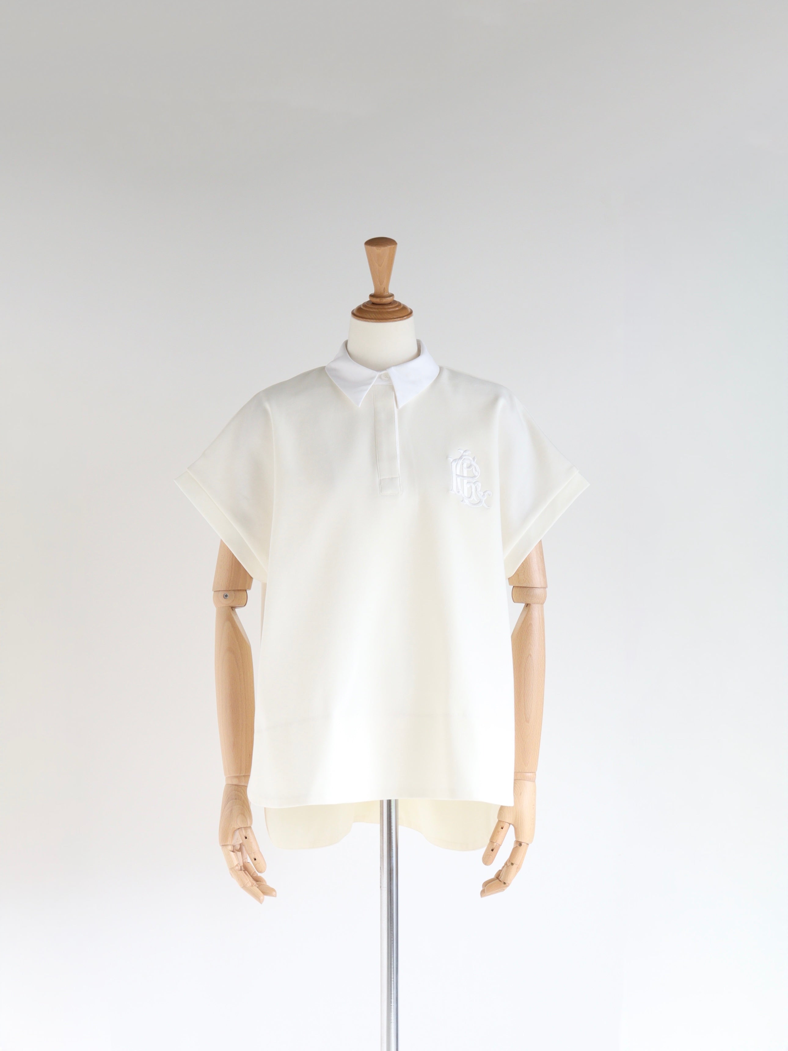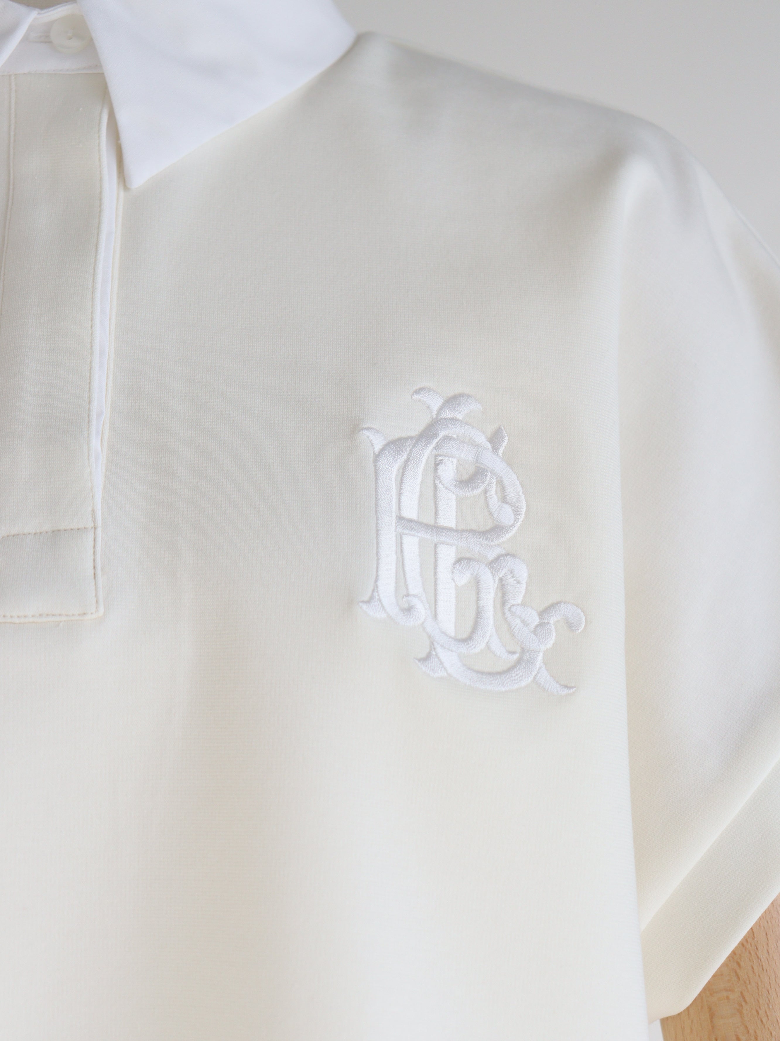 カジュアルになりがちなポロシャツですが、綺麗めなポンチ素材を使用し、モノグラムの刺繍を入れることで、上品に取り入れられるアイテムになりました。少し肩にかかるフレンチスリーブが、二の腕をそっとカバーしてくれます。