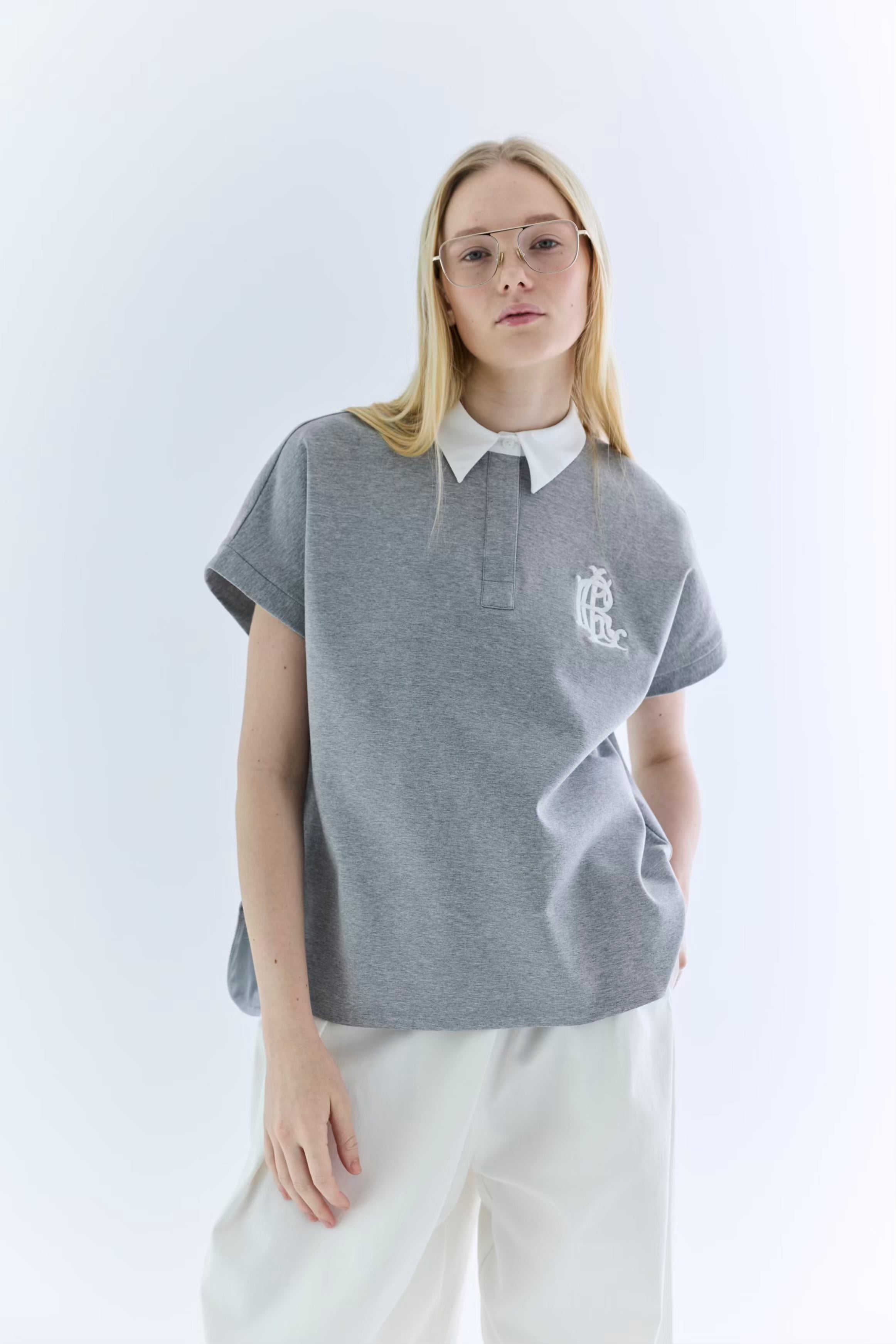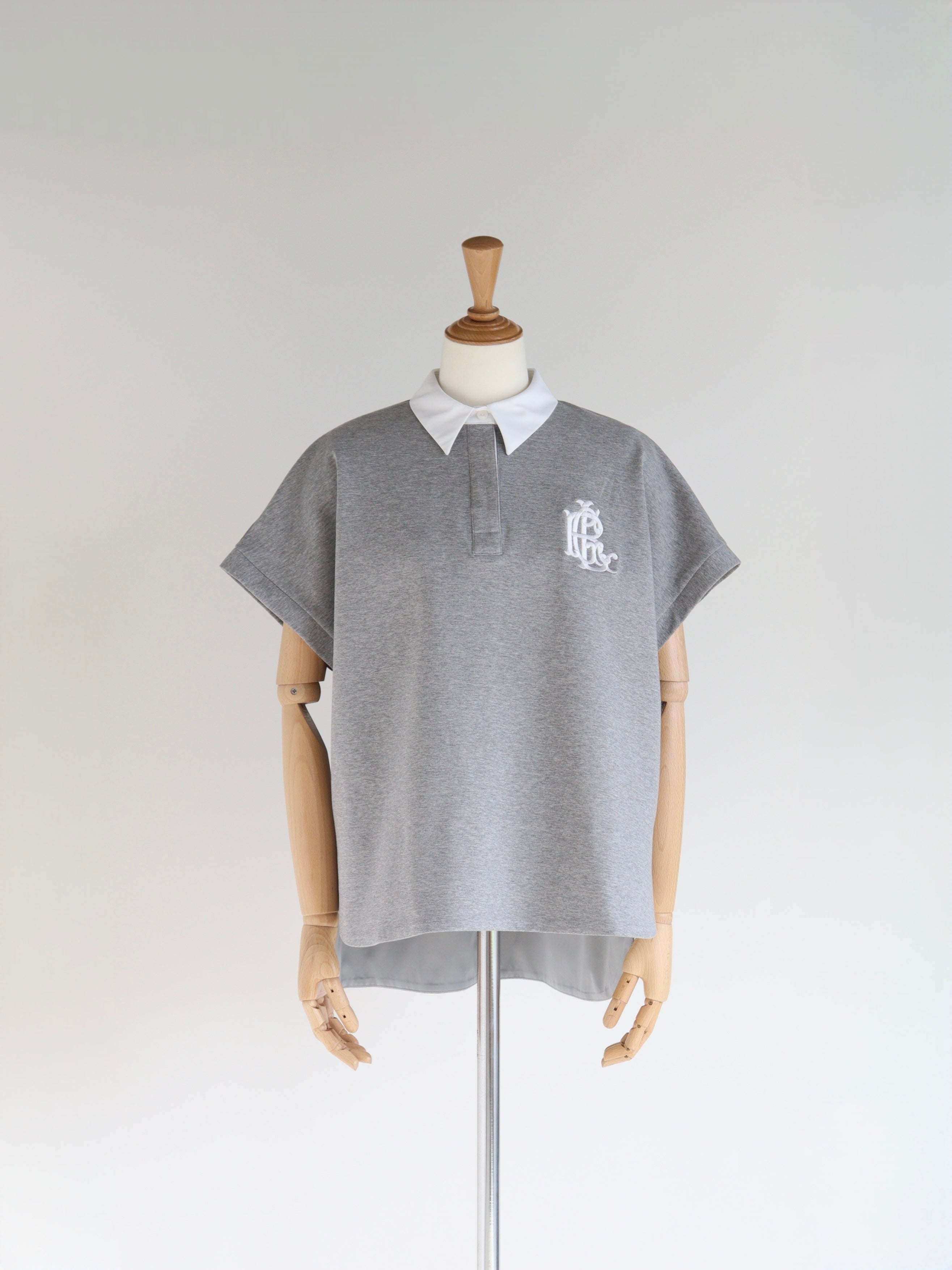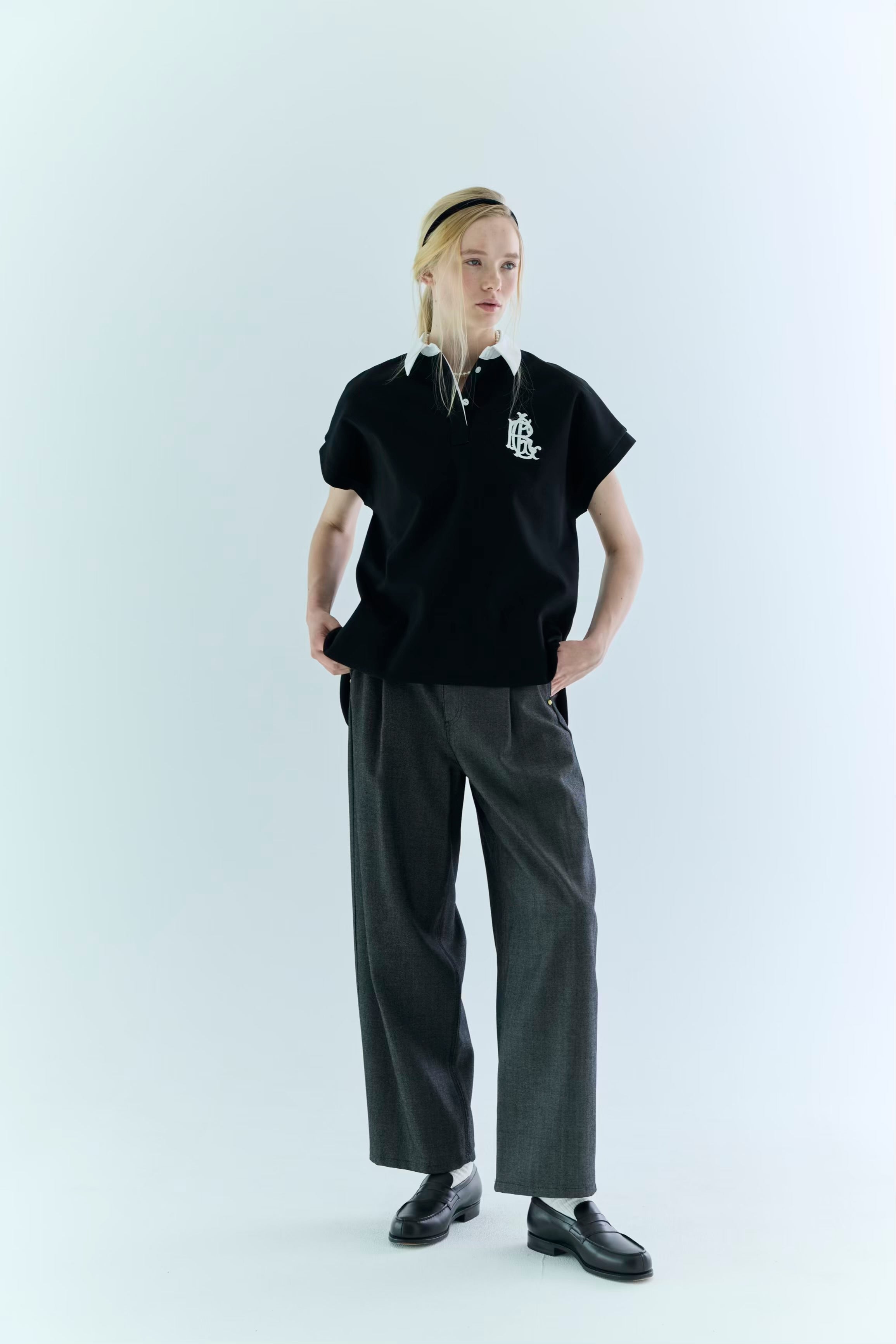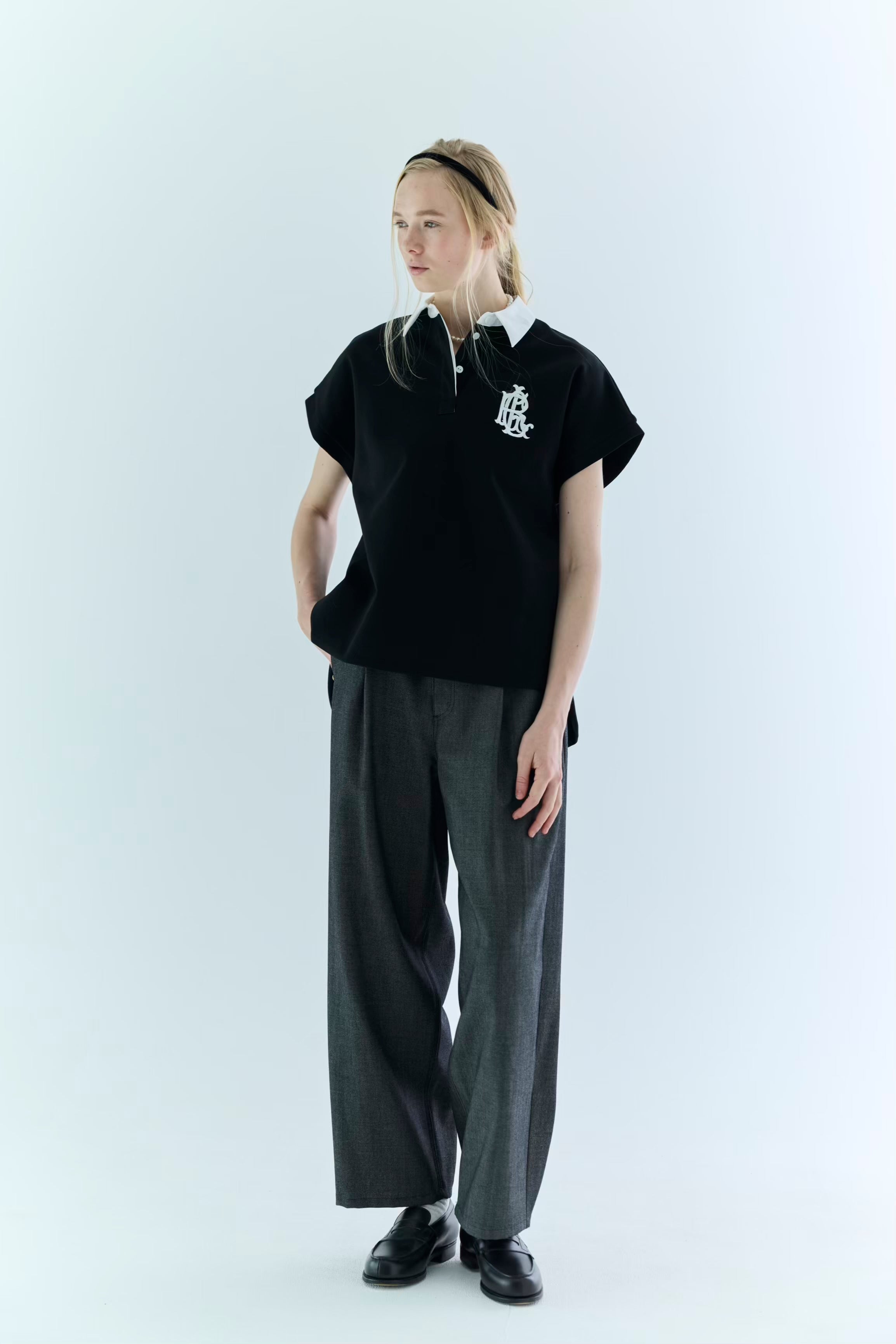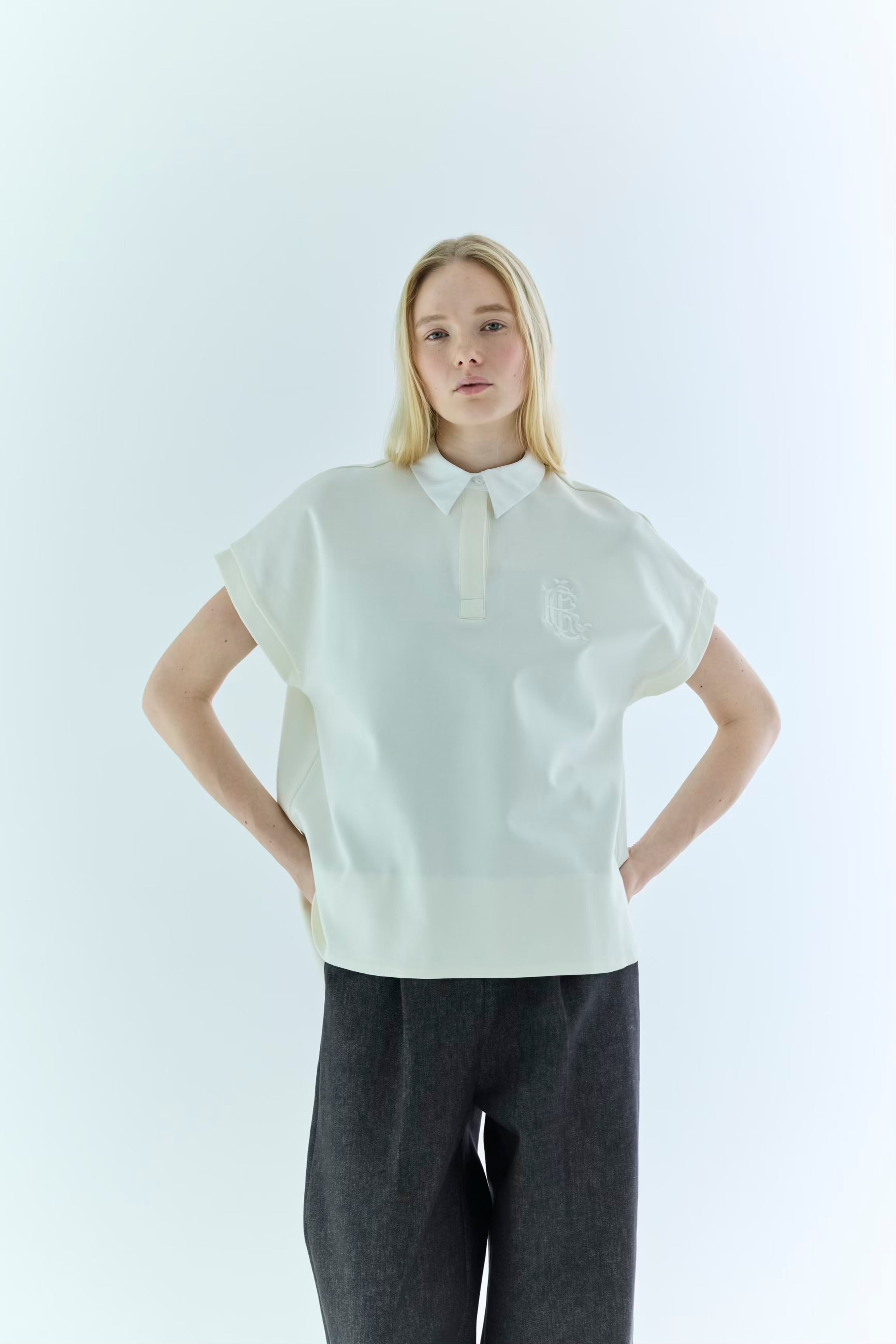 カジュアルになりがちなポロシャツですが、綺麗めなポンチ素材を使用し、モノグラムの刺繍を入れることで、上品に取り入れられるアイテムになりました。少し肩にかかるフレンチスリーブが、二の腕をそっとカバーしてくれます。