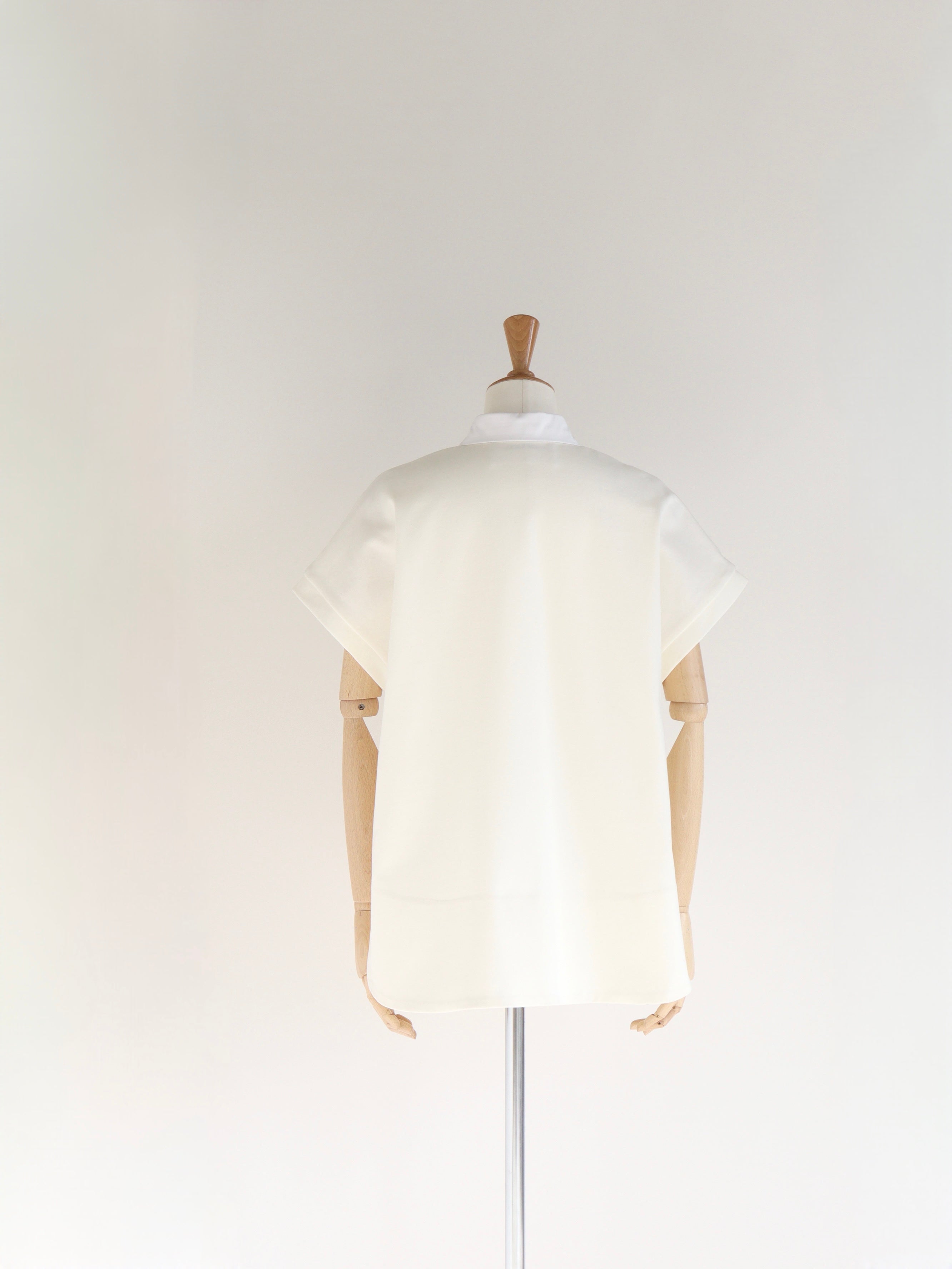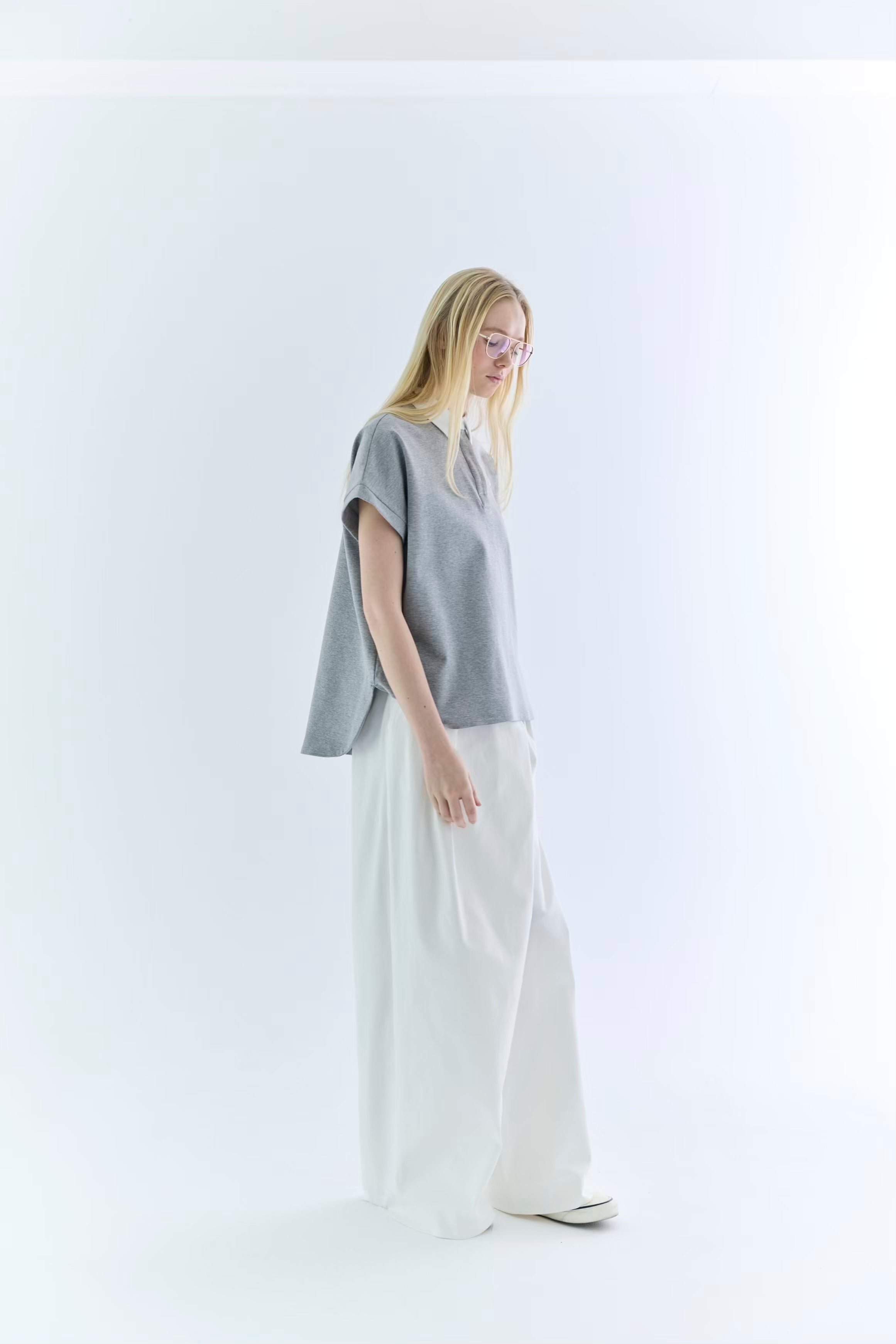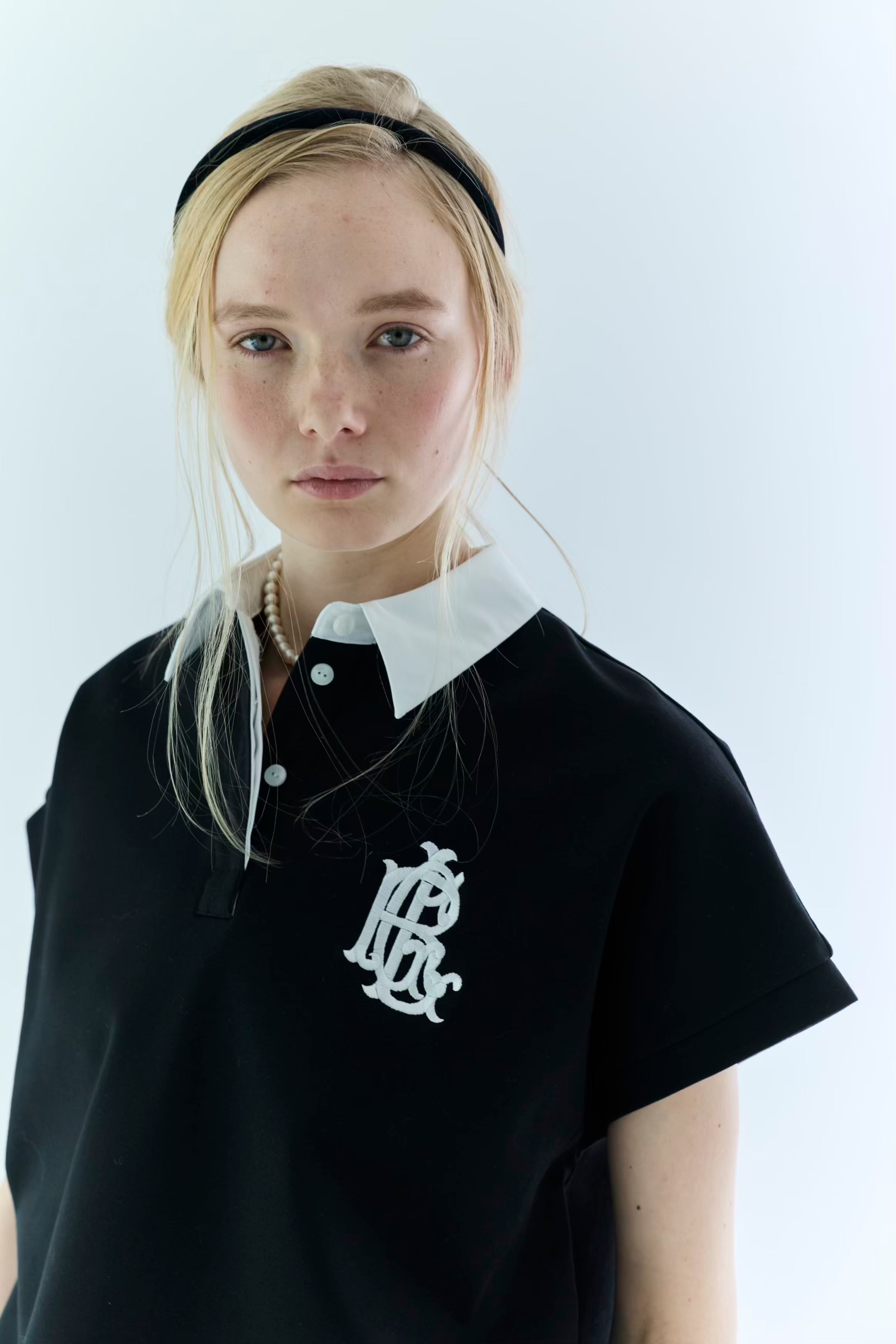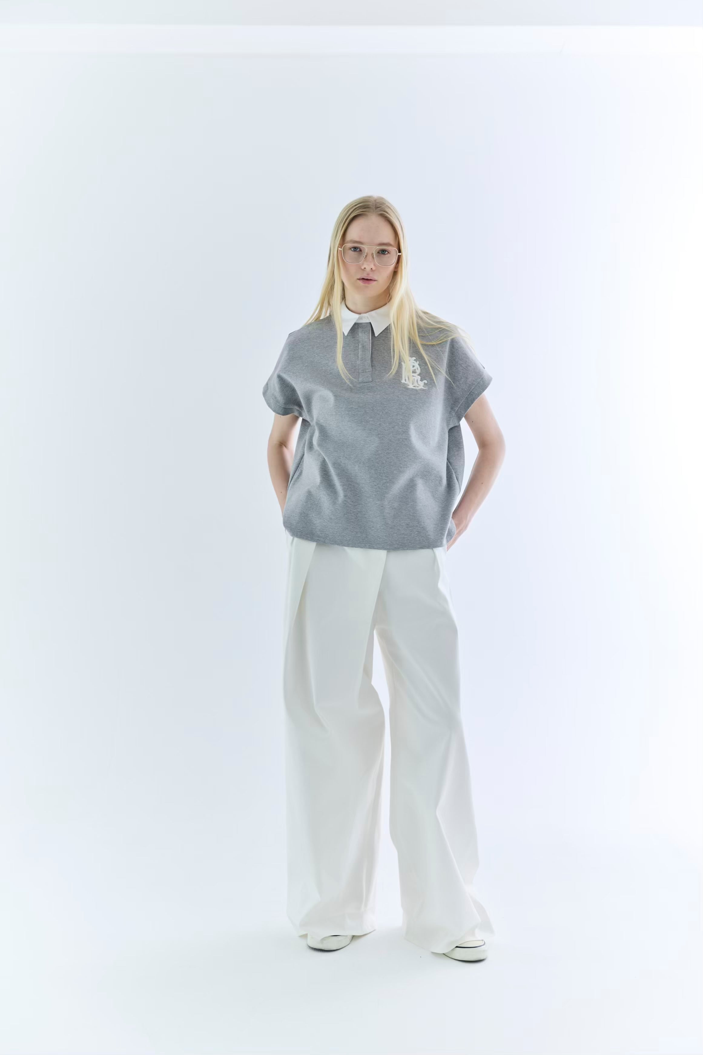 カジュアルになりがちなポロシャツですが、綺麗めなポンチ素材を使用し、モノグラムの刺繍を入れることで、上品に取り入れられるアイテムになりました。少し肩にかかるフレンチスリーブが、二の腕をそっとカバーしてくれます。