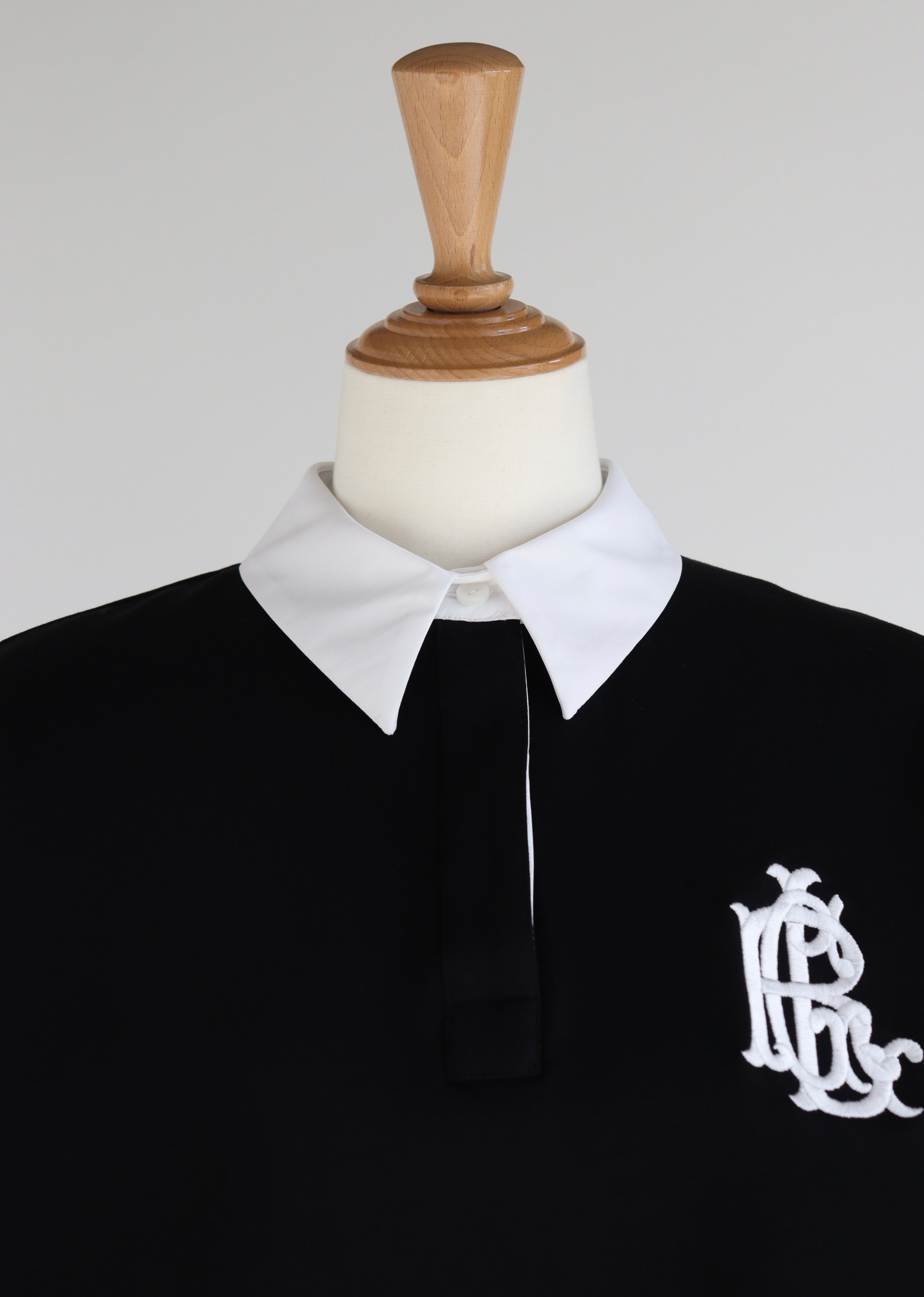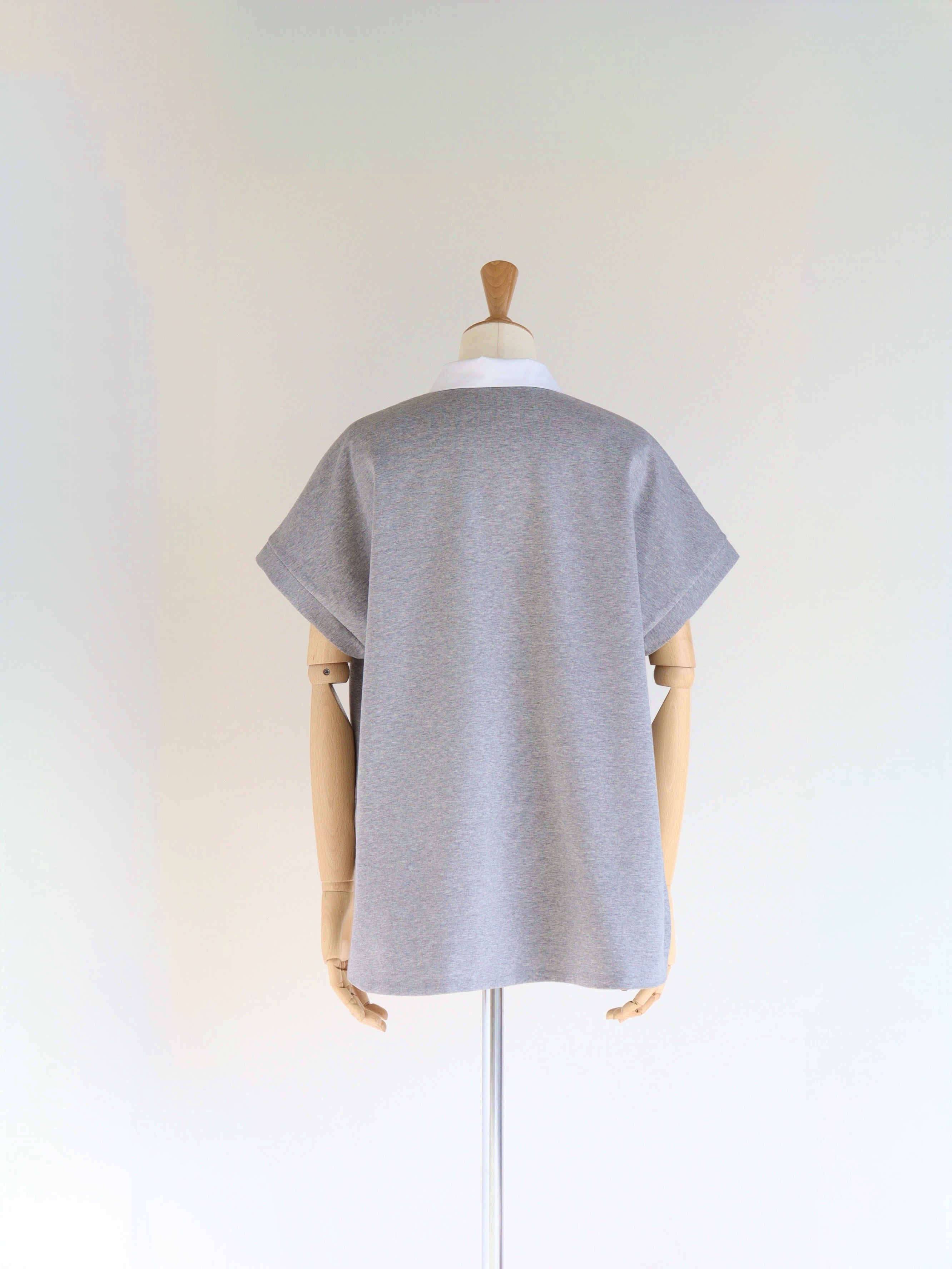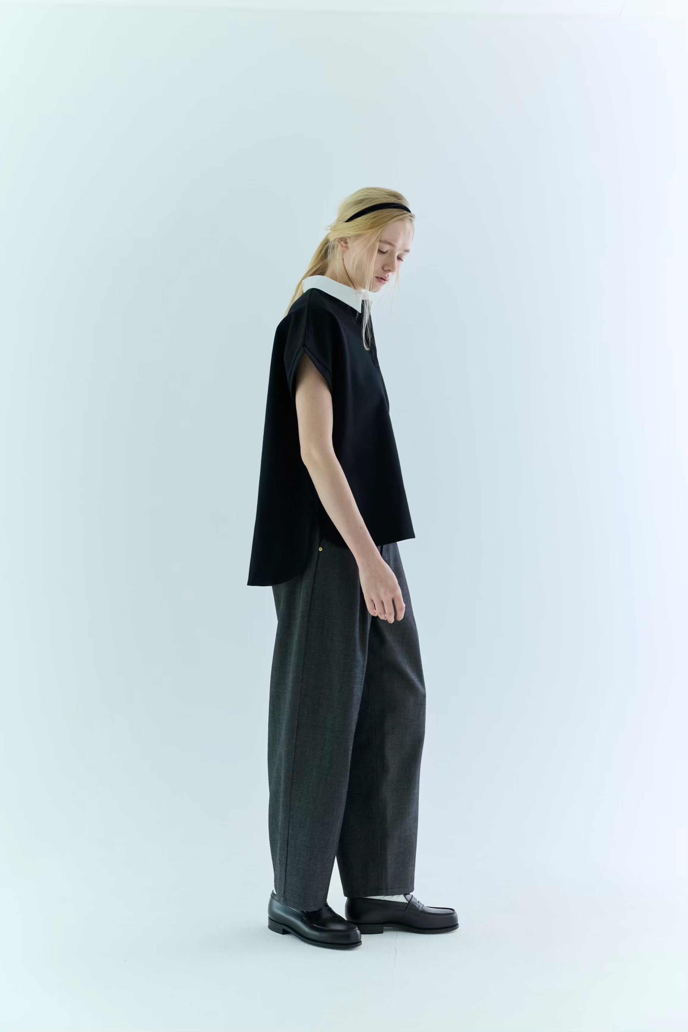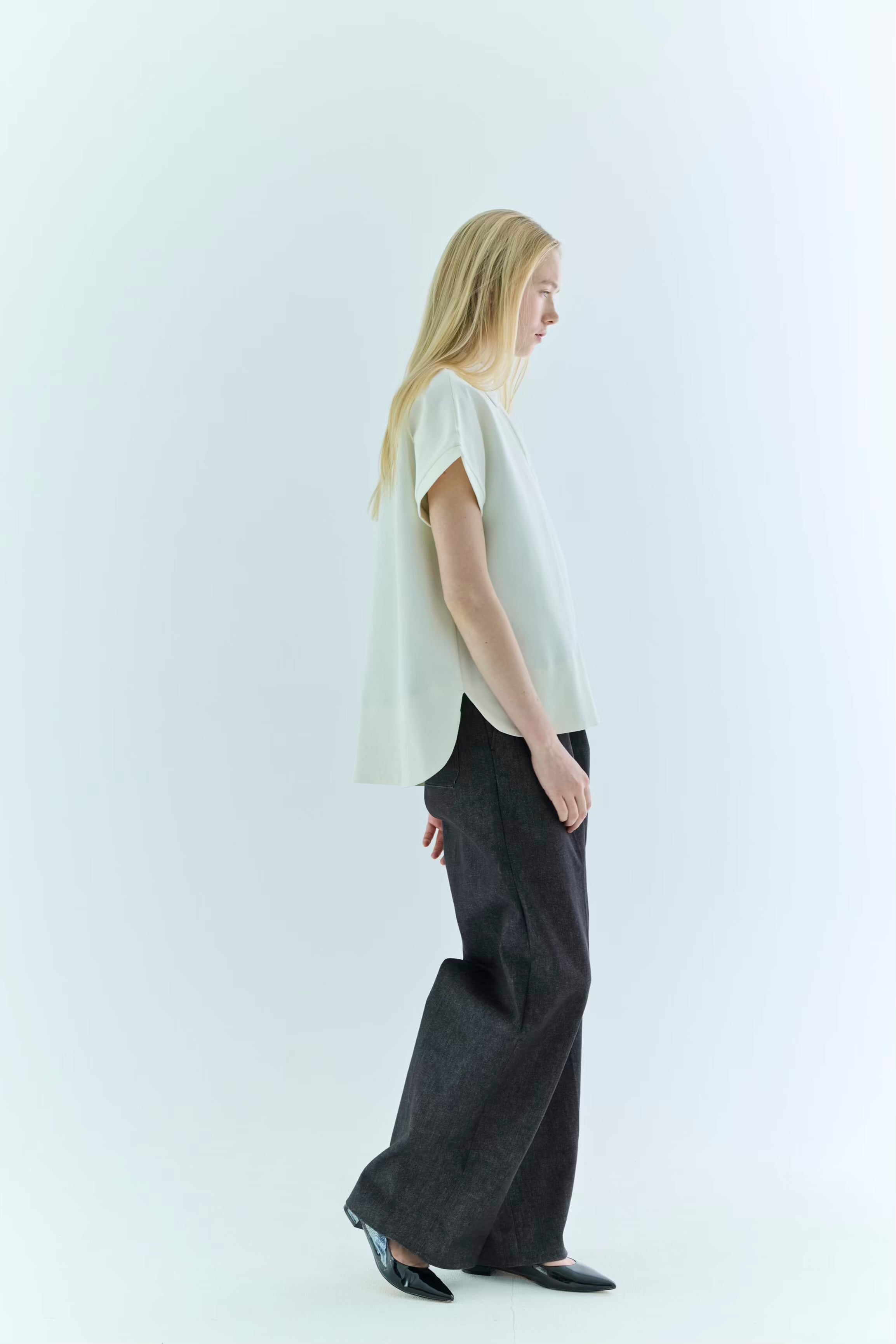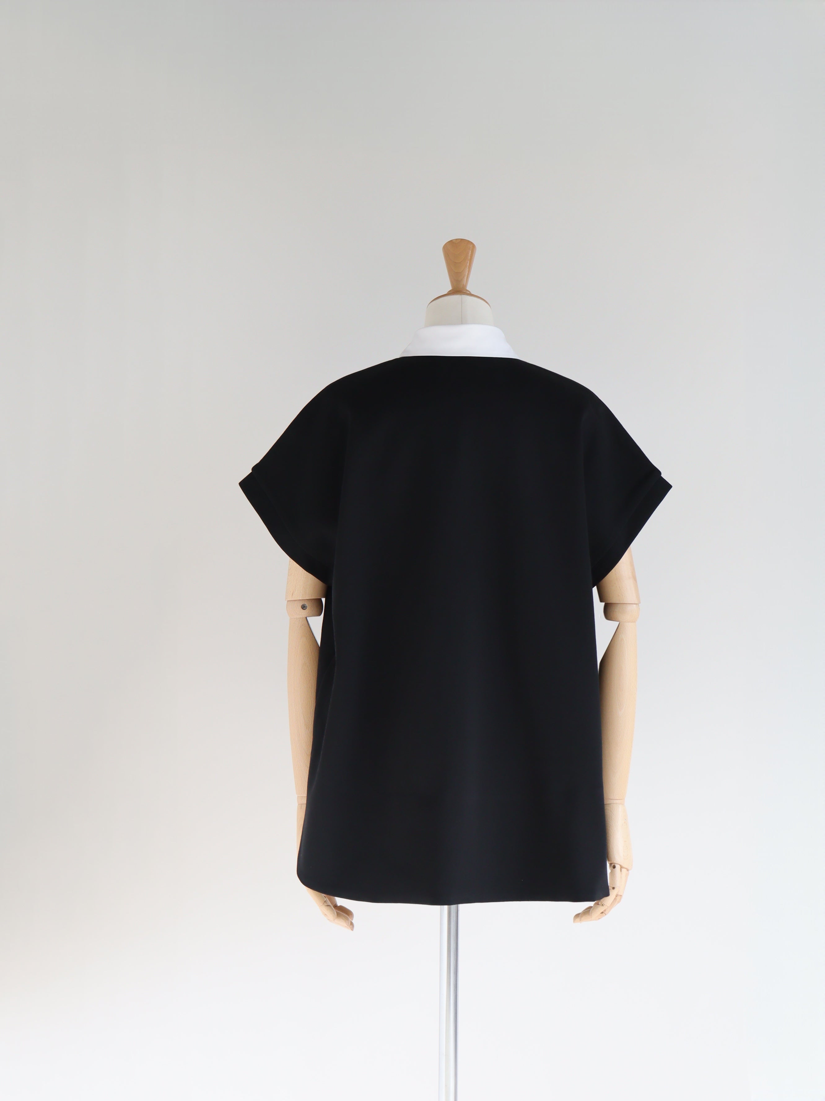 カジュアルになりがちなポロシャツですが、綺麗めなポンチ素材を使用し、モノグラムの刺繍を入れることで、上品に取り入れられるアイテムになりました。少し肩にかかるフレンチスリーブが、二の腕をそっとカバーしてくれます。