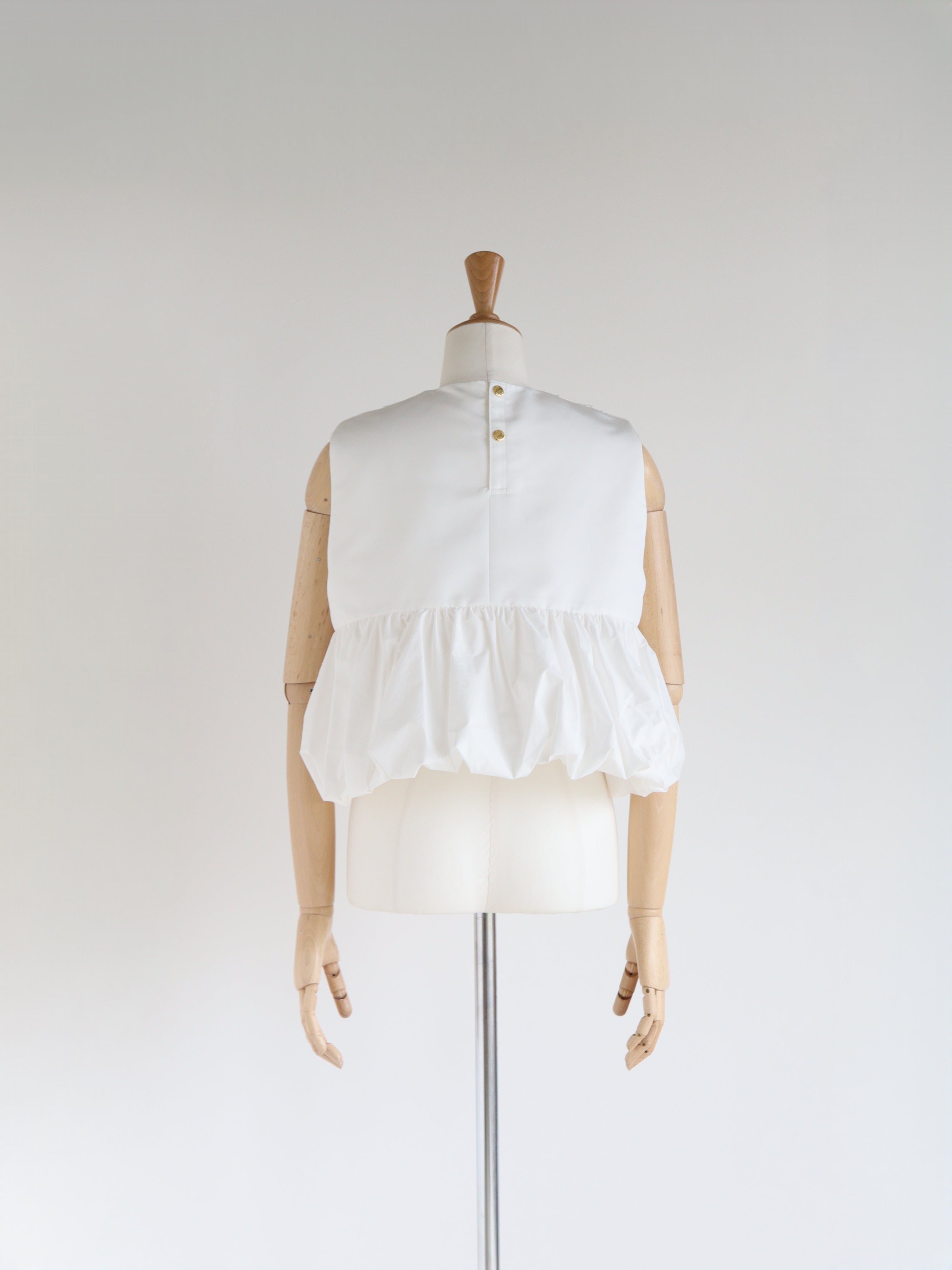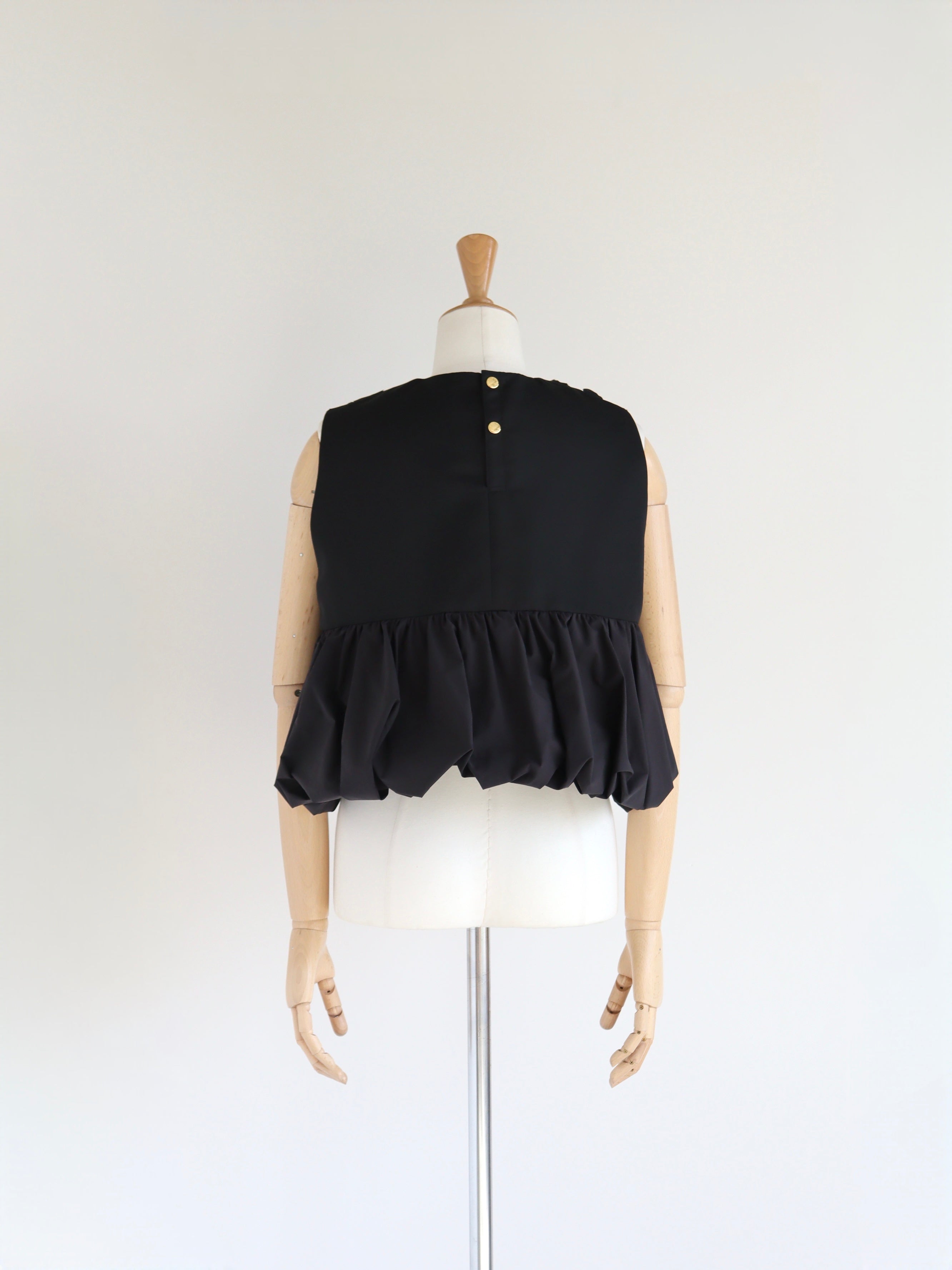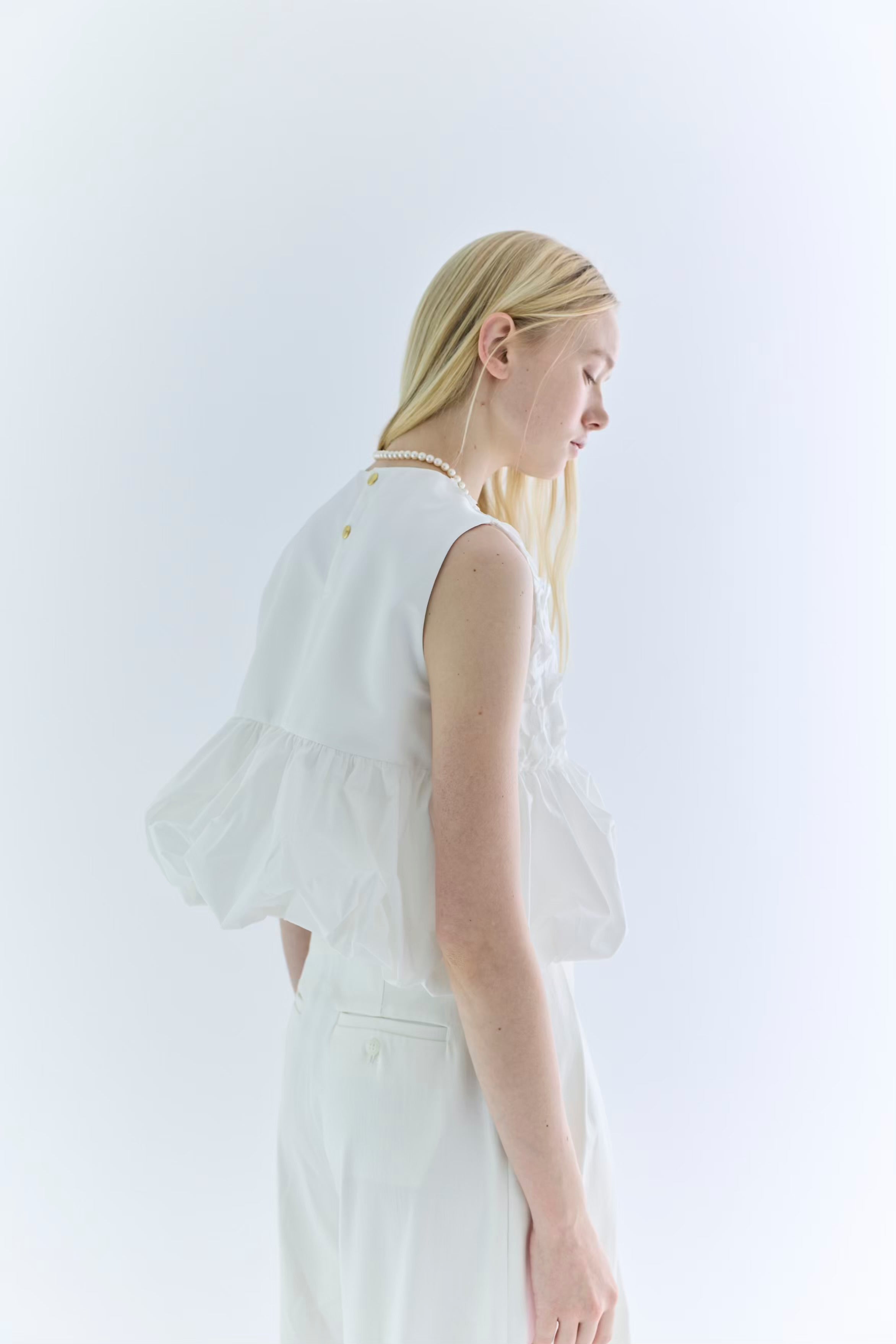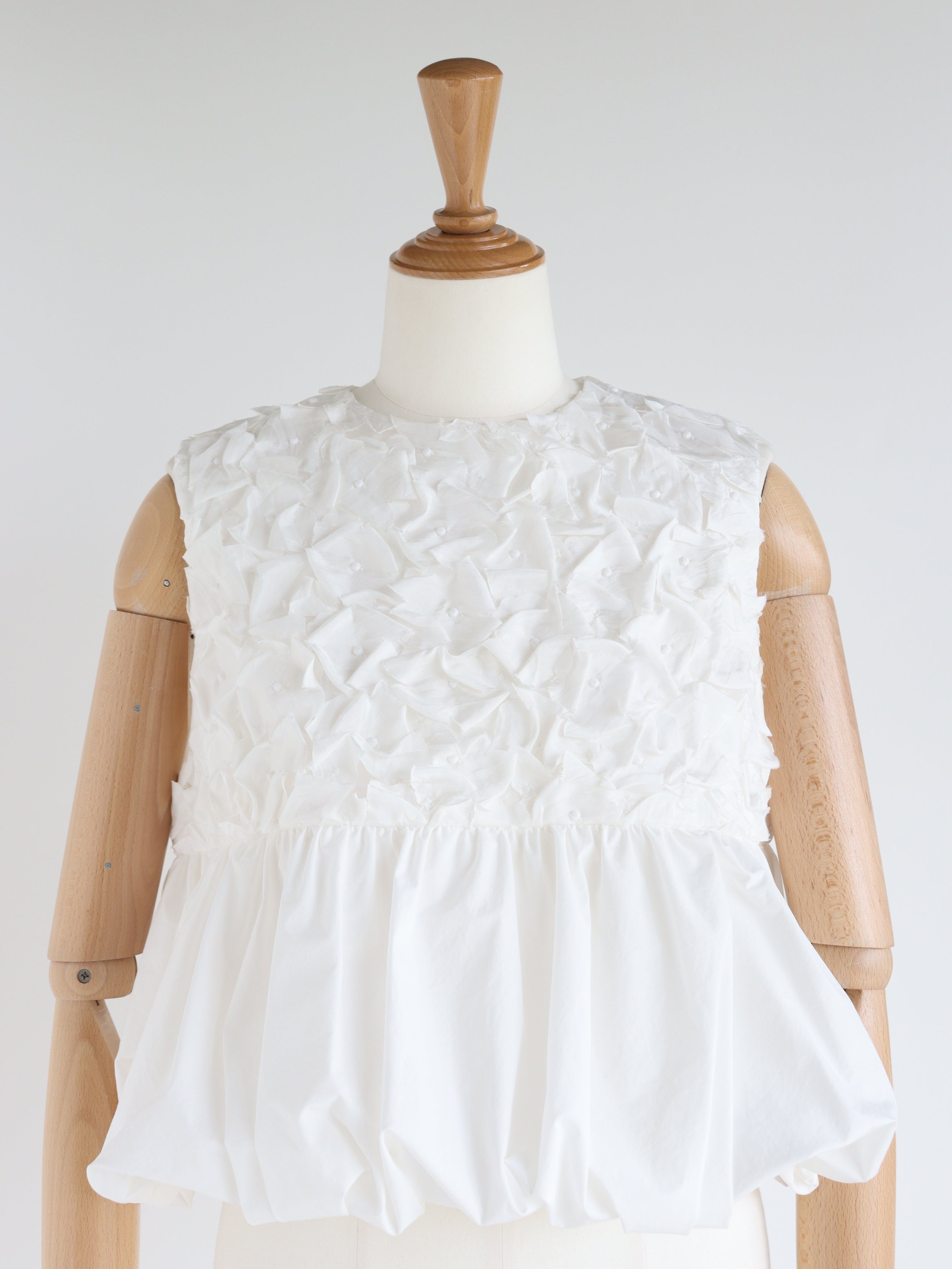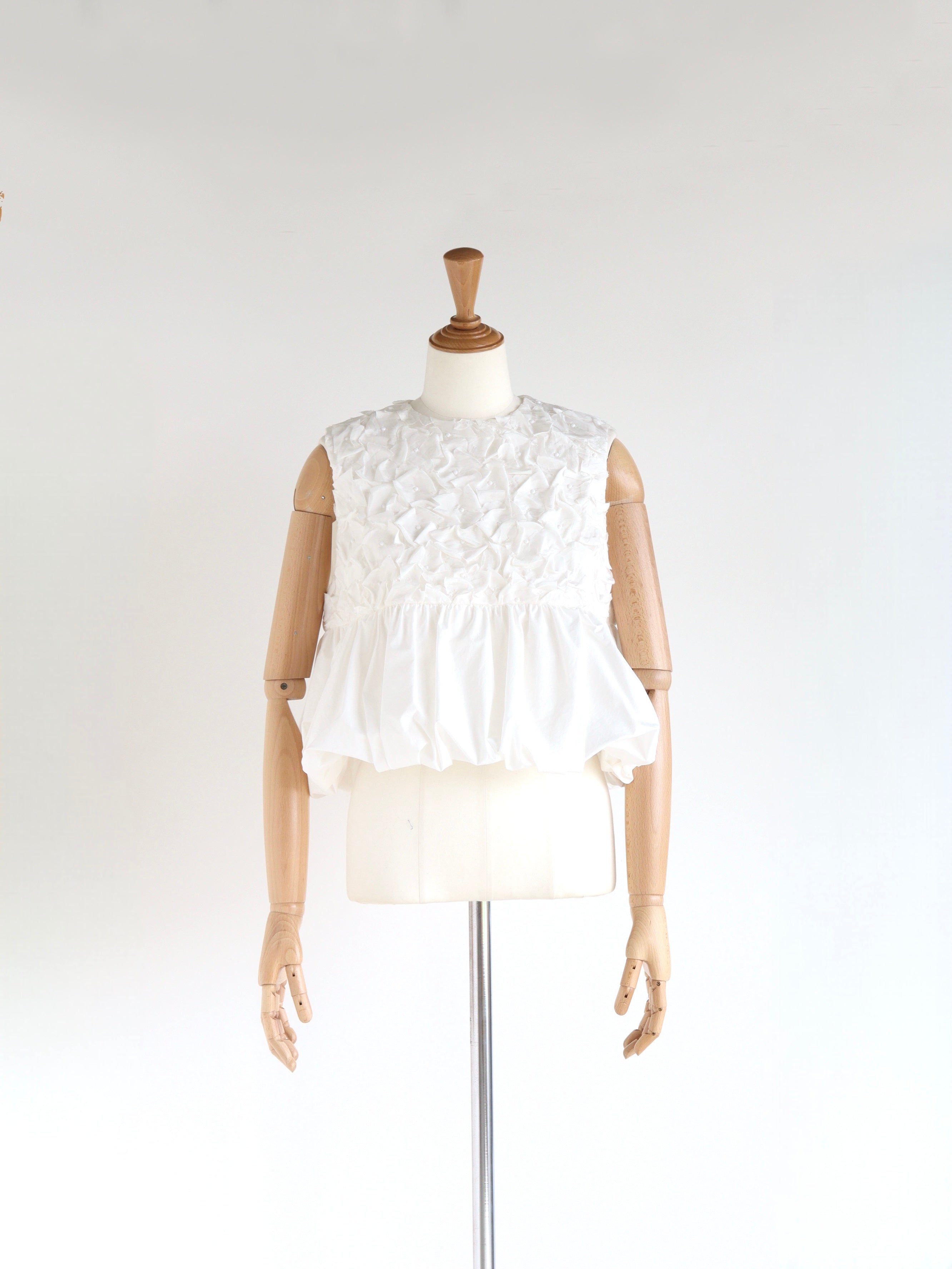 裾がランダムに寄せたギャザーのバルーンになっているので一枚で華やかなコーディネートが叶います。