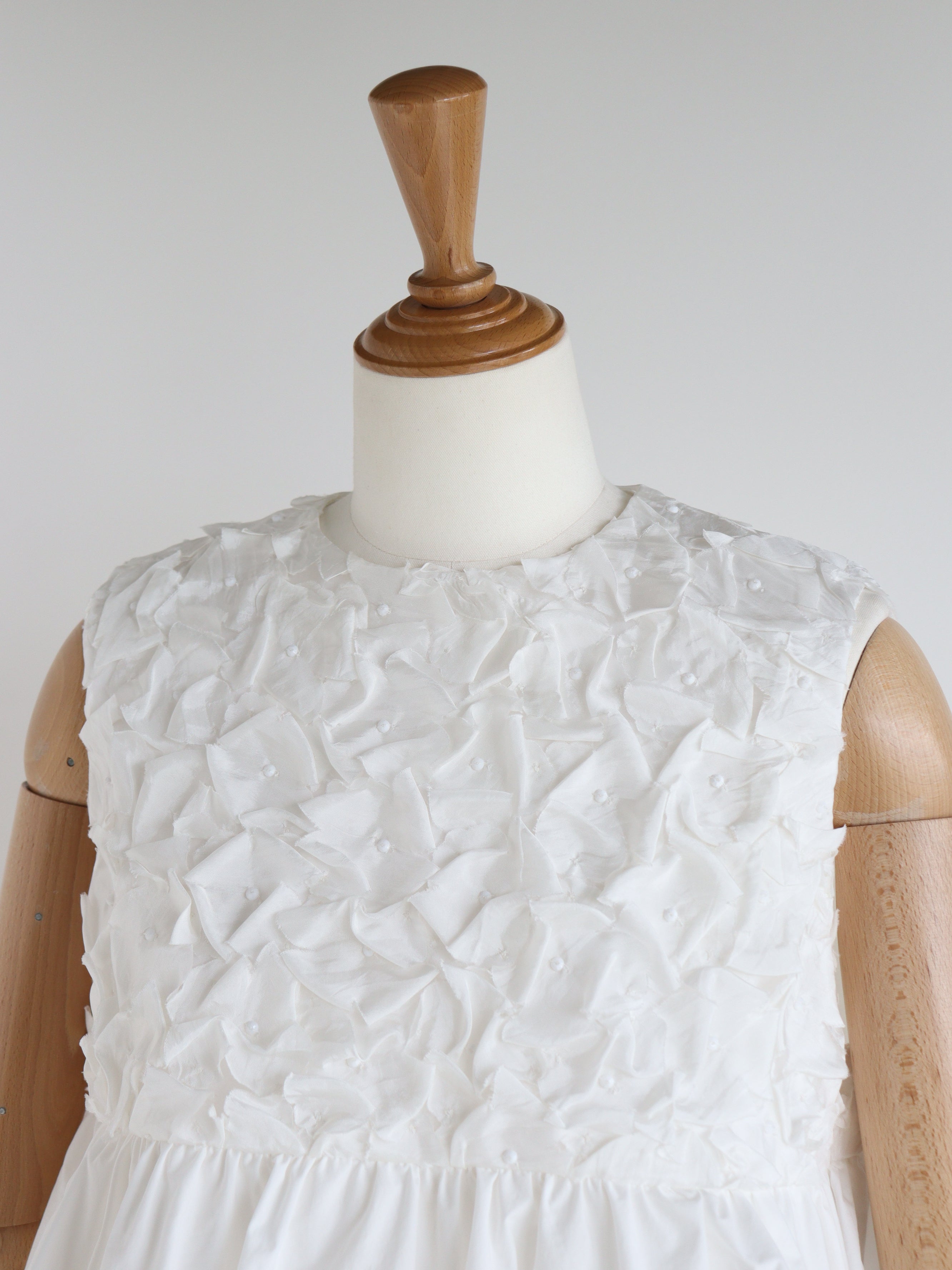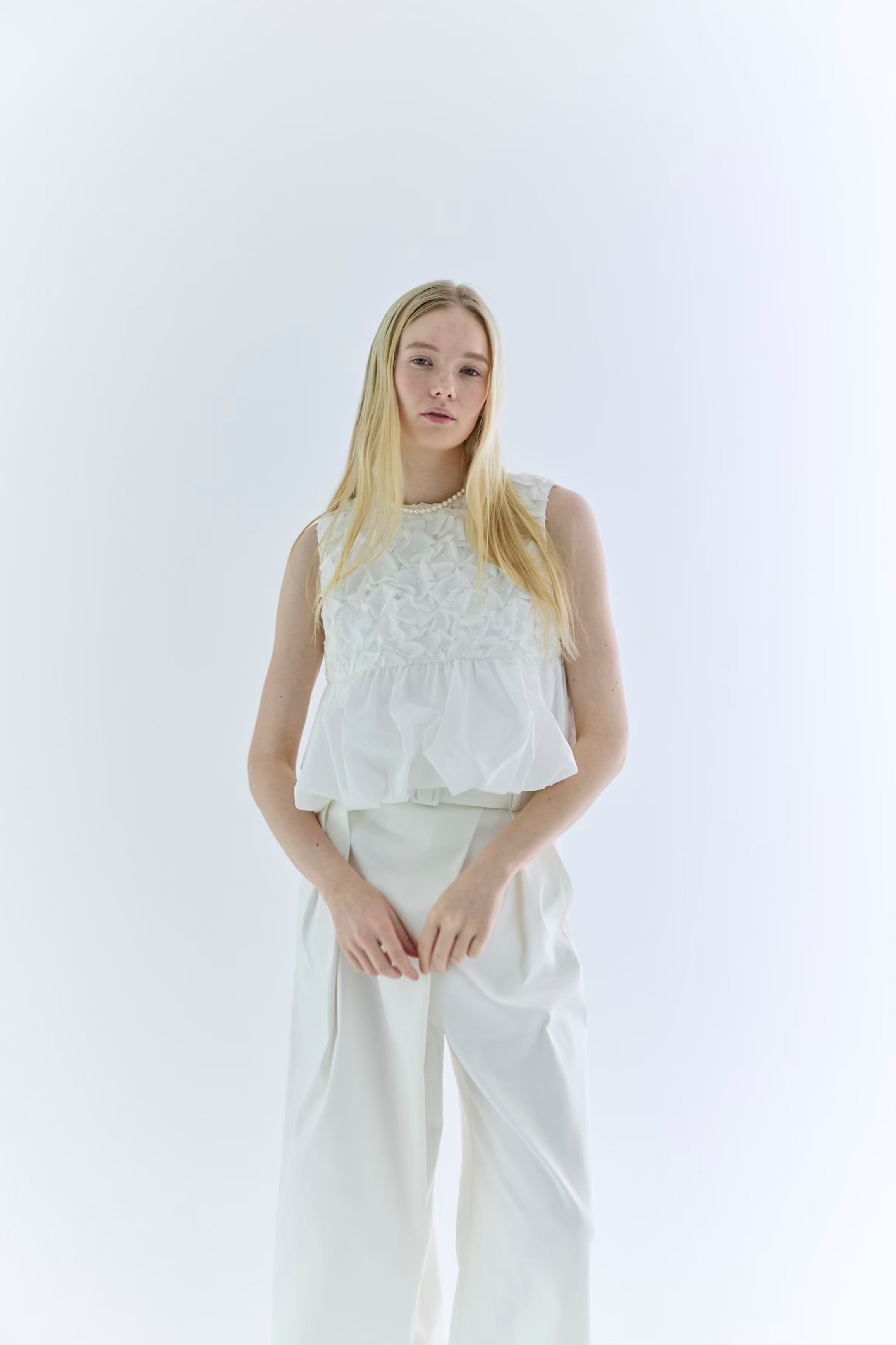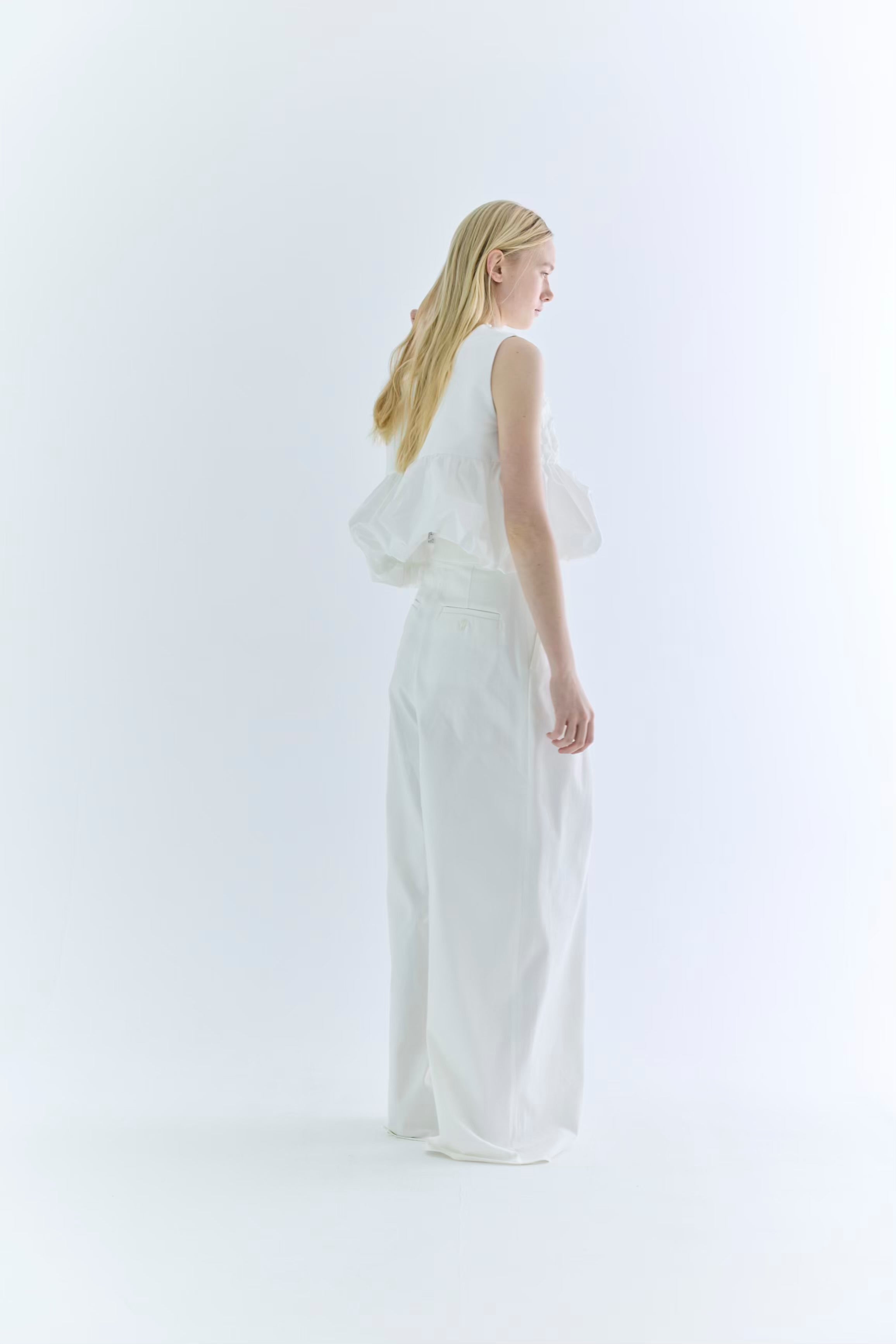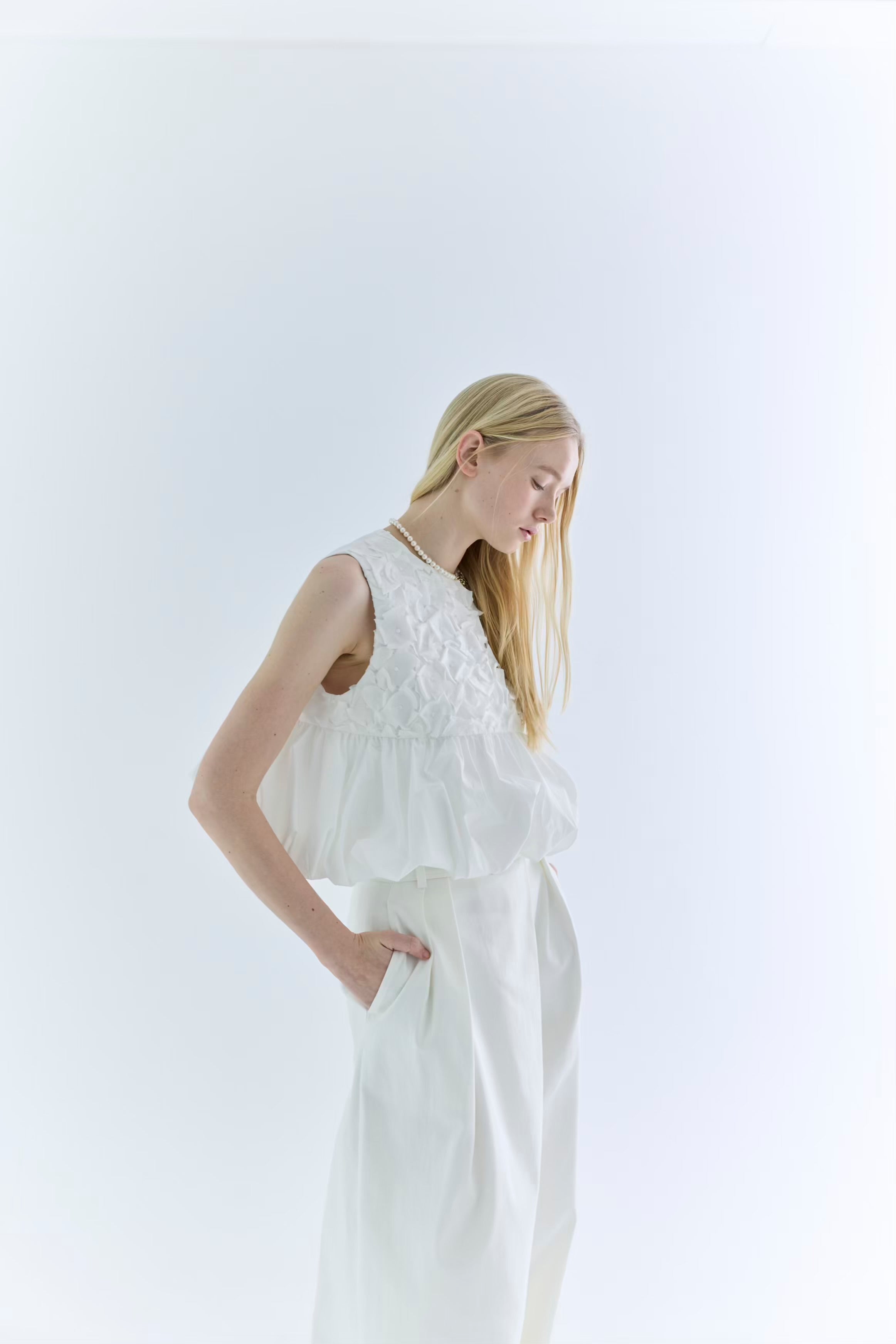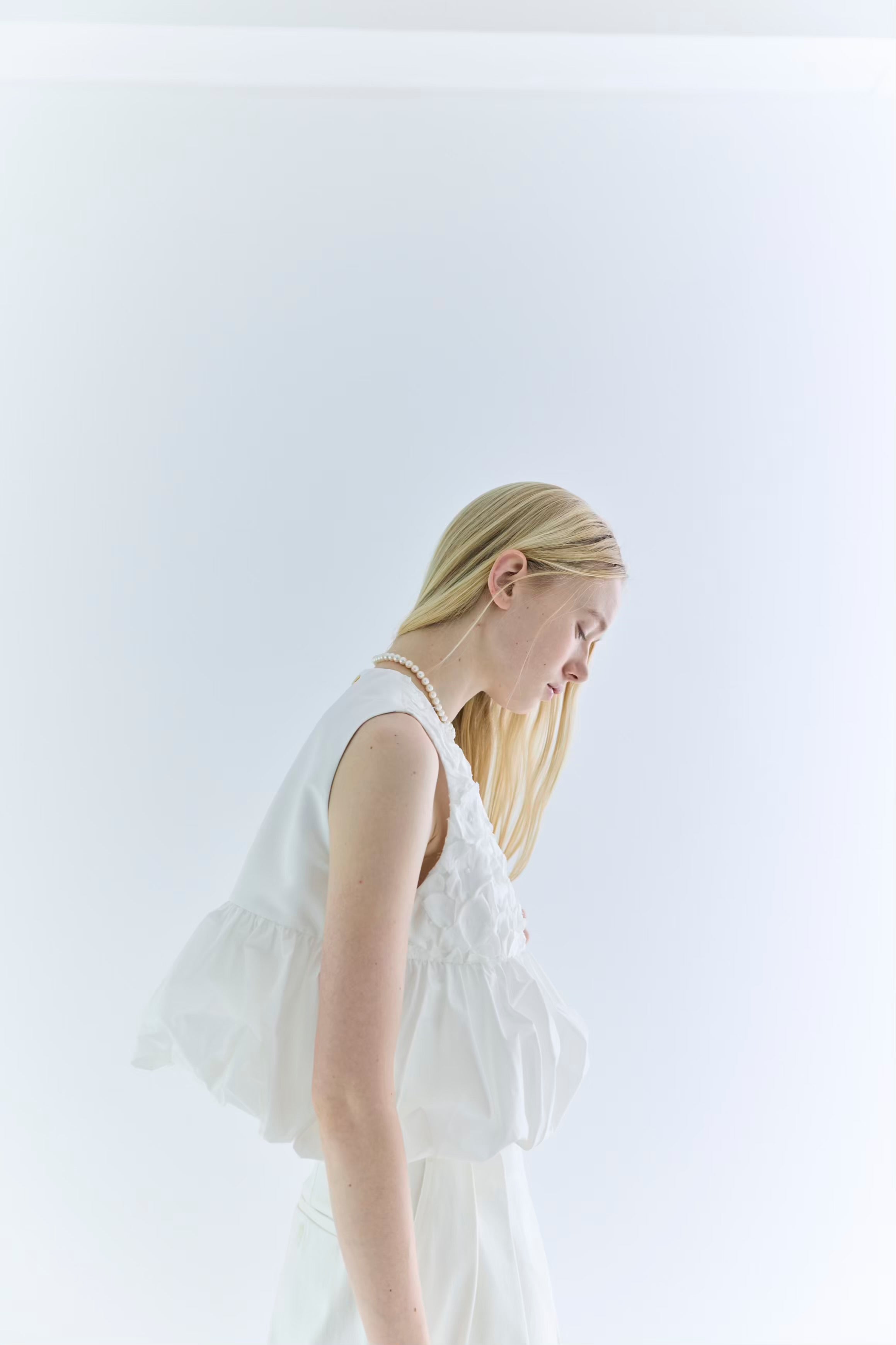 裾がランダムに寄せたギャザーのバルーンになっているので一枚で華やかなコーディネートが叶います。