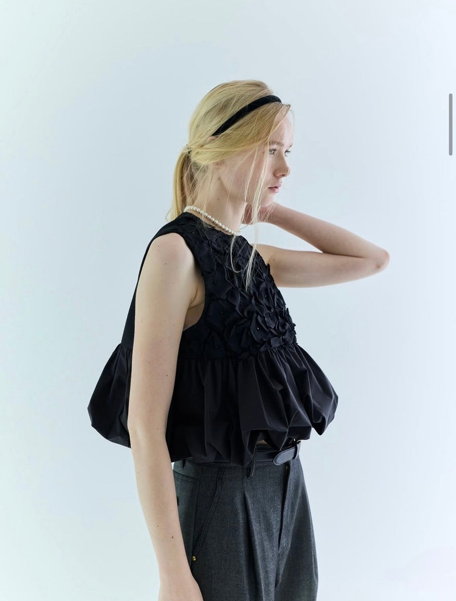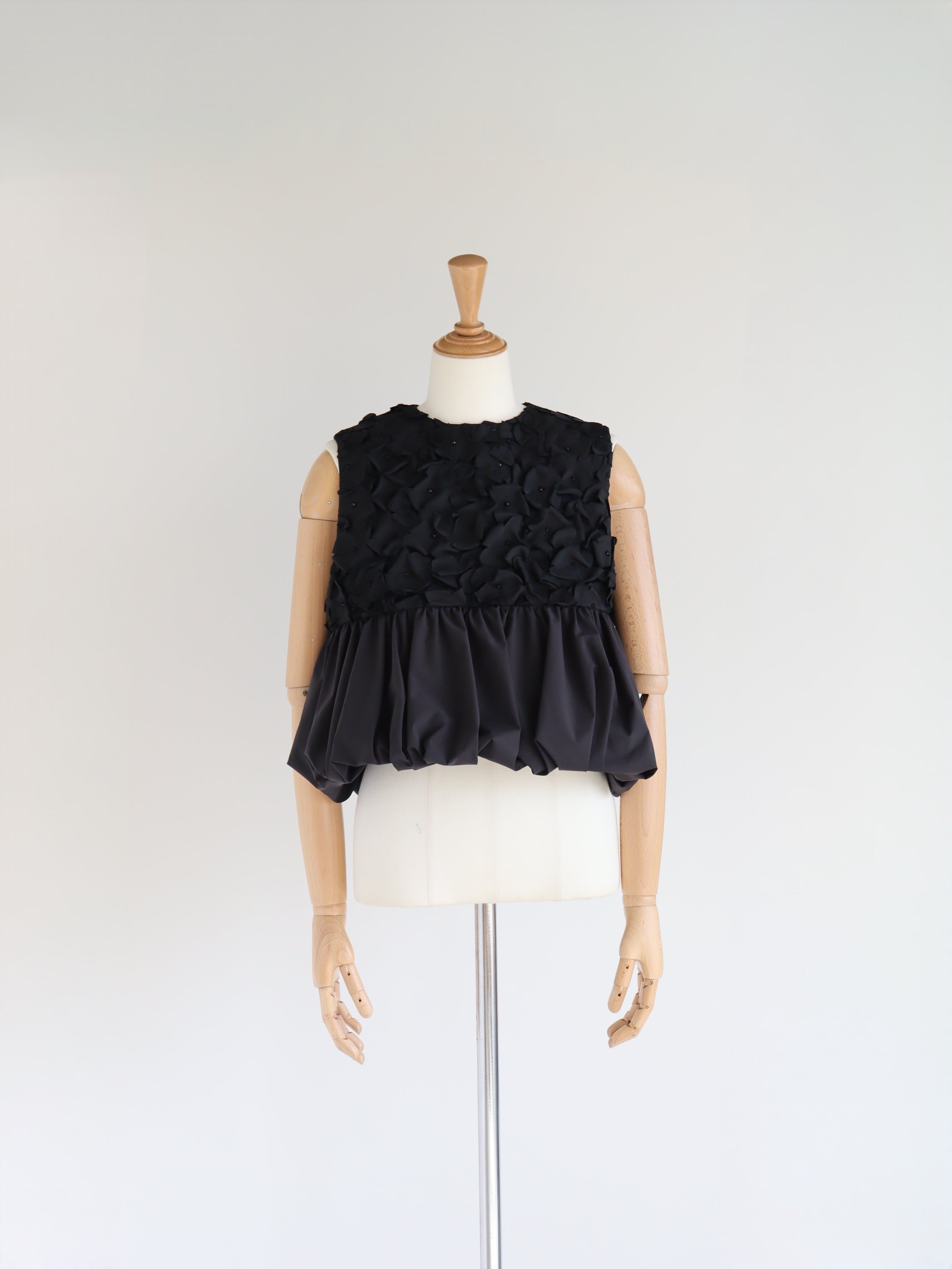 職人が一つ一つビーズで縫い留めたお花のモチーフが美しい、特別な生地でお作りしたブラックラインのトップスです。