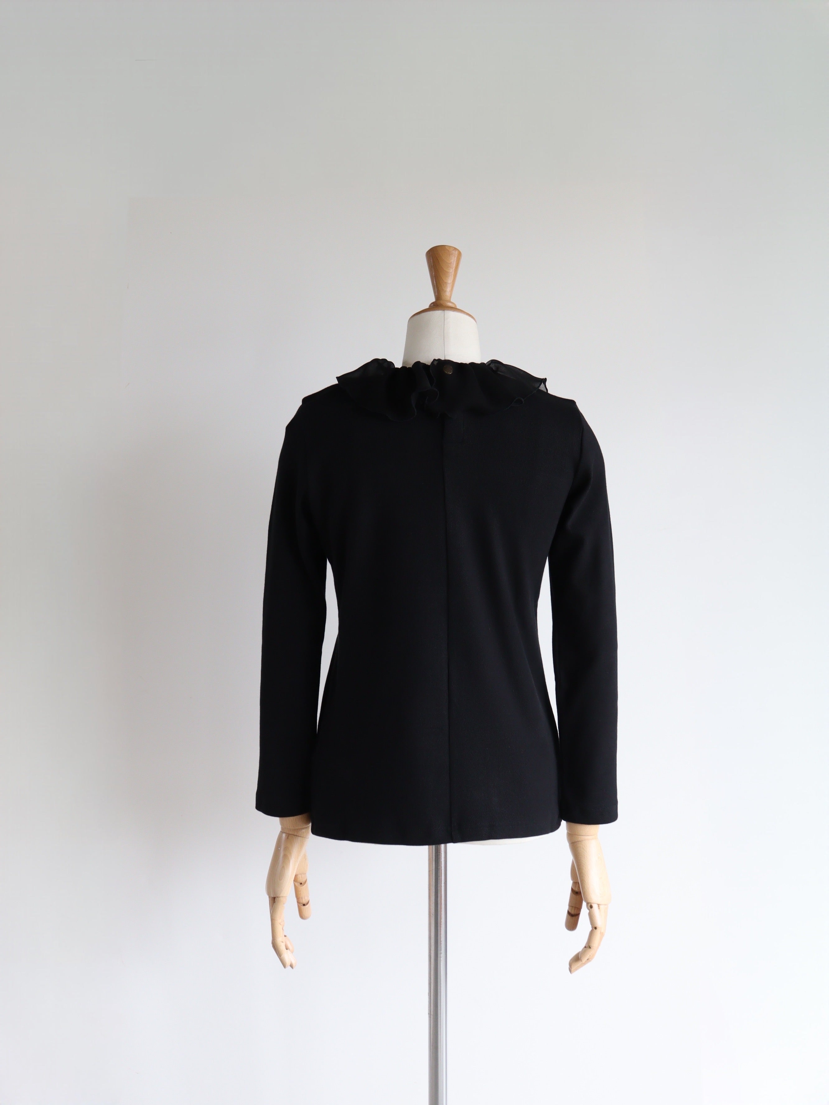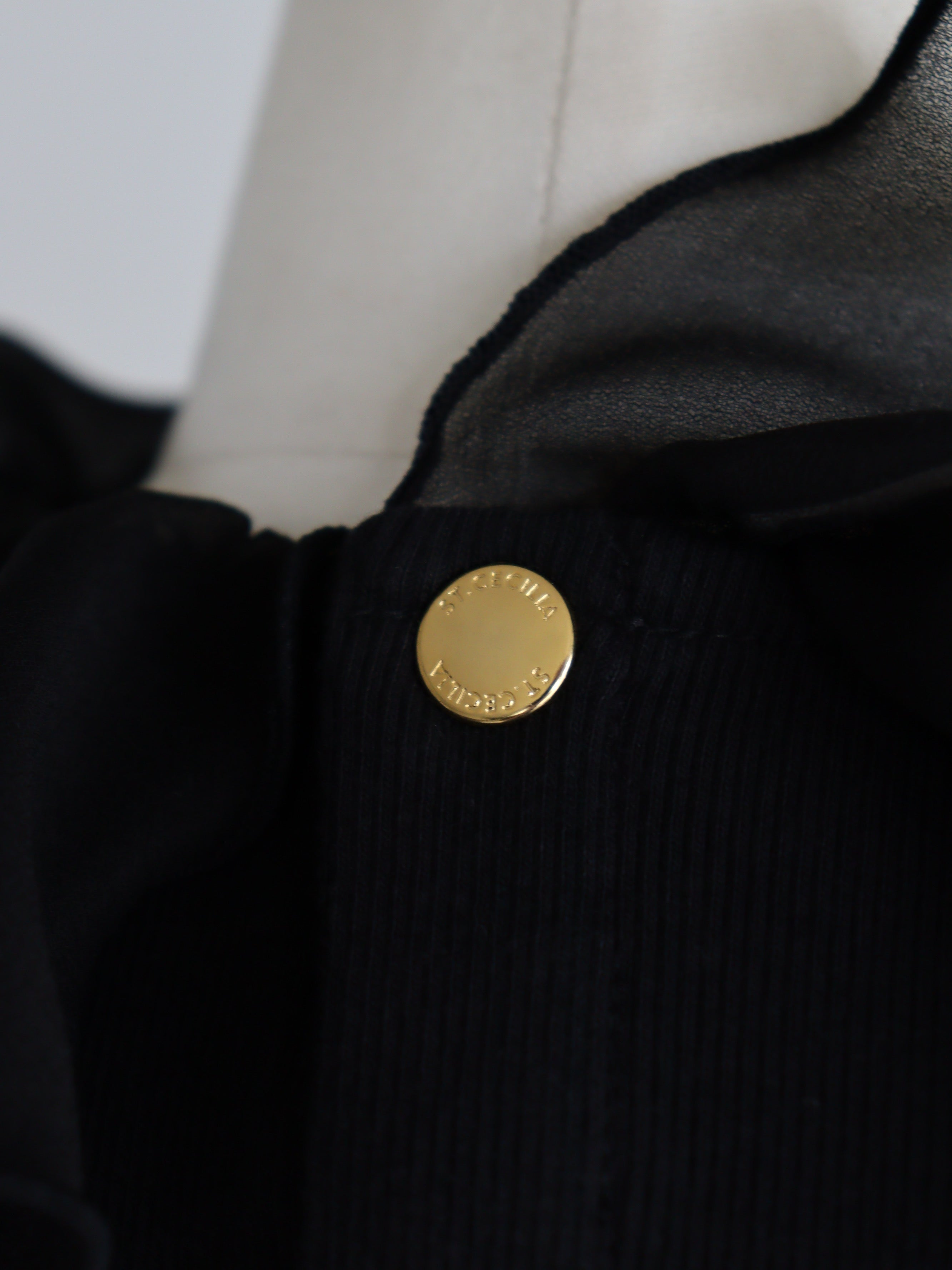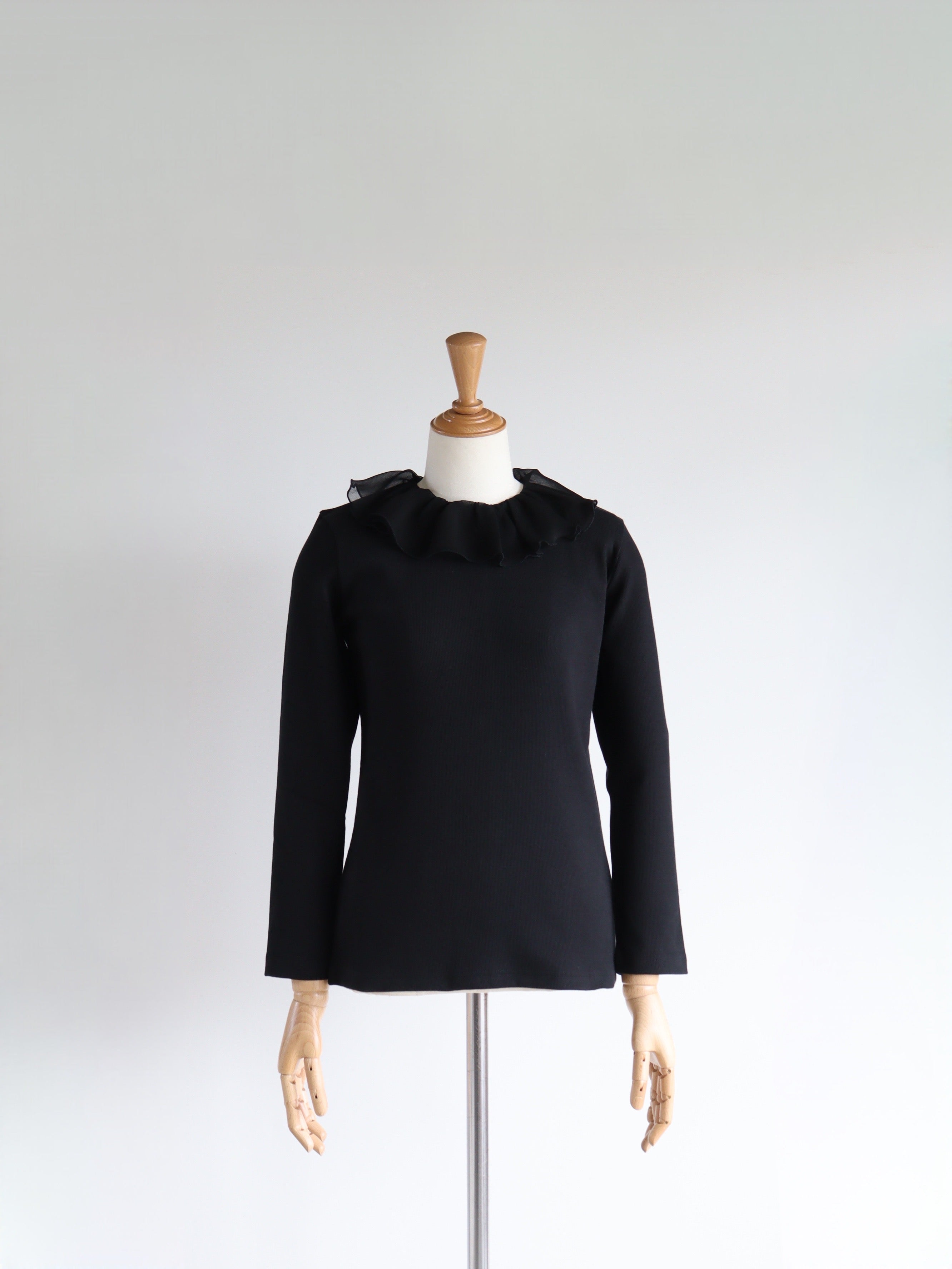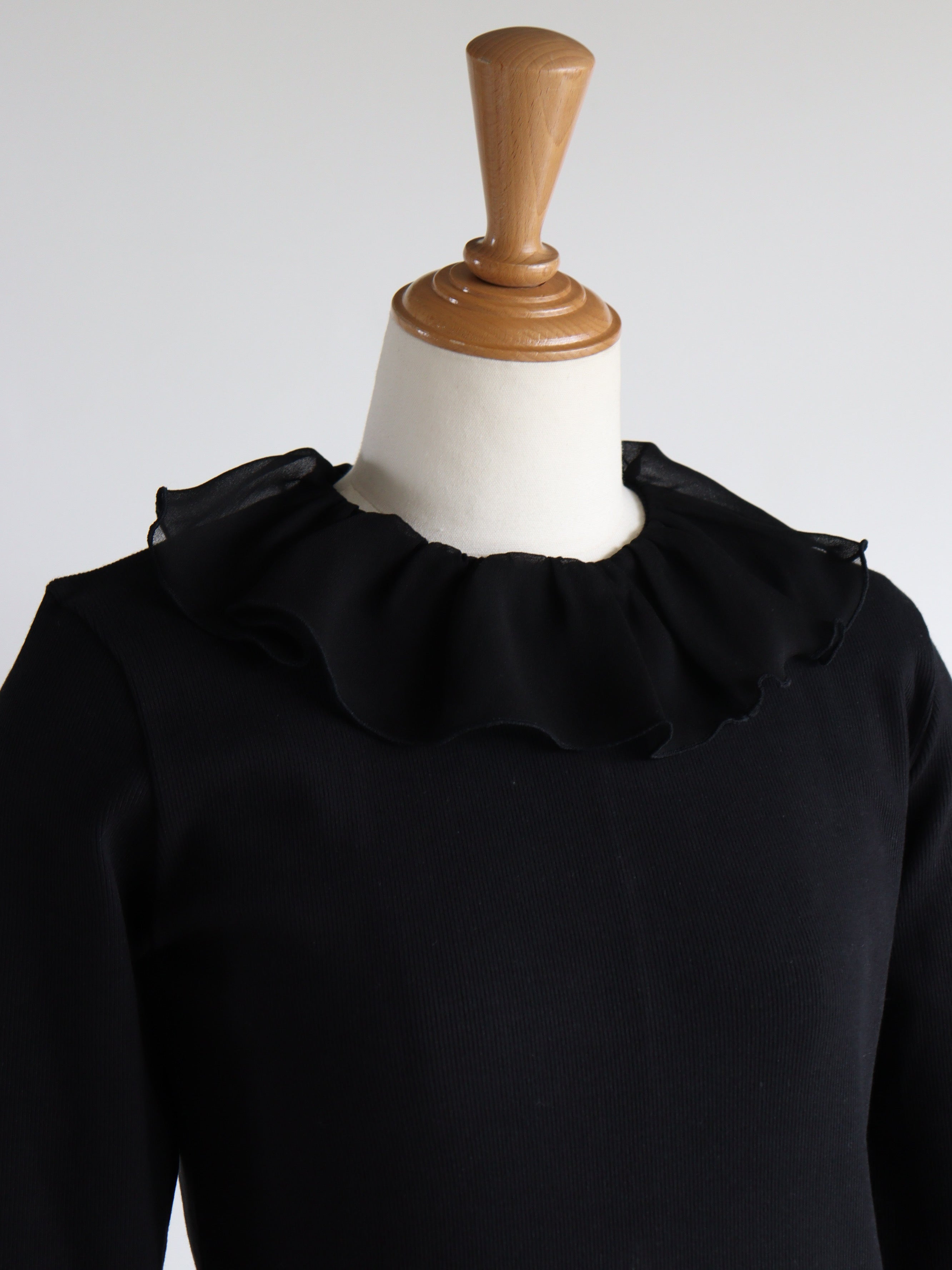 肌に吸い付くように伸びるテレコトップスは襟にオーガンジーのフリルが付いていて、ニットやジャケットと重ねて、レイヤードを楽しんでいただけるインナーです。重ね着でも一枚でも楽しんでいただけるカットソーです。