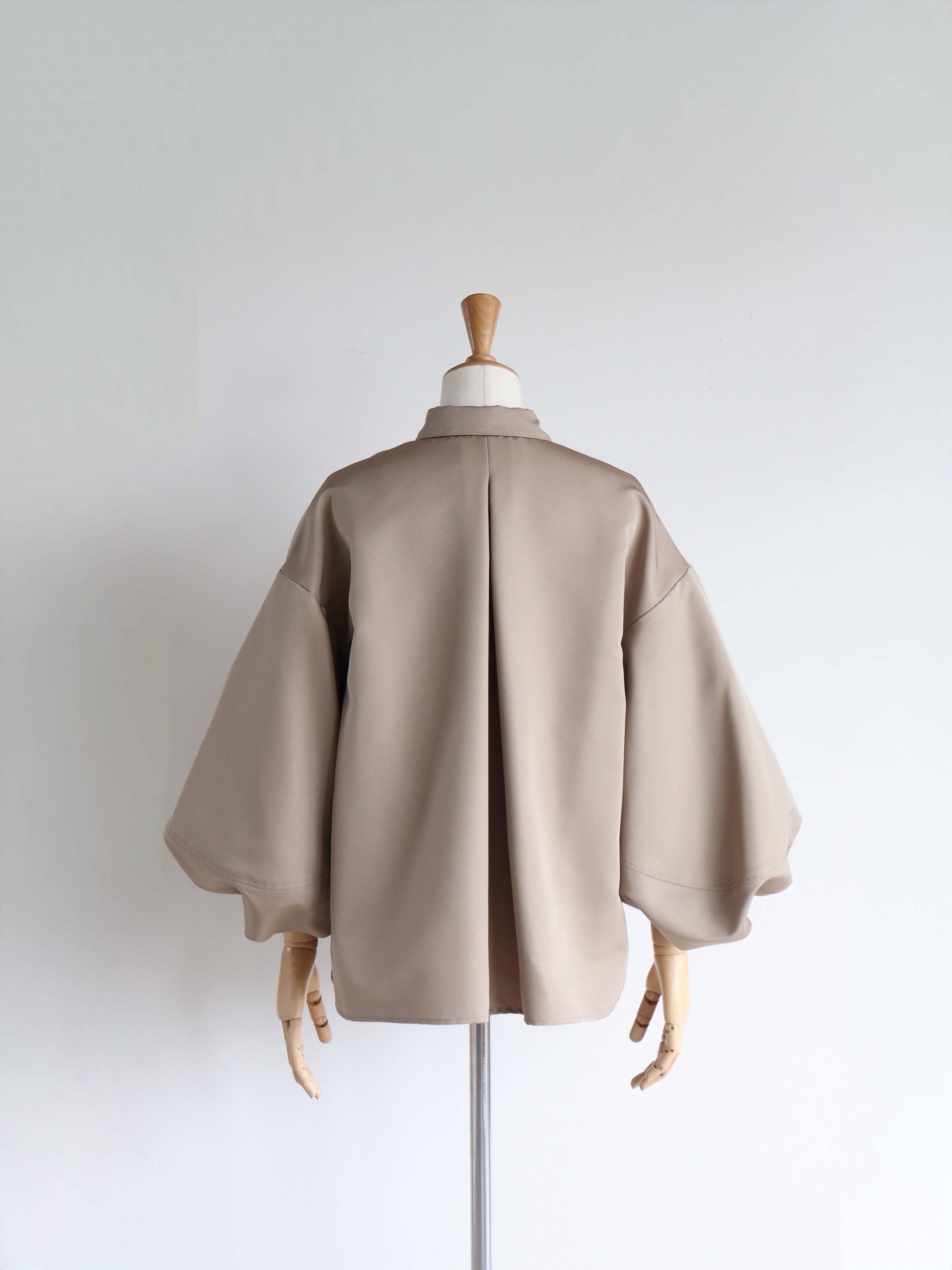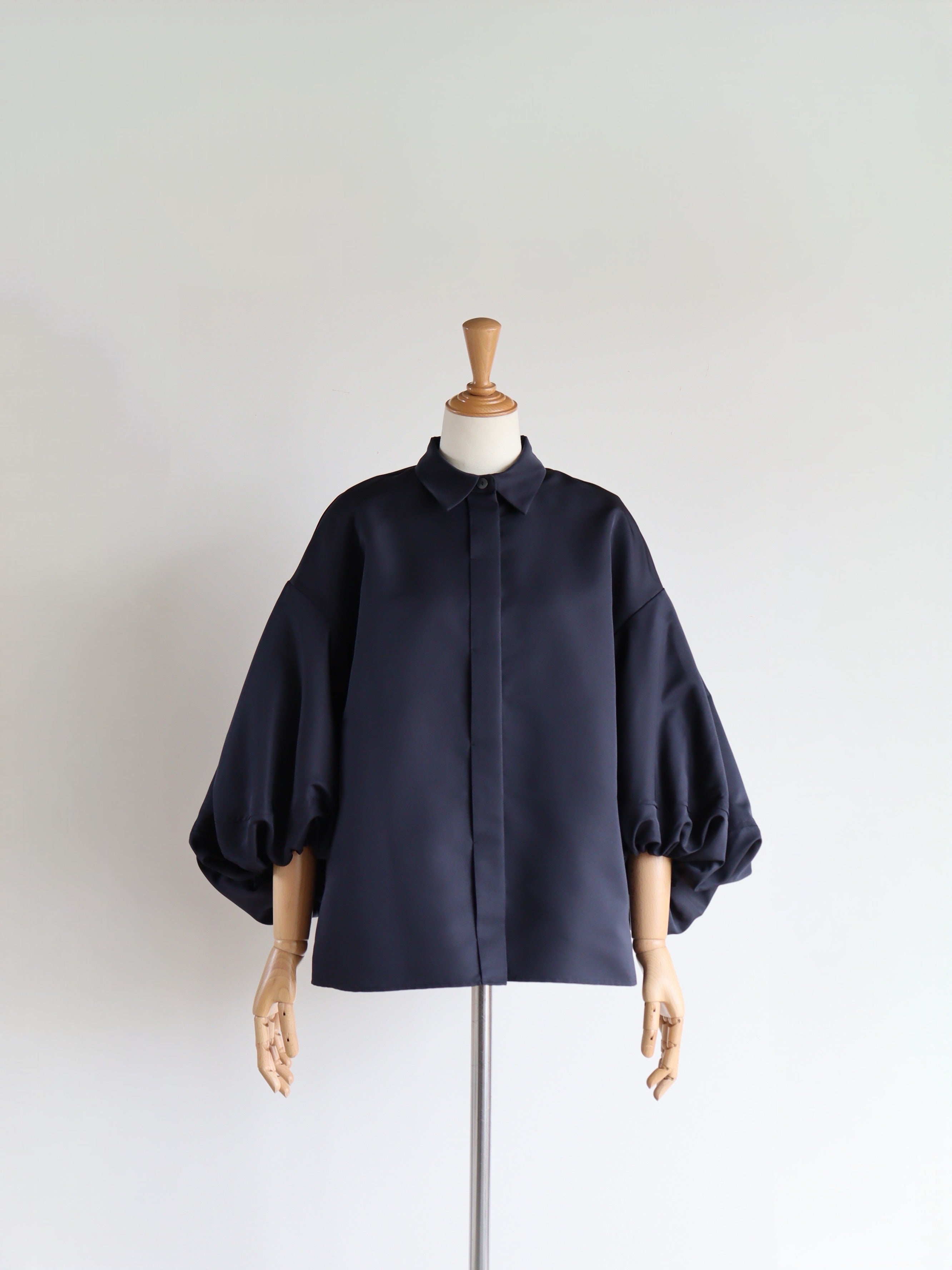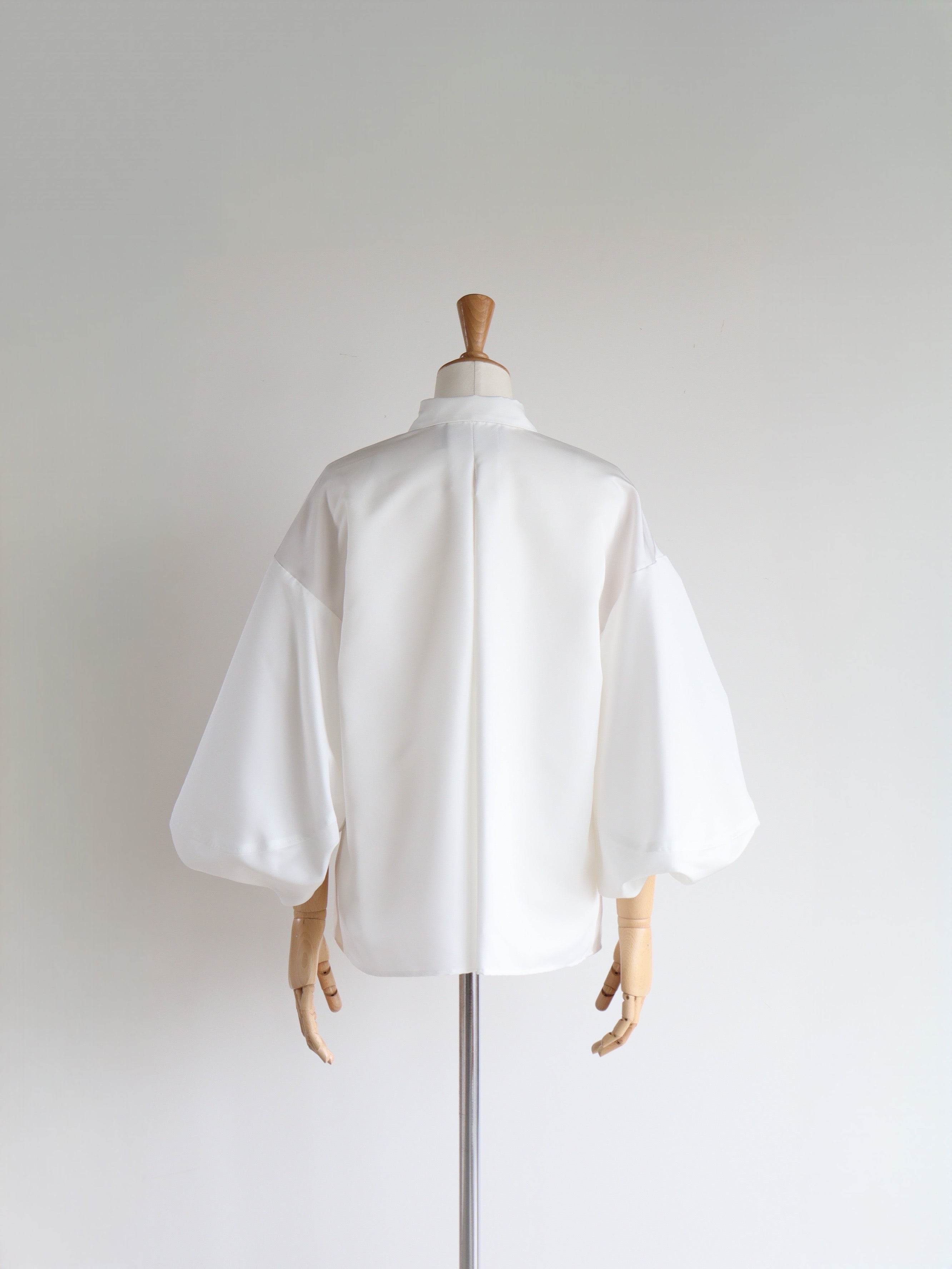 ハリのある生地で立体的な袖の膨らみを作り、構築的なデザインになっています。手首だけが出る9分丈の袖なので、手首がより、細く見えます。シワになりにくい素材で、手洗いも可能です。