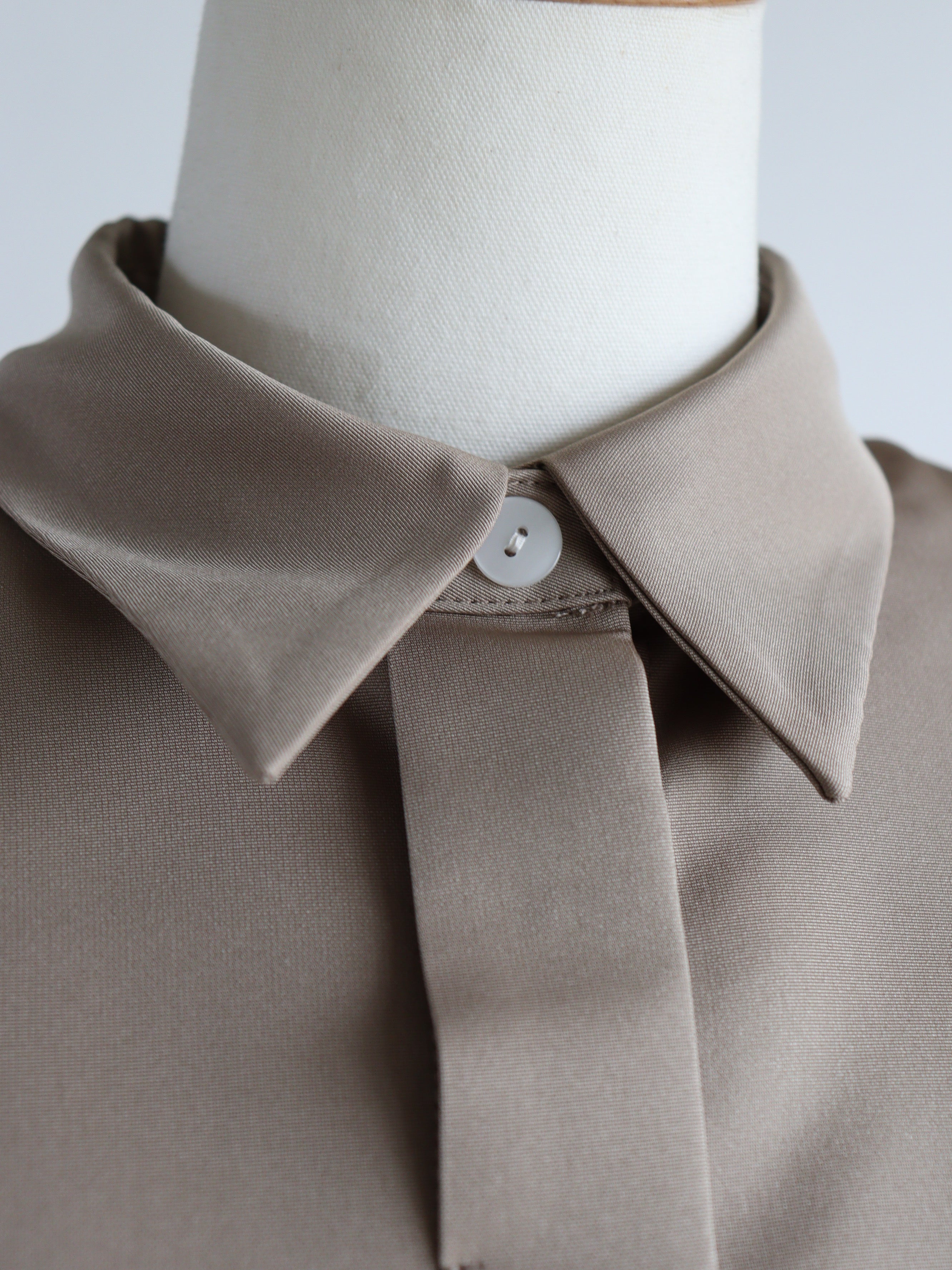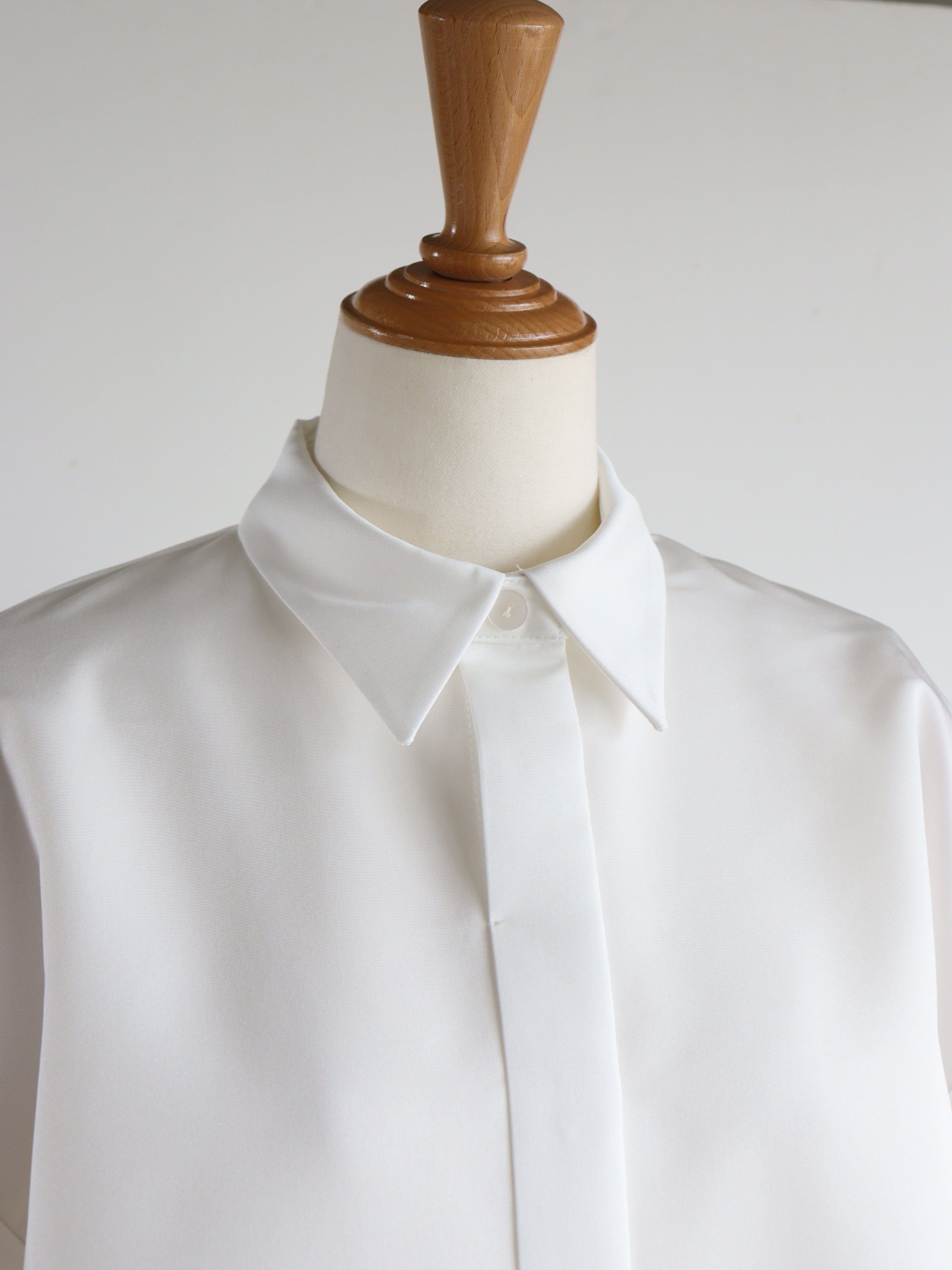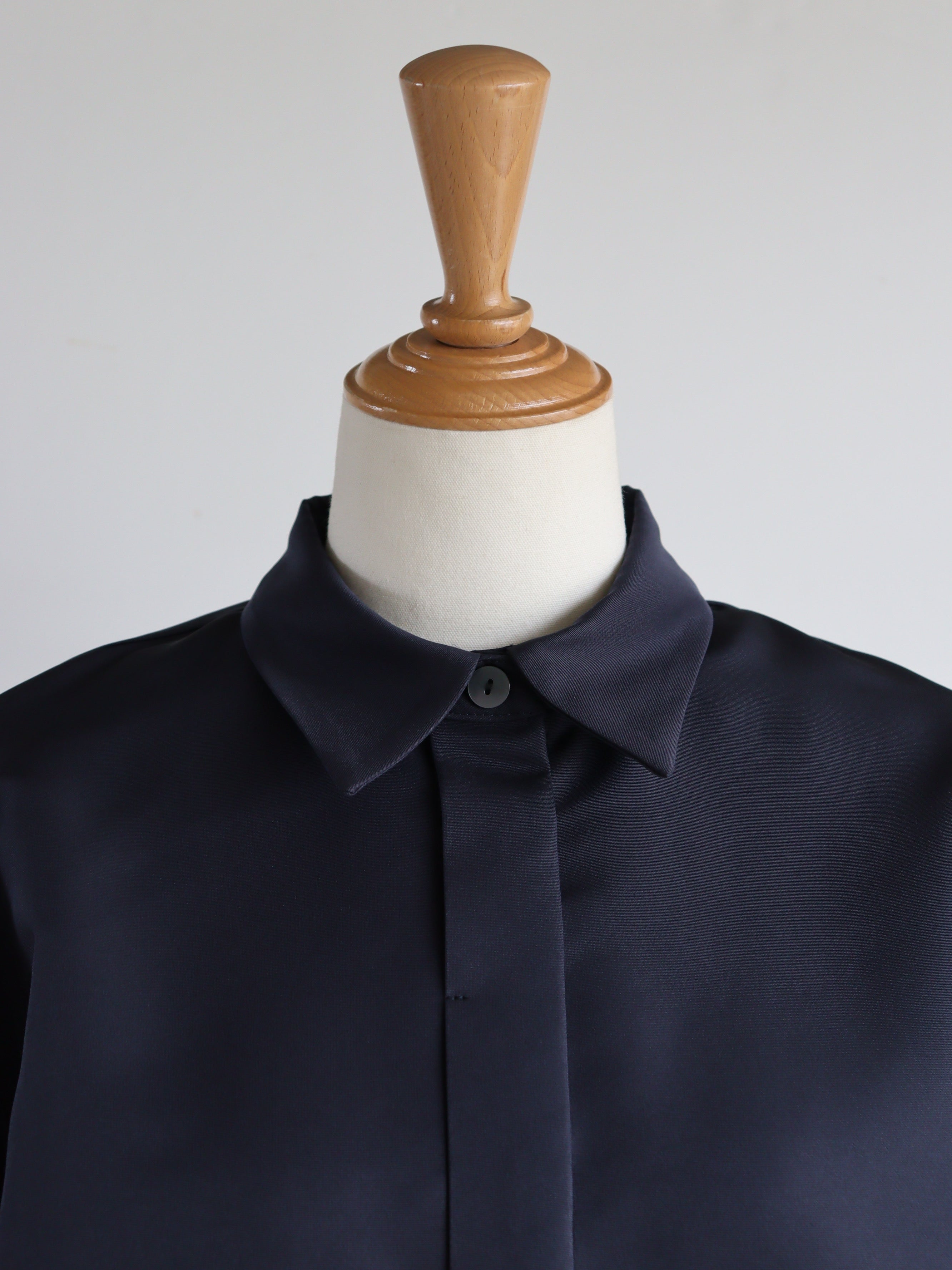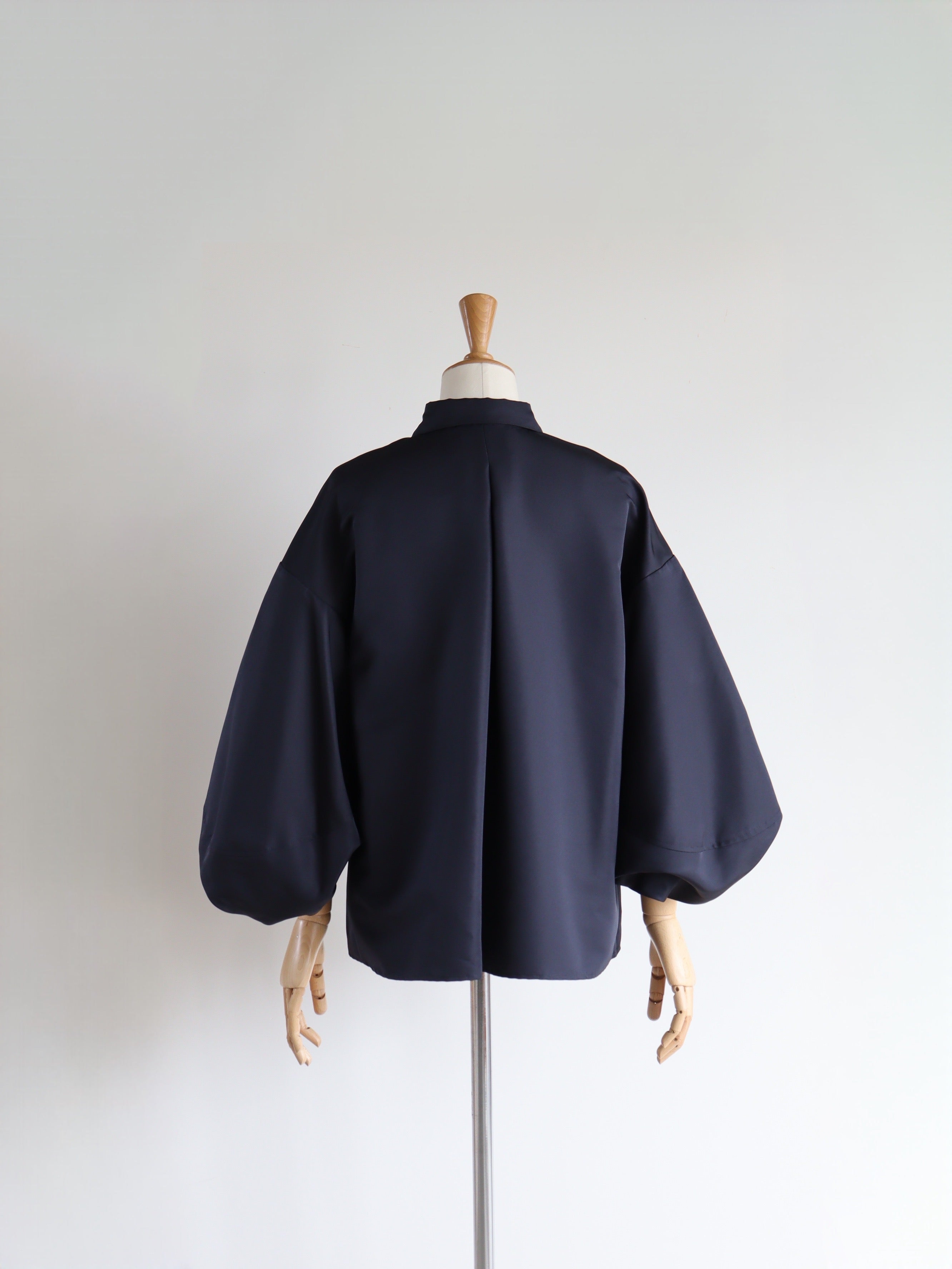 ハリのある生地で立体的な袖の膨らみを作り、構築的なデザインになっています。手首だけが出る9分丈の袖なので、手首がより、細く見えます。シワになりにくい素材で、手洗いも可能です。