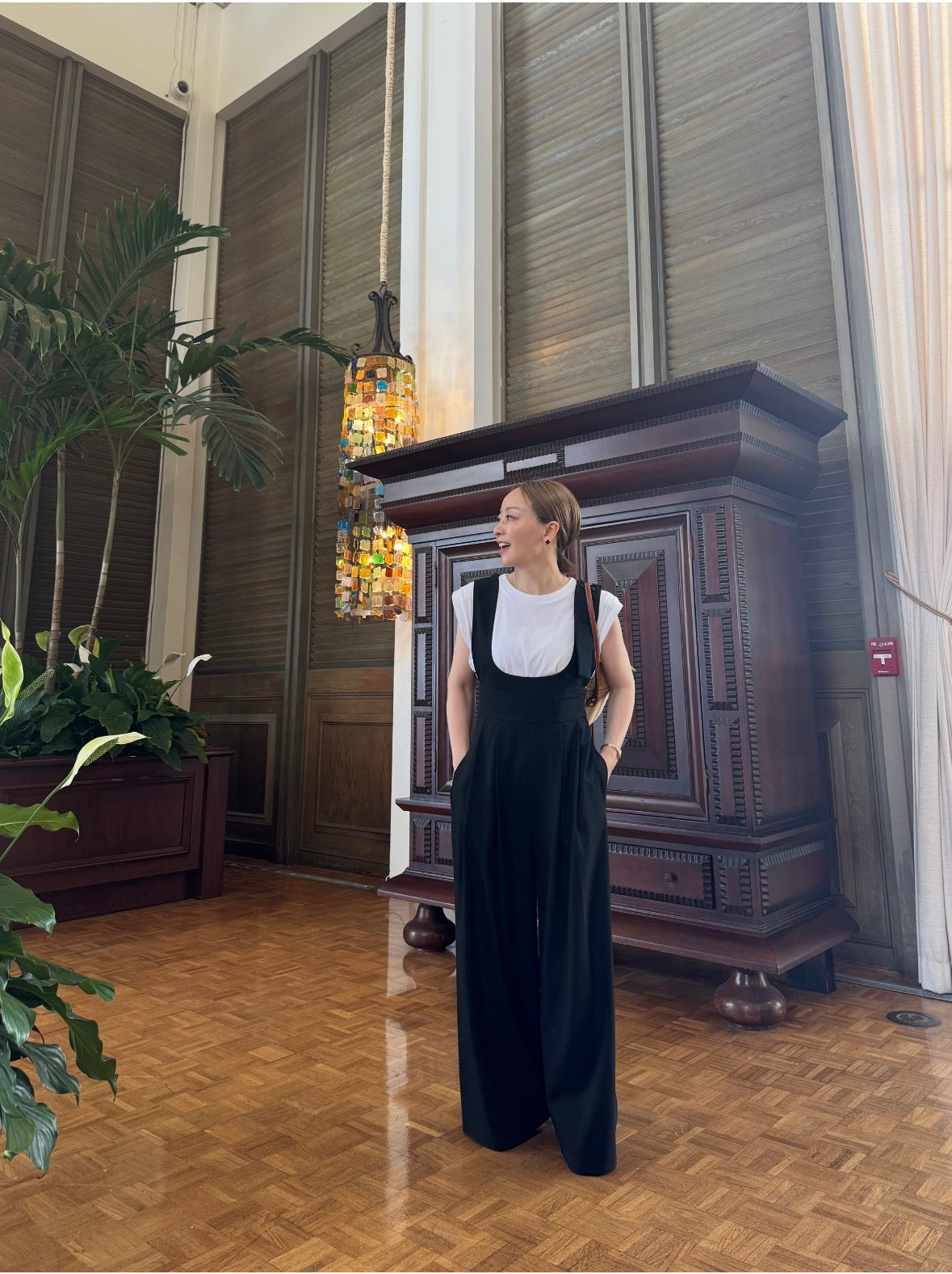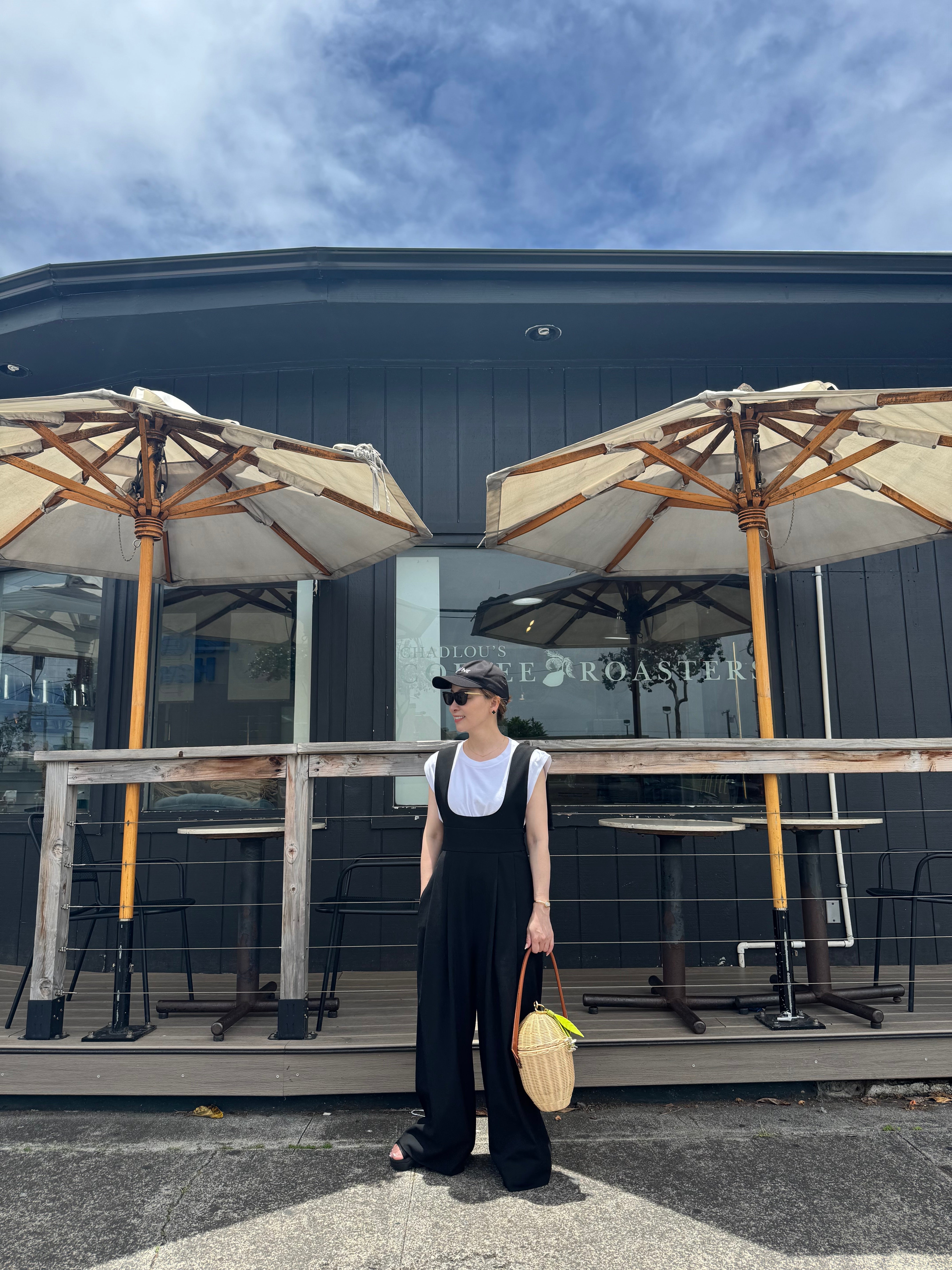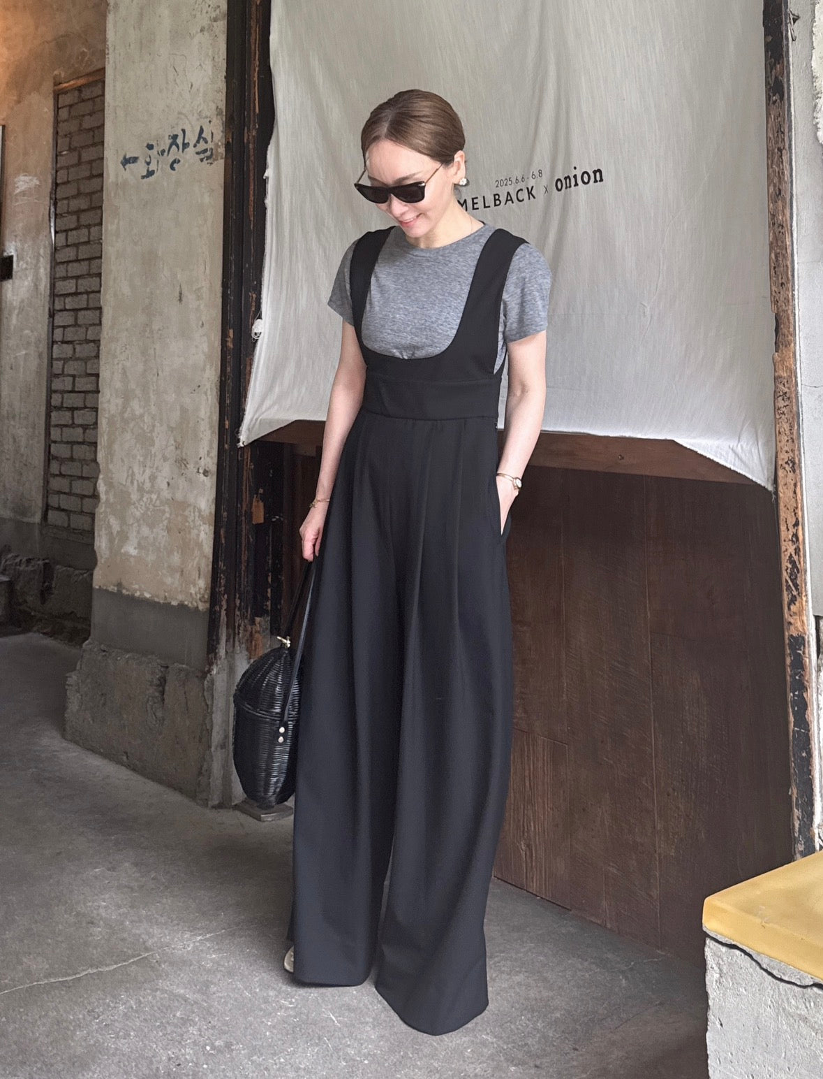 ハイウェストのワイドパンツで、脚長効果大のサロペット。